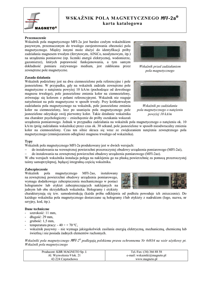 WSKAŹNIK POLA MAGNETYCZNEGO #-2a ® karta katalogowa Przeznaczenie Wskaźnik pola magnetycznego MFI-2a jest bardzo czułym wskaźnikiem pasywnym, przeznaczonym do trwałego zarejestrowania obecności pola magnetycznego. Między innymi może służyć do identyfikacji próby zadziałania magnesem trwałym (ferrytowym, AlNiCo, neodymowym, itp.) na urządzenia pomiarowe (np. liczniki energii elektrycznej, wodomierze, gazomierze), których poprawność funkcjonowania, a tym samym dokładność pomiaru zużywanego medium, jest zakłócana przez zewnętrzne pole magnetyczne. Wskaźnik przed zadziałaniem pola magnetycznego Zasada działania Wskaźnik podzielony jest na dwa ciemnozielone pola referencyjne i pole jasnozielone. W przypadku, gdy na wskaźnik zadziała zewnętrzne pole magnetyczne o natężeniu powyżej 10 kA/m (pochodzące od dowolnego magnesu trwałego), pole jasnozielone zmienia kolor na ciemnozielony, zrównując się kolorem z polami referencyjnymi. Wskaźnik nie reaguje natychmiast na pole magnetyczne w sposób trwały. Przy krótkotrwałym zadziałaniu pola magnetycznego na wskaźnik, pole jasnozielone zmienia Wskaźnik po zadziałaniu kolor na ciemnozielony, lecz po usunięciu pola magnetycznego pole pola magnetycznego o natężeniu jasnozielone odzyskuje swój pierwotny kolor. Takie działanie wskaźnika powyżej 10 kA/m ma charakter psychologiczny – zniechęcenie do próby oszukania wskazań urządzenia pomiarowego. Jednak w przypadku zadziałania na wskaźnik pola magnetycznego o natężeniu ok. 10 kA/m (próg zadziałania wskaźnika) przez czas ok. 30 sekund, pole jasnozielone w sposób nieodwracalny zmienia kolor na ciemnozielony. Czas ten silnie skraca się wraz ze zwiększaniem natężenia zewnętrznego pola magnetycznego (zmniejszaniem odległości magnesu trwałego od wskaźnika). Typy Wskaźnik pola magnetycznego MFI-2a produkowany jest w dwóch wersjach: - do instalowania na wewnętrznej powierzchni przezroczystej obudowy urządzenia pomiarowego (MFI-2ai), - do instalowania na zewnętrznej powierzchni obudowy urządzenia pomiarowego (MFI-2ao). W obu wersjach wskaźnika instalacja polega na naklejeniu go na płaską powierzchnię za pomocą przezroczystej taśmy samoprzylepnej, będącej integralną częścią wskaźnika. Zabezpieczenie Wskaźnik pola magnetycznego MFI-2ao, instalowany na zewnętrznej powierzchni obudowy urządzenia pomiarowego, wymaga dodatkowego zabezpieczenia mechanicznego w postaci hologramów lub etykiet zabezpieczających naklejanych na jednym lub obu skrzydełkach wskaźnika. Hologramy i etykiety charakteryzują się tzw. samodestrukcją (każda próba odklejenia od podłoża powoduje ich zniszczenie). Do każdego wskaźnika pola magnetycznego dostarczane są hologramy i/lub etykiety z nadrukiem (logo, nazwa, nr seryjny, kod, itp.). Dane techniczne - szerokość: 11 mm, - długość: 29 mm, - grubość: 1,5 mm, - temperatura pracy: - 40 ÷ + 70 ºC, - wskaźnik pasywny – nie wymaga jakiegokolwiek zasilania energią elektryczną, mechaniczną, chemiczną lub świetlną i nie posiada żadnych elementów ruchomych. Wskaźniki pola magnetycznego #-2® podlegają polskiemu prawu ochronnemu Nr 64834 na wzór użytkowy pt. Wskaźnik pola magnetycznego Producent: KBR MAGNETO Sp. J. Al. Wyzwolenia 9 lok. 21 42-224 Częstochowa Tel./Fax: (34) 366 88 58 e-mail: [email protected] www.magneto.pl
