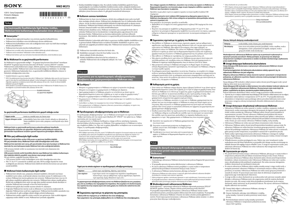 NWZ-W273 ©2013 Sony Corporation Printed in Malaysia 4-449-652-61(1) • Kulakiçi kulaklıklar kulağınızı tıkar. Bu nedenle, kulakiçi kulaklıklara güçlü bir basınç uygulandığında veya kulakiçi kulaklıklar kulaklarınızdan aniden çıktığında kulaklarınızın veya kulakiçi kulaklıkların zarar görme riski söz konusudur. Bu risk nedeniyle, Walkman'iniz takılıyken yüzme havuzuna atlama vb. gibi güçlü hareketlerde bulunmayın. Kullanım sonrası temizleme Türkçe Su Geçirmezlik Özellikleriyle İlgili Notlar (Lütfen, Walkman'inizi kullanmaya başlamadan önce okuyun) Senaryolar*1 • Walkman'inizi yağmurda koşarken veya yürüyüş yaparken kullanabilirsiniz. • Walkman'inizi terledikten sonra da kullanmaya devam edebilirsiniz. • Walkman'inizi kullandıktan sonra oda sıcaklığında temiz suyla veya hafif akan musluğun altında yıkayabilirsiniz.*2 • Walkman'inizi havuzda yüzerken kullanabilirsiniz.*3 *1 Walkman'inizi çevredeki sesleri duymamanızın tehlikeli olabileceği yerlerde kullanmayın. *2 “Kullanım sonrası temizleme” bölümünde verilen talimatlara uyun. *3 Walkman'inizi herkese açık veya özel yüzme havuzlarında kullanırken, tesisin kurallarına uyun. Bu Walkman'in su geçirmezlik performansı Bu Walkman'in su geçirmezlik özelliği*1, “Su girişine karşı koruma derecelerini” tanımlayan IEC60529 “Su girişine karşı koruma dereceleri (IP Kodu)” uyarınca IPX5/8*2'e denktir. Walkman'inizi yanlış kullanırsanız yangın, elektrik çarpması veya Walkman'inizin arızalanması riski ortaya çıkabilir. Walkman'inizi yüzme havuzunda kulağınıza takılıyken 2 m derinliği geçmeyin. Kullanmaya başlamadan önce, su geçirmezlik özelliklerini dikkatlice okuyun ve bütünüyle anladığınızdan emin olun. *1 Kulaklık bölümleri su geçirmez değildir. *2 IPX5 (Su püskürmesine karşı koruma dereceleri): Walkman'iniz 3 dakikadan daha uzun bir süre boyunca iç çapı 6,3 mm olan bir nozül kullanılarak yaklaşık 3 m'den herhangi bir yönde yaklaşık 12,5 l/dak debiyle doğrudan uygulanan su akışlarına maruz kalsa dahi çalışmaya devam eder. Ancak, bu durum kulaklık bölümleri için geçerli değildir. IPX8 (Sürekli su içerisinde bırakılmaya karşı koruma dereceleri): Walkman'iniz 30 dakika boyunca 2 m derinliğinde su içerisinde bırakılsa dahi çalışmaya devam eder. Kulaklık bölümleri (su geçirmez değildir) • Walkman'inize ter, kum veya toz bulaşırsa, derhal oda sıcaklığında temiz suyla veya hafif akan musluğun altında yıkayın. Walkman'inizi yıkadığınızda, fırça vb. kullanmadan elinizle yıkayın. Ancak, bu işlem sırasında kulaklık bölümlerini doğrudan güçlü su akışına maruz bırakmayın. Walkman'inizi bulaşık makinesinde veya ultrason banyosunda vb. yıkamayın. Deterjan, kimyasal madde veya ıslak mendil kullanmayın. • Walkman'inizi yıkadıktan sonra, Walkman üzerindeki suyu yumuşak bir bezle silin ve ardından Walkman'inizi iyi havalandırılan ve doğrudan güneş ışığı almayan bir yerde kurumaya bırakın. Walkman'inizi saç kurutma makinesinden sıcak hava üfleyerek kurutmayın. Aksi takdirde, deformasyon ve su geçirmezlik performansında azalma meydana gelebilir. • Kulaklık bölümleri (yukarıdaki şekle bakın) su geçirmez özellikte değildir, kulaklıkların içine su girmesi halinde Walkman’inizin ses kalitesi bozulabilir. Kulaklıklara su girerse, suyu çıkarmak için aşağıdaki prosedürleri takip edin. Walkman'inizi tamamen kuruyana kadar kullanmayın. Walkman'iniz üzerindeki nemi kuru bir bezle silin. Kulaklıkları yumuşak ve kuru bir beze hafifçe vurun. Bu işlemi yaklaşık 20 defa tekrarlayın. Kulakiçi kulaklıkların altına kuru bir bez yerleştirin ve ardından Walkman'inizi oda sıcaklığında yaklaşık 2 ila 3 saat bırakın. Ελληνικά Σημειώσεις για τις προδιαγραφές αδιαβροχοποίησης (Διαβάστε πριν χρησιμοποιήσετε το Walkman σας) Uygun sıvılar : temiz su, musluk suyu, ter, havuz suyu Uygun olmayan sıvılar : y ukarıdakiler hariç tüm sıvılar (örnek: sabunlu su, deterjanlı su, banyo maddeleri içeren sular, şampuan, sıcak kaynak suyu, deniz suyu vb.) Walkman'inizin su geçirmezlik performansı yukarıda açıklanan koşullarda gerçekleştirilen ölçümler için geçerlidir. Müşterinin yanlış kullanımı neticesi su girmesinden kaynaklanan arızaların garanti kapsamına girmediğine dikkat edin. Pilin şarj edilmesiyle ilgili notlar Walkman'inizle birlikte verilen USB yuvası su geçirmez özellikte değildir. Pili şarj etmeden önce, Walkman'inizin ıslak olmadığından emin olun. Σημειώσεις σχετικά με τη χρήση του Walkman • Μην βυθίζετε το Walkman σε σαπουνόνερο, σαμπουάν, χημικά, νερό με καθαριστικά ή αφρόλουτρο, νερό θερμής ιαματικής πηγής, θαλασσινό νερό, κτλ. και μην ρίχνετε αυτά τα υγρά επάνω στο Walkman. Μην αφήνετε ξένα σώματα, όπως άμμο ή βρομιές, να παραμένουν επάνω στο Walkman. Εάν επάνω στο Walkman, υπάρχουν ξένα σώματα, ξεπλύνετέ το αμέσως με γλυκό νερό σε θερμοκρασία δωματίου ή κάτω από τη βρύση με χαμηλή ένταση και στεγνώστε το Walkman χρησιμοποιώντας ένα μαλακό, στεγνό πανί. • Μην εκθέτετε το Walkman σε νερό βρύσης που τρέχει με μεγάλη πίεση, κτλ. • Μην ρίχνετε απευθείας ζεστό νερό επάνω στο Walkman και μην ρίχνετε ζεστό αέρα από πιστολάκι μαλλιών, κτλ. απευθείας ε
