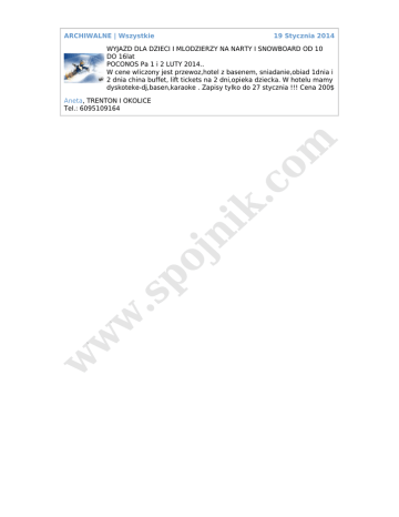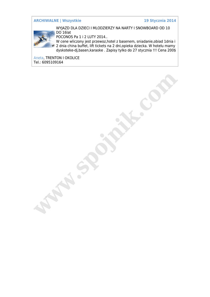 ARCHIWALNE | Wszystkie 19 Stycznia 2014 WYJAZD DLA DZIECI I MLODZIERZY NA NARTY I SNOWBOARD OD 10 DO 16lat POCONOS Pa 1 i 2 LUTY 2014.. W cene wliczony jest przewoz,hotel z basenem, sniadanie,obiad 1dnia i 2 dnia china buffet, lift tickets na 2 dni,opieka dziecka. W hotelu mamy dyskoteke-dj,basen,karaoke . Zapisy tylko do 27 stycznia !!! Cena 200$ w w w .s po jn ik .c o m Aneta, TRENTON I OKOLICE Tel.: 6095109164