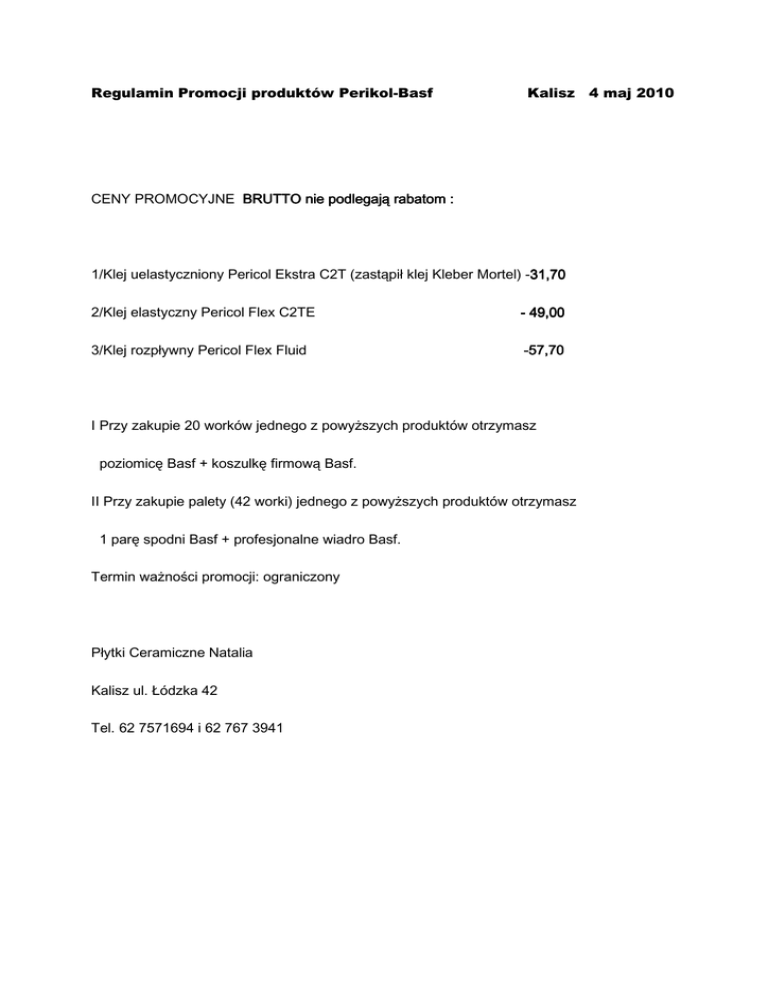 Regulamin Promocji produktów Perikol-Basf Kalisz 4 maj 2010 CENY PROMOCYJNE BRUTTO nie podlegają rabatom : 1/Klej uelastyczniony Pericol Ekstra C2T (zastąpił klej Kleber Mortel) -31,70 31,70 2/Klej elastyczny Pericol Flex C2TE - 49,00 3/Klej rozpływny Pericol Flex Fluid -57,70 I Przy zakupie 20 worków jednego z powyższych produktów otrzymasz poziomicę Basf + koszulkę firmową Basf. II Przy zakupie palety (42 worki) jednego z powyższych produktów otrzymasz 1 parę spodni Basf + profesjonalne wiadro Basf. Termin ważności promocji: ograniczony Płytki Ceramiczne Natalia Kalisz ul. Łódzka 42 Tel. 62 7571694 i 62 767 3941