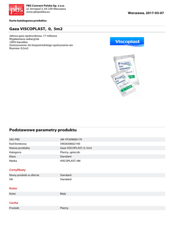 PBS Connect Polska Sp. z o.o. ul. Annopol 3, 03-236 Warszawa www.pbspolska.eu Karta katalogowa produktu: Gaza VISCOPLAST, 0, 5m2 Jałowa gaza opatrunkowa, 17-nitkowa Wyjaławiana radiacyjnie 100% bawełna Zastosowanie: do bezpośredniego opatrywania ran Rozmiar: 0,5m2 Podstawowe parametry produktu SKU PBS 3M-YP209000170 Kod kreskowy 5902658662140 Nazwa produktu Gaza VISCOPLAST, 0, 5m2 Kategoria Plastry, apteczki Klasa Standard Marka VISCOPLAST-3M Certyfikaty Nowy produkt w ofercie Standard Hit Standard Kolor Kolor Biały Cecha Produkt Plastry Warszawa, 2017-03-07 PBS Connect Polska Sp. z o.o. ul. Annopol 3, 03-236 Warszawa www.pbspolska.eu Karta katalogowa produktu cd. Gaza VISCOPLAST, 0, 5m2 Podstawowe parametry produktu Typ Gaza W ofercie od 2014-01 Wspólny słownik zamówień CPV 33141114-2 Jednostki logistyczne Opakowanie 1 60 op Warszawa, 2017-03-07