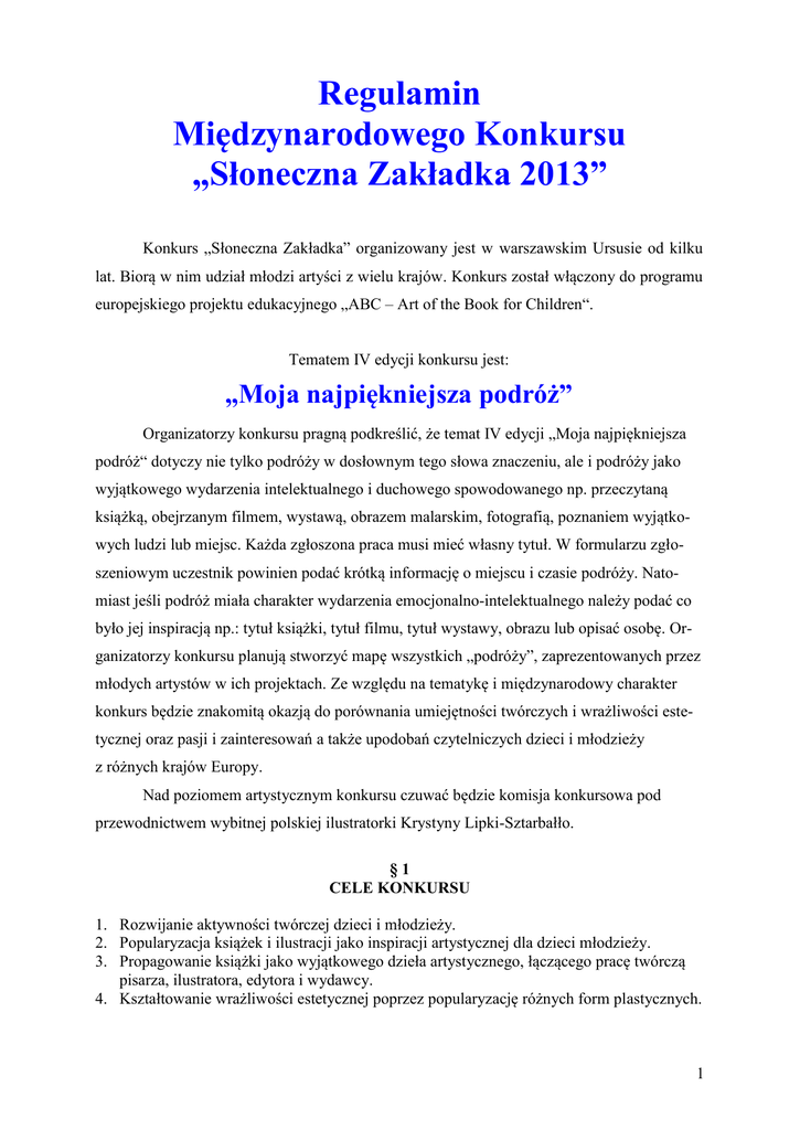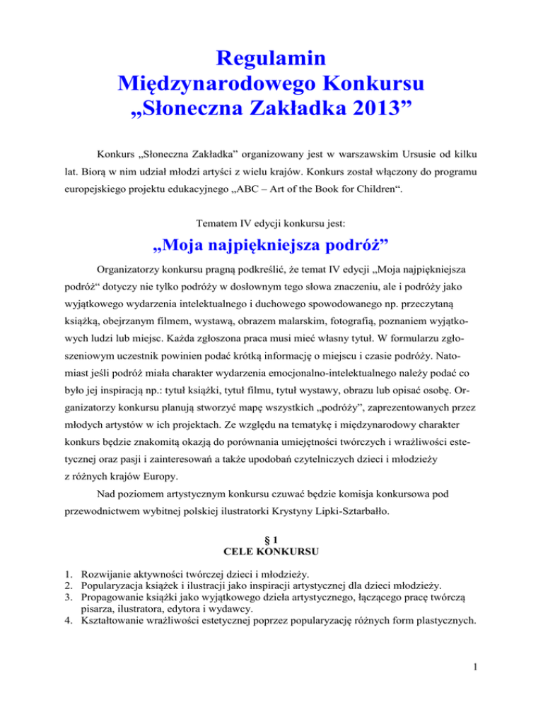 Regulamin Międzynarodowego Konkursu „Słoneczna Zakładka 2013” Konkurs „Słoneczna Zakładka” organizowany jest w warszawskim Ursusie od kilku lat. Biorą w nim udział młodzi artyści z wielu krajów. Konkurs został włączony do programu europejskiego projektu edukacyjnego „ABC – Art of the Book for Children“. Tematem IV edycji konkursu jest: „Moja najpiękniejsza podróż” Organizatorzy konkursu pragną podkreślić, że temat IV edycji „Moja najpiękniejsza podróż“ dotyczy nie tylko podróży w dosłownym tego słowa znaczeniu, ale i podróży jako wyjątkowego wydarzenia intelektualnego i duchowego spowodowanego np. przeczytaną książką, obejrzanym filmem, wystawą, obrazem malarskim, fotografią, poznaniem wyjątkowych ludzi lub miejsc. Każda zgłoszona praca musi mieć własny tytuł. W formularzu zgłoszeniowym uczestnik powinien podać krótką informację o miejscu i czasie podróży. Natomiast jeśli podróż miała charakter wydarzenia emocjonalno-intelektualnego należy podać co było jej inspiracją np.: tytuł książki, tytuł filmu, tytuł wystawy, obrazu lub opisać osobę. Organizatorzy konkursu planują stworzyć mapę wszystkich „podróży”, zaprezentowanych przez młodych artystów w ich projektach. Ze względu na tematykę i międzynarodowy charakter konkurs będzie znakomitą okazją do porównania umiejętności twórczych i wrażliwości estetycznej oraz pasji i zainteresowań a także upodobań czytelniczych dzieci i młodzieży z różnych krajów Europy. Nad poziomem artystycznym konkursu czuwać będzie komisja konkursowa pod przewodnictwem wybitnej polskiej ilustratorki Krystyny Lipki-Sztarbałło. §1 CELE KONKURSU 1. Rozwijanie aktywności twórczej dzieci i młodzieży. 2. Popularyzacja książek i ilustracji jako inspiracji artystycznej dla dzieci młodzieży. 3. Propagowanie książki jako wyjątkowego dzieła artystycznego, łączącego pracę twórczą pisarza, ilustratora, edytora i wydawcy. 4. Kształtowanie wrażliwości estetycznej poprzez popularyzację różnych form plastycznych. 1 §2 ZAŁOŻENIA ORGANIZACYJNE 1. Organizatorami konkursu „Słoneczna Zakładka 2013” są: Urząd Dzielnicy Ursus m.st. Warszawy, Biblioteka Publiczna w Dzielnicy Ursus oraz Zespół Szkół Nr 80 z Oddziałami Integracyjnymi. Współorganizatorami konkursu zagranicą są: Institut fur Jugendliteratur, Wiedeń, Austria; Lesezentrum Steiermark, Grazu, Austria; Prijatel na Deteto, Sofia, Bułgaria; Regionalna Biblioteka „Luben Karavelov” i Rusenska Hudożestwienna Galeria, Ruse, Bułgaria; Regionalna Biblioteka, Warna, Bułgaria; Ard Rí Community National School, Navan, Irlandia; Instituto Politecnico de Castelo Branco, Portugalia; Scala Nr 97, Bukareszt, Rumunia; Medijsko Obrazowanie Cantre, Belgrad, Serbia; Kültür ve Turizm Bakanlığı, Ankara, Turcja. 2. Konkurs przeznaczony jest dla dzieci i młodzieży od 5 do 19 lat. 3. Każdy uczestnik może zgłosić do konkursu jedną, samodzielnie wykonaną pracę wcześniej nie publikowaną i nie zgłaszaną do innych konkursów. 4. Do projektu zakładki powinien być dołączony formularz zgłoszeniowy, starannie wypełniony na komputerze lub literami drukowanymi. Formularze dostępne są w placówkach Biblioteki Publicznej w Ursusie lub na stronach internetowych www.bpursus.waw.pl 5. Projekty mogą być wykonane z różnych materiałów i w dowolnej technice (np.: ołówek, kredka, pastele, farby plakatowe, wycinanki, wyklejanki, decoupage, grafika, wydzieranki itp.). 6. Format projektu nie może przekraczać wymiarów arkusza A-1 (dł. 84,1 cm, szer. 59,4 cm) i głębokości 60 cm. 7. Projekty laureatów zostaną elektronicznie przekonwertowane na tradycyjne zakładki do książek i wydrukowane. Dzięki temu z jednego projektu powstaną dwie prace artystyczne o różnorodnych walorach estetycznych. 8. Zgłoszenie uczestnika do konkursu oznacza uzyskanie przez instytucję zgłaszającą zgody rodziców lub opiekunów uczestnika na udział w konkursie. 9. Udział w konkursie oznacza udzielenie organizatorom konkursu prawa do: druku w dowolnej liczbie publikacji i w dowolnym nakładzie, umieszczenia w Internecie, a także prezentowania prac na wystawach krajowych i zagranicznych oraz w celach reklamowych (w prasie, w telewizji, w katalogach i na plakatach). 10. Osoby dostarczające prace konkursowe wyrażają zgodę na przetwarzanie przez organizatora konkursu swoich danych osobowych. 11. Prace zgłoszone do konkursu nie będą zwracane autorom. 12. Nadesłanie pracy na konkurs jest jednoznaczne ze złożeniem deklaracji o akceptacji regulaminu konkursu „Słoneczna Zakładka 2013”. §3 WARUNKI KONKURSU 1. Konkurs zostanie przeprowadzony w następujących kategoriach: Kategoria narodowa (ogólna) (dotyczy uczestników ze szkół i przedszkoli oraz instytucji oświatowo-kulturalnych o profilu ogólnym danego kraju) - grupa wiekowa 5-6 lat - grupa wiekowa 7-8 lat 2 - grupa wiekowa 9-10 lat - grupa wiekowa 11-13 lat - grupa wiekowa 14-16 lat Kategoria generalna (ogólna) (dotyczy projektów nagrodzonych I, II, III miejscem w kategorii narodowej (ogólnej), w danej grupie wiekowej, których autorami są osoby ze szkół i przedszkoli oraz instytucji oświatowo-kulturalnych o profilu ogólnym) - grupa wiekowa 5-6 lat - grupa wiekowa 7-8 lat - grupa wiekowa 9-10 lat - grupa wiekowa 11-13 lat - grupa wiekowa 14-16 lat Kategoria narodowa dla uczestników ze szkól i ośrodków artystycznych (projekty uczestników wyłącznie ze szkół lub ośrodków artystycznych danego kraju) - grupa wiekowa 9-10 lat - grupa wiekowa 11-13 lat - grupa wiekowa 14-16 lat - grupa wiekowa 17-19 lat Kategoria generalna dla uczestników ze szkól i ośrodków artystycznych (projekty uczestników wyłącznie ze szkół lub ośrodków artystycznych) - grupa wiekowa 9-10 lat - grupa wiekowa 11-13 lat - grupa wiekowa 14-16 lat - grupa wiekowa 17-19 lat (Jury może wprowadzić zmiany w kategoriach w zależno