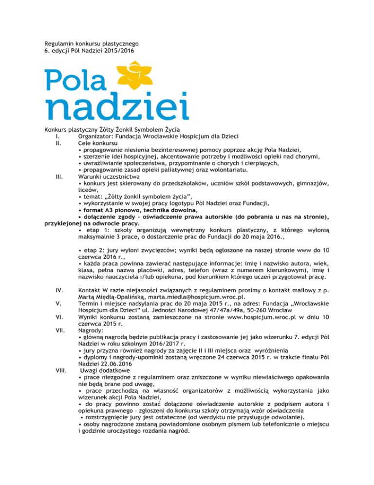 Regulamin Konkursu plastycznego Pola Nadziei 2016