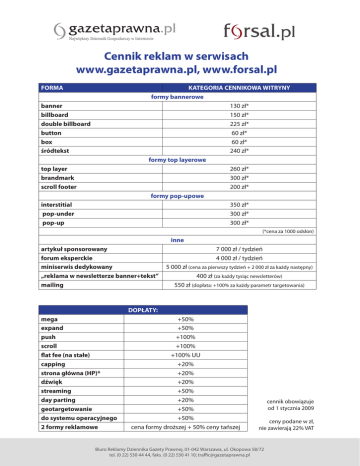 Cennik reklam w serwisach www.gazetaprawna.pl, www.forsal.pl FORMA KATEGORIA CENNIKOWA WITRYNY formy bannerowe 130 zł* 150 zł* 225 zł* 60 zł* 60 zł* 240 zł* formy top layerowe 260 zł* 300 zł* 200 zł* formy pop-upowe 350 zł* 300 zł* 300 zł* banner billboard double billboard button box śródtekst top layer brandmark scroll footer interstitial pop-under pop-up (*cena za 1000 odsłon) inne artykuł sponsorowany forum eksperckie miniserwis dedykowany „reklama w newsletterze banner+tekst” mailing 7 000 zł / tydzień 4 000 zł / tydzień 5 000 zł (cena za pierwszy tydzień + 2 000 zł za każdy następny) 400 zł (za każdy tysiąc newsletterów) 550 zł (dopłata: +100% za każdy parametr targetowania) DOPŁATY: mega expand push scroll flat fee (na stałe) capping strona główna (HP)* dźwięk streaming day parting geotargetowanie do systemu operacyjnego 2 formy reklamowe +50% +50% +100% +100% +100% UU +20% +20% +20% +50% +20% +50% +50% cena formy droższej + 50% ceny tańszej cennik obowiązuje od 1 stycznia 2009 ceny podane w zł, nie zawierają 22% VAT Biuro Reklamy Dziennika Gazety Prawnej, 01-042 Warszawa, ul. Okopowa 58/72 tel. (0 22) 530 44 44, faks. (0 22) 530 41 10; [email protected] Wymagania techniczne reklam w serwisach internetowych Wymagania techniczne WAGA WYMIARY FORMA FORMAT formy bannerowe banner billboard double billboard do 15kB do 35kB do 55kB button do 15kB box śródtekst formy top layerowe top layer brandmark scroll footer formy pop-upowe interstitial pop-under pop-up GIF, JPG, SWF GIF, JPG, SWF GIF, JPG, SWF do 15kB do 35kB 468x60px 750x100px 750x200px 120x45px, (180x45px)* 300x45px 300x250px do 55kB do 25kB do 25kB 400x300px 300x300px 1600x50px SWF GIF, SWF GIF, JPG, SWF do 25kB do 30kB do 25kB pełny ekran 400x400px 300x300px GIF, JPG, SWF GIF, JPG, SWF GIF, JPG, SWF GIF, JPG, SWF GIF, JPG, SWF GIF, JPG, SWF *wymiar uzależniony od miejsca emisji inne do 40kB artykuł sponsorowany forum eksperckie miniserwis dedykowany 190x45px GIF, JPG, SWF do 5 000 znaków, max 3 grafiki zabezpieczenie eksperta - po stronie kupującego dostarczenie materiałów do miniserwisu leży po stronie kupującego reklama w newsletterze – banner + tekst do 35kB mailing do 30 kB 600 x 100 px do 250 znaków tekstu ---- Biuro Reklamy Dziennika Gazety Prawnej, 01-042 Warszawa, ul. Okopowa 58/72 tel. (0 22) 530 44 44, faks. (0 22) 530 41 10; [email protected] GIF, JPG HTML