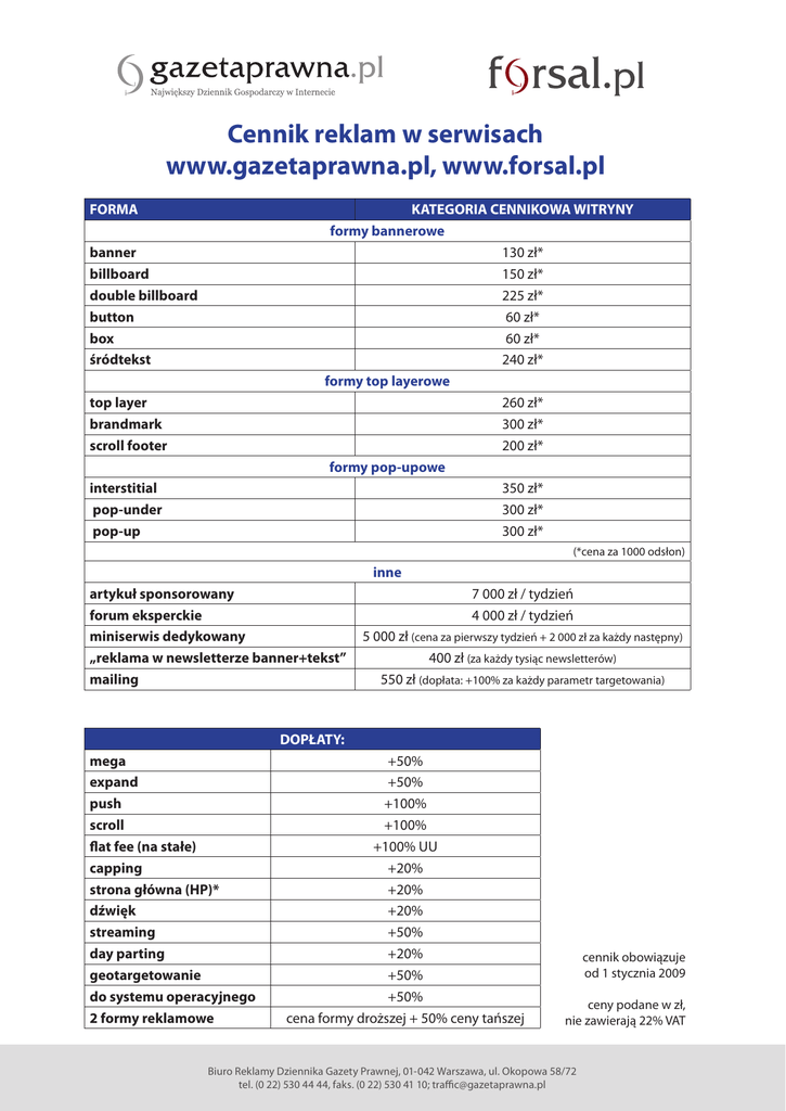 Cennik reklam w serwisach www.gazetaprawna.pl, www.forsal.pl