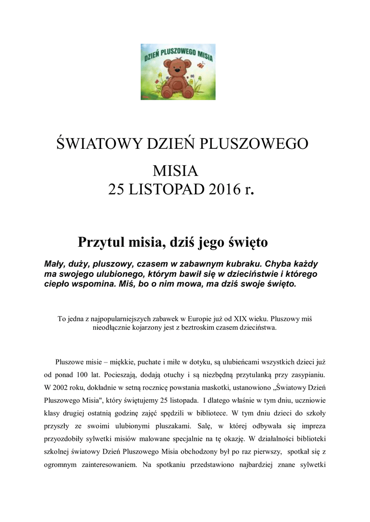 ŚWIATOWY DZIEŃ PLUSZOWEGO MISIA 25 LISTOPAD 2016 r. Przytul misia, dziś jego święto Mały, duży, pluszowy, czasem w zabawnym kubraku. Chyba każdy ma swojego ulubionego, którym bawił się w dzieciństwie i którego ciepło wspomina. Miś, bo o nim mowa, ma dziś swoje święto. To jedna z najpopularniejszych zabawek w Europie już od XIX wieku. Pluszowy miś nieodłącznie kojarzony jest z beztroskim czasem dzieciństwa. Pluszowe misie – miękkie, puchate i miłe w dotyku, są ulubieńcami wszystkich dzieci już od ponad 100 lat. Pocieszają, dodają otuchy i są niezbędną przytulanką przy zasypianiu. W 2002 roku, dokładnie w setną rocznicę powstania maskotki, ustanowiono „Światowy Dzień Pluszowego Misia", który świętujemy 25 listopada. I dlatego właśnie w tym dniu, uczniowie klasy drugiej ostatnią godzinę zajęć spędzili w bibliotece. W tym dniu dzieci do szkoły przyszły ze swoimi ulubionymi pluszakami. Salę, w której odbywała się impreza przyozdobiły sylwetki misiów malowane specjalnie na tę okazję. W działalności biblioteki szkolnej światowy Dzień Pluszowego Misia obchodzony był po raz pierwszy, spotkał się z ogromnym zainteresowaniem. Na spotkaniu przedstawiono najbardziej znane sylwetki misiów - bohaterów literackich, a także zapoznano wszystkich z historią powstania tego święta w formie prezentacji multimedialnej. W ramach ogólnopolskiej akcji „ Cała Polska Czyta Dzieciom” pani bibliotekarka przeczytała dzieciom fragment lektury pt. ”Kubuś Puchatek”. Była muzyka, zabawa i pląsy. Dzieci uczestniczyły w wielu konkursach np.: „Wyjadanie miodku„ . Zadanie polegało na jak najszybszym zjedzeniu miodu z talerzyka tylko za pomocą języka, bez pomocy rąk. „Rysuję misia” Gra parami. Każdy zawodnik wybierał sobie spośród kolegów- podpowiadacza, czyli osobę , która widzi i podpowiada jak rysować, jakiego flamastra użyć. Zawodnik miał za zadanie narysować misia z zasłoniętymi oczyma. Dzieciom podobała się nasza impreza. Na pamiątkę wszyscy zrobiliśmy zdjęcia ze swoimi przyjacielami. Na podsumowanie zajęć dzieci otrzymały dyplomy za udział we wspólnej zabawie. Dzień Pluszowego Misia był okazją do promocji czytelnictwa i jednocześnie świetnej zabawy. . . rok szkolny 2016-2017 DLA uczniów klasy II Za udział we wspólnej zabawie zorganizowanej z okazji Organizatorzy : Katarzyna Gryzło- Kmak Małgorzata Dargiewicz