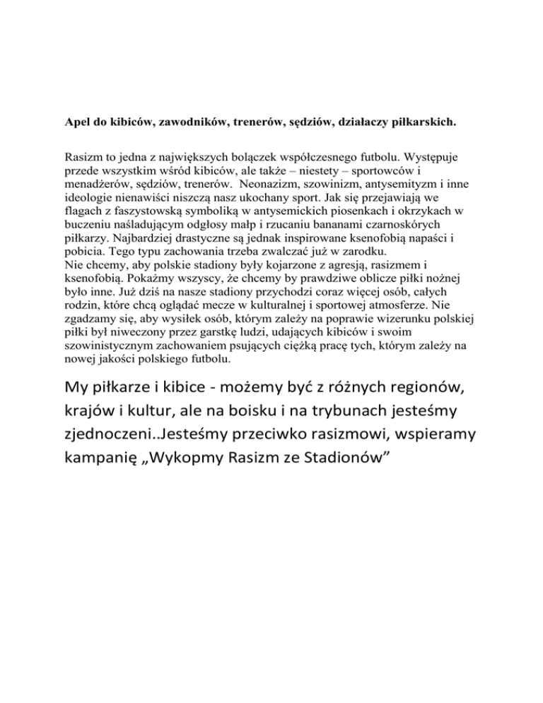 Apel do kibiców, zawodników, trenerów, sędziów, działaczy piłkarskich. Rasizm to jedna z największych bolączek współczesnego futbolu. Występuje przede wszystkim wśród kibiców, ale także – niestety – sportowców i menadżerów, sędziów, trenerów. Neonazizm, szowinizm, antysemityzm i inne ideologie nienawiści niszczą nasz ukochany sport. Jak się przejawiają we flagach z faszystowską symboliką w antysemickich piosenkach i okrzykach w buczeniu naśladującym odgłosy małp i rzucaniu bananami czarnoskórych piłkarzy. Najbardziej drastyczne są jednak inspirowane ksenofobią napaści i pobicia. Tego typu zachowania trzeba zwalczać już w zarodku. Nie chcemy, aby polskie stadiony były kojarzone z agresją, rasizmem i ksenofobią. Pokażmy wszyscy, że chcemy by prawdziwe oblicze piłki nożnej było inne. Już dziś na nasze stadiony przychodzi coraz więcej osób, całych rodzin, które chcą oglądać mecze w kulturalnej i sportowej atmosferze. Nie zgadzamy się, aby wysiłek osób, którym zależy na poprawie wizerunku polskiej piłki był niweczony przez garstkę ludzi, udających kibiców i swoim szowinistycznym zachowaniem psujących ciężką pracę tych, którym zależy na nowej jakości polskiego futbolu. My piłkarze i kibice - możemy być z różnych regionów, krajów i kultur, ale na boisku i na trybunach jesteśmy zjednoczeni..Jesteśmy przeciwko rasizmowi, wspieramy kampanię „Wykopmy Rasizm ze Stadionów”