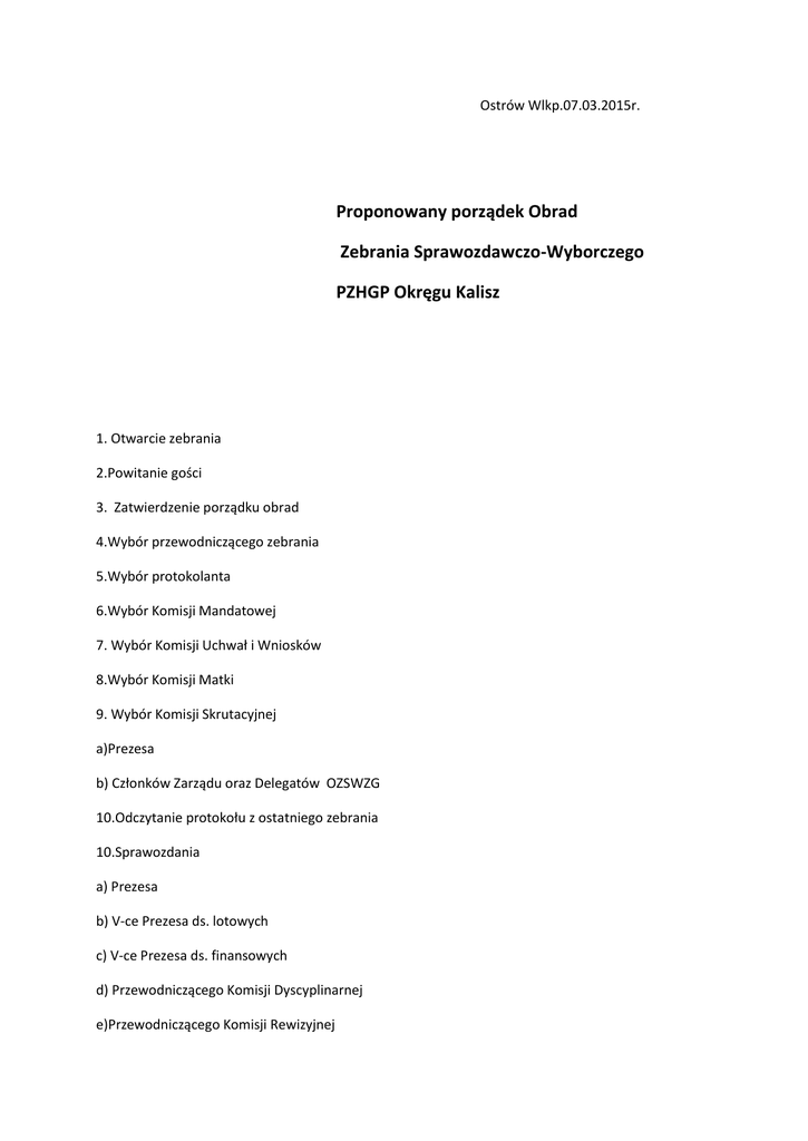 Ostrów Wlkp.07.03.2015r. Proponowany porządek Obrad Zebrania Sprawozdawczo-Wyborczego PZHGP Okręgu Kalisz 1. Otwarcie zebrania 2.Powitanie gości 3. Zatwierdzenie porządku obrad 4.Wybór przewodniczącego zebrania 5.Wybór protokolanta 6.Wybór Komisji Mandatowej 7. Wybór Komisji Uchwał i Wniosków 8.Wybór Komisji Matki 9. Wybór Komisji Skrutacyjnej a)Prezesa b) Członków Zarządu oraz Delegatów OZSWZG 10.Odczytanie protokołu z ostatniego zebrania 10.Sprawozdania a) Prezesa b) V-ce Prezesa ds. lotowych c) V-ce Prezesa ds. finansowych d) Przewodniczącego Komisji Dyscyplinarnej e)Przewodniczącego Komisji Rewizyjnej 11. Dyskusja nad sprawozdaniami 12.Udzielenie absolutorium Zarządowi 13. Przedstawienie preliminarzu budżetowego na 2015r 14. Uchwalenie budżetu na 2015r 15.Wybór Prezesa Zarządu Okręgu Kalisz 16.Wybór Członków Zarządu 17.Wybór Członków Komisji Rewizyjnej 18. Wybór Członków Komisji Dyscyplinarnej 19. Wybór delegatów na WZSWZG 20.Przedstawienie uchwał i wniosków oraz ich zatwierdzenie 21.Wolne głosy i wnioski 23. Zakończenie zebrania Ireneusz Zwierz Prezes Zarządu