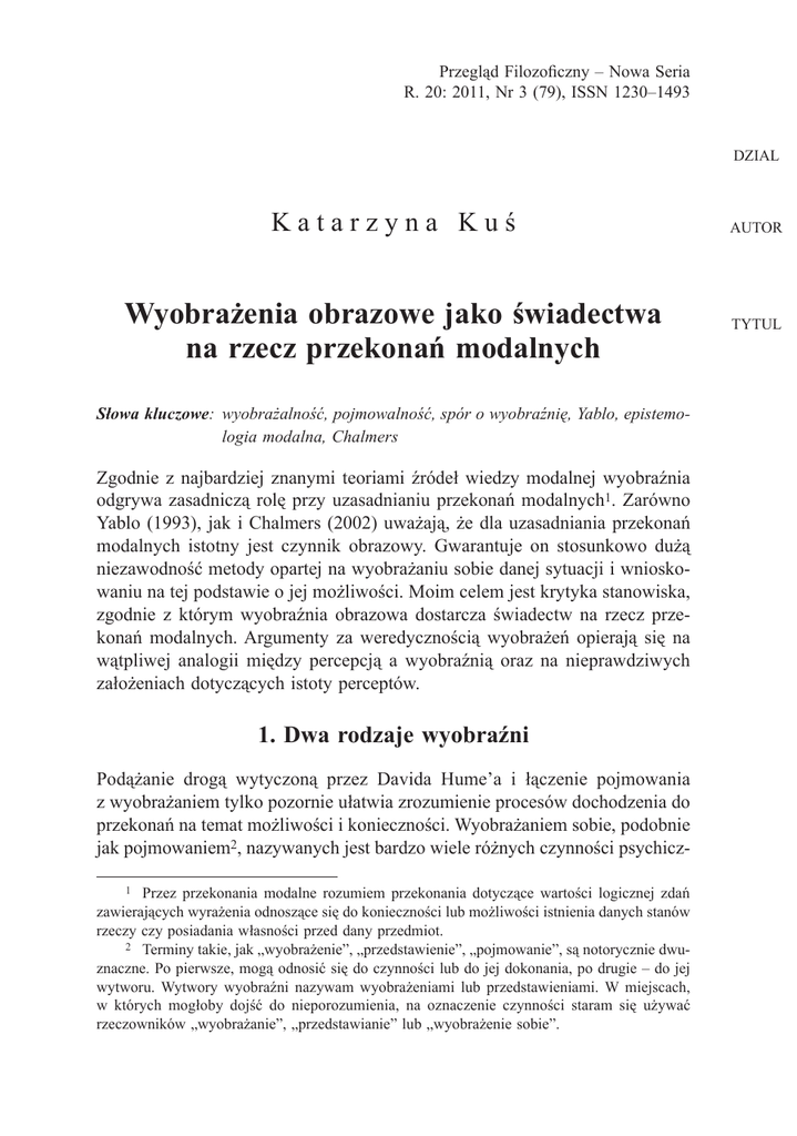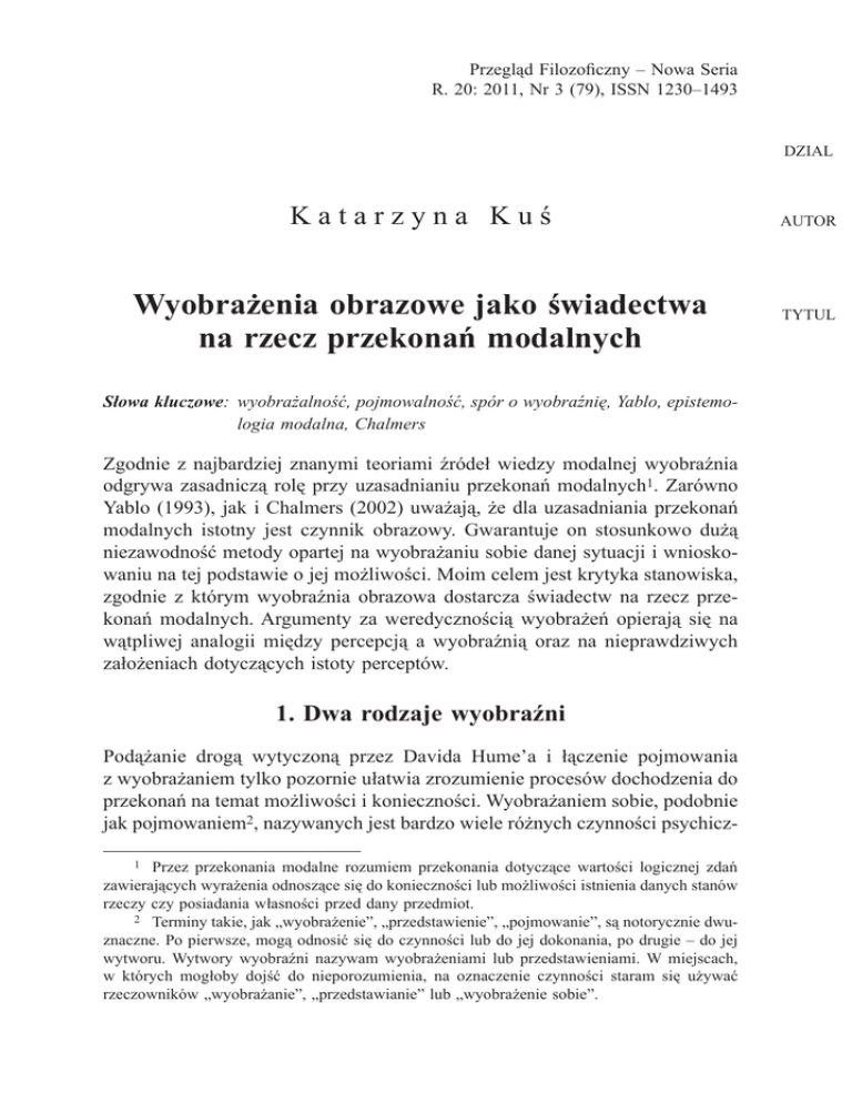Przegląd Filozoficzny – Nowa Seria R. 20: 2011, Nr 3 (79), ISSN 1230–1493 DZIAL Katarzyna Kuś AUTOR Wyobrażenia obrazowe jako świadectwa na rzecz przekonań modalnych TYTUL Słowa kluczowe: wyobrażalność, pojmowalność, spór o wyobraźnię, Yablo, epistemologia modalna, Chalmers Zgodnie z najbardziej znanymi teoriami źródeł wiedzy modalnej wyobraźnia odgrywa zasadniczą rolę przy uzasadnianiu przekonań modalnych1. Zarówno Yablo (1993), jak i Chalmers (2002) uważają, że dla uzasadniania przekonań modalnych istotny jest czynnik obrazowy. Gwarantuje on stosunkowo dużą niezawodność metody opartej na wyobrażaniu sobie danej sytuacji i wnioskowaniu na tej podstawie o jej możliwości. Moim celem jest krytyka stanowiska, zgodnie z którym wyobraźnia obrazowa dostarcza świadectw na rzecz przekonań modalnych. Argumenty za weredycznością wyobrażeń opierają się na wątpliwej analogii między percepcją a wyobraźnią oraz na nieprawdziwych założeniach dotyczących istoty perceptów. 1. Dwa rodzaje wyobraźni Podążanie drogą wytyczoną przez Davida Hume’a i łączenie pojmowania z wyobrażaniem tylko pozornie ułatwia zrozumienie procesów dochodzenia do przekonań na temat możliwości i konieczności. Wyobrażaniem sobie, podobnie jak pojmowaniem2, nazywanych jest bardzo wiele różnych czynności psychicz1 Przez przekonania modalne rozumiem przekonania dotyczące wartości logicznej zdań zawierających wyrażenia odnoszące się do konieczności lub możliwości istnienia danych stanów rzeczy czy posiadania własności przed dany przedmiot. 2 Terminy takie, jak „wyobrażenie”, „przedstawienie”, „pojmowanie”, są notorycznie dwuznaczne. Po pierwsze, mogą odnosić się do czynności lub do jej dokonania, po drugie – do jej wytworu. Wytwory wyobraźni nazywam wyobrażeniami lub przedstawieniami. W miejscach, w których mogłoby dojść do nieporozumienia, na oznaczenie czynności staram się używać rzeczowników „wyobrażanie”, „przedstawianie” lub „wyobrażenie sobie”. 232 Katarzyna Kuś nych, a dociekania nad istotą wyobraźni wiążą się zarówno z rozważaniem jej strony fenomenologicznej, jak i z tradycyjną analizą pojęciową. Badania w znacznej mierze utrudnia fakt, że wiele podstawowych kwestii dotyczących natury wyobraźni pozostaje do dziś bez odpowiedzi. Zgodnie z bardzo ogólną charakterystyką dzięki wyobraźni możliwe jest dla podmiotu uobecnianie w świadomości czy unaocznianie sobie niebędących w zasięgu jego zmysłów przedmiotów, scen lub całych scenariuszy. Podmiot może do tego wykorzystywać przechowywane w pamięci reprezentacje istniejących przedmiotów lub tworzyć reprezentacje przedmiotów, których nie ma w rzeczywistym świecie, może odwzorowywać istniejące konfiguracje rzeczy, może wreszcie wytwarzać reprezentacje układów, których w rzeczywistości nie ma. Na pierwszy rzut oka nie widać powodów, dla których moglibyśmy uważać, że wyobraźnia pozwala poznać, co jest, a co nie jest możliwe. Znamy wiele przykładów, w których przedmiotem wyobraźni są niemożliwe sytuacje. Gdy fantazjuję, że jestem córką królowej angielskiej lub że naukowcy odkryli złoto o masie atomowej 97, to przynajmniej według Kripkego, przedstawiam sobie rzeczy metafizycznie niemożliwe. Równie dobrze mogę tworzyć historie o podróżach w czasie i zabijaniu własnych przodków, co o otrzymywaniu medalu Fieldsa za odkrycie, że 2 + 2 nie równa się jednak 4. Wyobraźnia wydaje się na tyle elastyczna, że jej przedmiotem mogą być zarówno przedmioty i sytuacje możliwe, jak i niemożliwe. Główny wysiłek badawczy epistemologów modalnych związany jest więc z ustaleniem, na czym ma polegać ten rodzaj wyobrażania, który by za swój przedmiot miał jedynie rzeczy możliwe. Mimo braku zgody zarówno wśród psychologów, jak i filozofów co do istoty wyobraźni, autorzy tacy jak Yablo czy Chalmers uznają, że wiedza na temat procesów związanych z tworzeniem wyobrażeń jest wystarczająca, by odwołać się do niej przy odpowiedzi na pytanie o warunki skutecznego pojmowania3. Wśród psychologów rozważania nad wyobraźnią związane są w znacznej mierze ze sporem o naturę reprezentacji umysłowych między stanowiskiem obrazowym i abstrakcyjnym (zwanym też opisowym lub propozycjonalnym). Pierwsze związane jest z rozumieniem wyobrażeń jako reprezentacji odwzorowujących własności jakościowe rzeczywistych przedmiotów, a samej wyobraźni jako władzy pozwalającej podmiotowi operować na przedstawieniach obrazowych, a więc zdolności quasi-sensorycznej. Zgod3 Dobrym przykładem takiego podejścia jest wyrażone wprost przekonanie Gregory’ego (2004: 329): „Myślę, że stosunkowo prymitywne ujęcie głównego pojęcia [tj. wyobraźni] nie jest problematyczne. Filozofowie swobodnie korzystali w rozważaniach z innych pojęć mentalnych, takich jak przekonanie. Nasze potoczne rozumienie tego, czym jest wyobraźnia, jest wystarczające, aby mogło odegrać podobną rolę do tej, którą pełni pojęcie przekonania”. Wyobrażenia obrazowe jako świadectwa na rzecz przekonań modalnych 233 nie natomiast z ujęciem abstrakcyjnym podstawową jednostką reprezentacji są sądy stwierdzające posiadanie przez przedmiot danej własności. Badania empiryczne, które miałyby rozstrzygnąć na korzyść jednego z tych rozwiązań, najczęściej są interpretowane na korzyść stanowiska obrazowego, znaczną część wyników daje się jednak wyjaśnić również w terminach stanowiska abstrakcyjnego (Nowak 1997). Debatę w psychologii nad istotą wyobrażeń można podsumować następująco: nie ma wątpliwości, że istnieją wyobrażenia, które mają za swój przedmiot sądy, najprawdopodobniej istnieją również wyobrażenia obrazowe. Kwestią dyskusyjną pozostaje, które dokładnie wyobrażenia są reprezentowane w kodach odpowiadających poszczególnym zmysłom. 