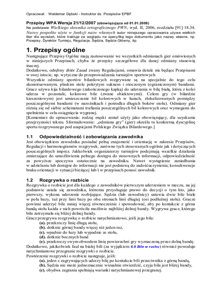 Opracował: Waldemar Dębski - Instruktor ds. Przepisów EPBF Przepisy WPA Wersja 21/12/2007 (obowiązująca od 01.01.2008) Na podstawie Wielkiego słownika ortograficznego PWN, wyd. II, 2006, rozdziału [91] 18.34. Nazwy pospolite użyte w funkcji nazw własnych autor niniejszego opracowania używa wielkich liter dla wy rażeń, które traktuje ze wzgl ędu na specy fikę tego dokumentu jako nazwy własne, np. Przepisy, Dyrektor Turnieju, Regulacje, Sędzia, Sędzia Główny, itp. 1. Przepisy ogólne Następujące Przepisy Ogólne mają zastosowanie we wszystkich odmianach gier omówionych w niniejszych Przepisach, chyba że przepisy szczegółowe dla danej odmiany stanowią inaczej. Dodatkowo, odrębny zbiór Zasad zwany Regulacjami, omawia detale nie będące Przepisami w swej istocie, np. wytyczne do przeprowadzania turniejów sportowych. Wszystkie odmiany sportów bilardowych rozgrywane są na specjalnie do tego celu skonstruowanym, płaskim stole pokrytym suknem i otoczonym (ograniczonym) bandami. Gracz używa kija bilardowego (zakończonego kapką) do uderzania w bilę białą, która z kolei uderza w pozostałe, kolorowe bile (zwane obiektowymi). Celem gry (w bilardzie kieszeniowym) jest umieszczenie bil kolorowych w łuzach, zlokalizowanych pomiędzy poszczególnymi bandami (w narożnikach i pośrodku długich boków stołu). Odmiany gier różnią się od siebie schematami trafiania poszczególnych bil kolorowych oraz wymogami do spełnienia w celu osiągnięcia wygranej. [Komentarz do opracowania: rodzaj męski został użyty jako obowiązujący, dla uzyskania przejrzystości tekstu. Sformułowanie: „odmiana gry” (gier) określa tu konkretną dyscyplinę sportu rozgrywanego pod auspicjami Polskiego Związku Bilardowego.] 1.1 Odpowiedzialność i zobowiązania zawodnika Jest obowiązkiem zawodnika posiadać pełną znajomość i orientację w zakresie Przepisów, Regulacji i harmonogramów rozgrywek, zarówno tych stosowanych ogólnie jak i dotyczących poszczególnych imprez. Jakkolwiek organizatorzy turniejów podejmują wszelkie działania zmierzające do umożliwienia pełnego dostępu do stosownych informacji, odpowiedzialność za powyższe spoczywa ostatecznie na zawodniku. Nawet wystąpienie zaniedbania w udzielaniu lub dostępie do informacji nie jest podstawą do zadośćuczynienia; konsekwencje braku orientacji w sytuacji bieżącej lub/i w przepisach ponosi zawodnik. 1.2 Rozgrywka o rozbicie Rozgrywka o rozbicie jest dla każdego z zawodników pierwszym uderzeniem w meczu, na jej podstawie ustala się zawodnika, któremu przysługuje prawo do decyzji o tym kto, jako pierwszy, wykona uderzenie rozbijające. Sędzia (lub zawodnicy) ustawia dwie bile białe w polu bazy, tuż przy linii bazy po obu stronach linii długiej (osi podłużnej stołu). Gracze powinni uderzyć bile mniej więcej równocześnie i spowodować, aby po kontakcie z górna bandą stołu każda z nich powróciła możliwie najbliżej dolnej bandy. Wygrywa gracz, którego bila zatrzymała się bliżej dolnej bandy. Gracz przegrywa rozgrywkę o rozbicie natychmiastowo, jeśli jego bila: (a). przekroczy linię długą stołu, (b). dotknie górnej bandy więcej niż jeden raz, (c). wpadnie do łuzy lub wypadnie ze stołu, (d). dotknie bocznych band (e). przekroczy swym obwodem linię powierzchni gry wyznaczoną przez dolną bandę. Dodatkowo, jakikolwiek faul na białej bili (za wyjątkiem 6.9 Bile w ruchu ) również powoduje natychmiastowe przegranie rozgrywki o rozbicie. Powtórzenie rozgrywki o rozbicie następuje, jeśli: (a). jeden z zagrywających uderzy bilę po kontakcie bili przeciwnika z górną bandą, (b). Sędzia nie może jednoznacznie wizualnie stwierdzić, czyja bila jest bliżej bandy, (c). obydwa zagrania spełniają warunki natychmiastowej przegranej. Opracował: Waldemar Dębski - Instruktor ds. Przepisów EPBF 1.3 Dozwolone wyposażenie Sprzęt musi spełniać wymogi obowiązującej Specyfikacji Technicznej WPA (patrz www.wpa-pool.com). W szczególności, graczom nie wolno używać nowatorskiego, niespotykanego wyposażenia do gry . Pojawienie się takowego lub zamiar jego ewentualnego zastosowania należy natychmiastowo skonsultować się z Dyrektorem Turnieju. Sprzęt musi być zawsze używany zgodnie z jego zamierzonym przeznaczeniem, wg powszechnie funkcjonujących zasad. Poniżej przedstawione jest tradycyjne wyposażenie oraz jego zwyczajowe zastosowanie i ograniczenia: (a). kije – graczowi wolno zmieniać kije w trakcie meczu, używać różnych ich rodzajów (do rozbijania, do skoków, do gry), wolno używać wkręcanych lub wsuwanych przedłużeń kija; (b). dozwolone jest użycie kredy do nakładania na kapkę, kolor kredy musi być utrzymany w tonacji sukna stołu, na którym rozgrywany jest mecz; (c). podpórki, wsporniki – dozwolone jest jednoczesne użycie najwyżej dwóch przyrządów (w dowolnej konfiguracji) do podparcia kija w trakcie wykonywania zagrania; zawodnikowi wolno użyć własnego przyrządu, jeśli ten jest podobny do używanych standardowo; (d). rękawiczka – dozwolone jest użycie tradycyjnej rękawiczki; (e). talk – użycie talku jest limitowane do ilości nie zanieczyszczającej otoczenia (stołu, stolika, podłogi, itp.); podlega to wyłącznej ocenie Sędziego. 1.4 “Repozycjonowanie” bil Bile są repozycjonowane (przywracane do gry na stole) poprzez umieszczanie ich (ich środka) na linii powrotów, rozpoczynając od punktu głównego, następnie możliwie najbliżej tego punktu kolejno w kierunku górnej bandy, bez przemieszczania bil już się tam znajdujących. Jeśli bila nie może być umieszczona na punkcie głównym, powinna zostać umieszczona tak ,aby się stykała z zajmującą tam miejsce bilą lub możliwie najbliżej, ale bez przemieszczania tej bili. Jednakże, jeśli zajmującą tam miejsce bilą jest bila biała, bila repozycjonowana powinna być umieszczona możliwie najbliżej tej bili ale nie może się z bilą b