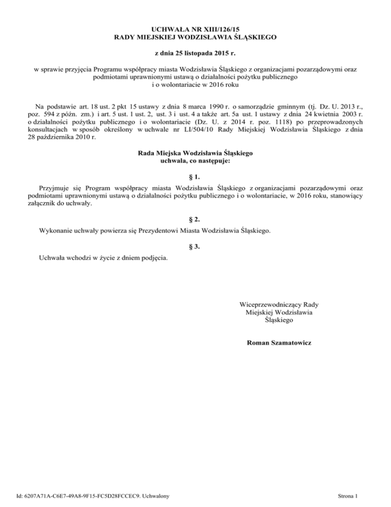UCHWAŁA NR XIII/126/15 RADY MIEJSKIEJ WODZISŁAWIA ŚLĄSKIEGO z dnia 25 listopada 2015 r. w sprawie przyjęcia Programu współpracy miasta Wodzisławia Śląskiego z organizacjami pozarządowymi oraz podmiotami uprawnionymi ustawą o działalności pożytku publicznego i o wolontariacie w 2016 roku Na podstawie art. 18 ust. 2 pkt 15 ustawy z dnia 8 marca 1990 r. o samorządzie gminnym (tj. Dz. U. 2013 r., poz. 594 z późn. zm.) i art. 5 ust. 1 ust. 2, ust. 3 i ust. 4 a także art. 5a ust. 1 ustawy z dnia 24 kwietnia 2003 r. o działalności pożytku publicznego i o wolontariacie (Dz. U. z 2014 r. poz. 1118) po przeprowadzonych konsultacjach w sposób określony w uchwale nr LI/504/10 Rady Miejskiej Wodzisławia Śląskiego z dnia 28 października 2010 r. Rada Miejska Wodzisławia Śląskiego uchwala, co następuje: § 1. Przyjmuje się Program współpracy miasta Wodzisławia Śląskiego z organizacjami pozarządowymi oraz podmiotami uprawnionymi ustawą o działalności pożytku publicznego i o wolontariacie, w 2016 roku, stanowiący załącznik do uchwały. § 2. Wykonanie uchwały powierza się Prezydentowi Miasta Wodzisławia Śląskiego. § 3. Uchwała wchodzi w życie z dniem podjęcia. Wiceprzewodniczący Rady Miejskiej Wodzisławia Śląskiego Roman Szamatowicz Id: 6207A71A-C6E7-49A8-9F15-FC5D28FCCEC9. Uchwalony Strona 1 Załącznik do Uchwały Nr XIII/126/15 Rady Miejskiej Wodzisławia Śląskiego z dnia 25 listopada 2015 r. PROGRAM WSPÓŁPRACY MIASTA WODZISŁAWIA ŚLĄSKIEGO Z ORGANIZACJAMI POZARZĄDOWYMI ORAZ PODMIOTAMI UPRAWNIONYMI USTAWĄ O DZIAŁALNOŚCI POŻYTKU PUBLICZNEGO I O WOLONTARIACIE NA ROK 2016 Wstęp 1. Ilekroć w niniejszym programie mówi się o: 1) ustawie – należy przez to rozumieć ustawę z dnia 24 kwietnia 2003 r. o działalności pożytku publicznego i o wolontariacie (Dz. U. z 2014 r. poz. 1118), 2) zadania publiczne – należy przez to rozumieć zadania określone w art. 4 ustawy, 3) organizacji – należy przez to rozumieć organizacje pozarządowe oraz podmioty, o których mowa w art. 3 ust. 3 ustawy o działalności pożytku publicznego i o wolontariacie, 4) Programie – należy przez to rozumieć Program współpracy miasta Wodzisławia Śląskiego z organizacjami pozarządowymi oraz podmiotami wymienionymi w art. 3 ust. 3 ustawy o działalności pożytku publicznego i o wolontariacie na 2016 rok, 5) mieście – należy przez to rozumieć miasto Wodzisław Śląski, 6) Radzie – należy przez to rozumieć Radę Miejską Wodzisławia Śląskiego, 7) Prezydencie – należy przez to rozumieć Prezydenta Miasta Wodzisławia Śląskiego. 2. Program określa m.in. zasady, zakres i formy współpracy miasta Wodzisławia Śląskiego z organizacjami działającymi na rzecz lokalnej społeczności, a także priorytetowe zadania publiczne dofinansowane z budżetu miasta Wodzisławia Śląskiego. § 1. Cel główny i cele szczegółowe programu 1. Celem głównym programu współpracy jest umacnianie demokratycznego ładu społecznego w środowisku lokalnym poprzez budowanie stabilnego partnerstwa pomiędzy samorządem, a organizacjami pozarządowymi, opartego na długotrwałej współpracy w zaspokajaniu potrzeb mieszkańców miasta. 2. Cele szczegółowe: 1) umacnianie w świadomości mieszkańców poczucia odpowiedzialności za wspólnotę lokalną; 2) zwiększanie aktywności mieszkańców Wodzisławia Śląskiego w pełniejszym zaspokajaniu potrzeb wspólnoty; 3) podnoszenie zdolności organizacji pozarządowych do wykonywania zadań miasta samodzielnie i w ramach partnerskiej współpracy; 4) promowanie osiągnięć sektora pozarządowego oraz prezentacja jego dorobku; 5) kreowanie przyjaznego środowiska dla tworzenia i funkcjonowania organizacji pozarządowych; 6) wzmocnienie pozycji organizacji pozarządowych Id: 6207A71A-C6E7-49A8-9F15-FC5D28FCCEC9. Uchwalony poprzez współrealizację zadań publicznych. Strona 1 § 2. Wykonawcy programu Wykonawcami programu są: 1. Komórki organizacyjne Urzędu Miasta Wodzisławia Śląskiego; 2. Jednostki organizacyjne miasta Wodzisławia Śląskiego; 3. Pełnomocnik Prezydenta Miasta Wodzisławia Śląskiego ds. Współpracy z Organizacjami Pozarządowymi; 4. Zespoły, komisje i rady o charakterze doradczym i inicjatywnym. § 3. Zasady współpracy Współpraca miasta z organizacjami odbywać się będzie na zasadach: 1. Pomocniczości polegającej na powierzaniu organizacjom realizacji zadań własnych, a organizacje zapewniają ich wykonanie w sposób ekonomiczny, profesjonalny i terminowy; 2. Suwerenności stron - oznacza to, że stosunki pomiędzy miastem a organizacjami kształtowane będą z poszanowaniem wzajemnej autonomii i niezależności w swojej działalności statutowej; 3. Partnerstwa - oznacza to dobrowolną współpracę równorzędnych siebie podmiotów w rozwiązywaniu wspólnie zdefiniowanych problemów i osiąganiu razem wytyczonych celów; 4. Efektywności - oznacza to wspólne dążenie do osiągnięcia możliwie największych efektów realizacji zadań publicznych; 5. Uczciwej konkurencji - oznacza to wymóg udzielania tych samych informacji odnośnie wykonywanych działań zarówno przez podmioty publiczne jak i niepubliczne, a także obowiązek stosowania tych samych kryteriów przy dokonywaniu oceny tych działań i podejmowaniu decyzji odnośnie ich finansowania; 6. Jawności - oznacza to, że wszystkie możliwości współpracy miasta z organizacją są powszechnie znane i dostępne oraz jasne i zrozumiałe w zakresie stosowanych procedur i kryteriów podejmowania decyzji. § 4. Zakres przedmiotowy Przedmiotem współpracy miasta z organizacjami jest: 1. Realizacja zadań miasta określonych w ustawach; 2. Podwyższenie efektywności działań kierowanych do mieszkańców miasta; 3. Określenie potrzeb społecznych i sposobu ich zaspokajania; 4. Konsultowanie projektów aktów prawa miejscowego na etapie ich tworzenia. § 5. Formy współpracy Współpraca z organizacjami
