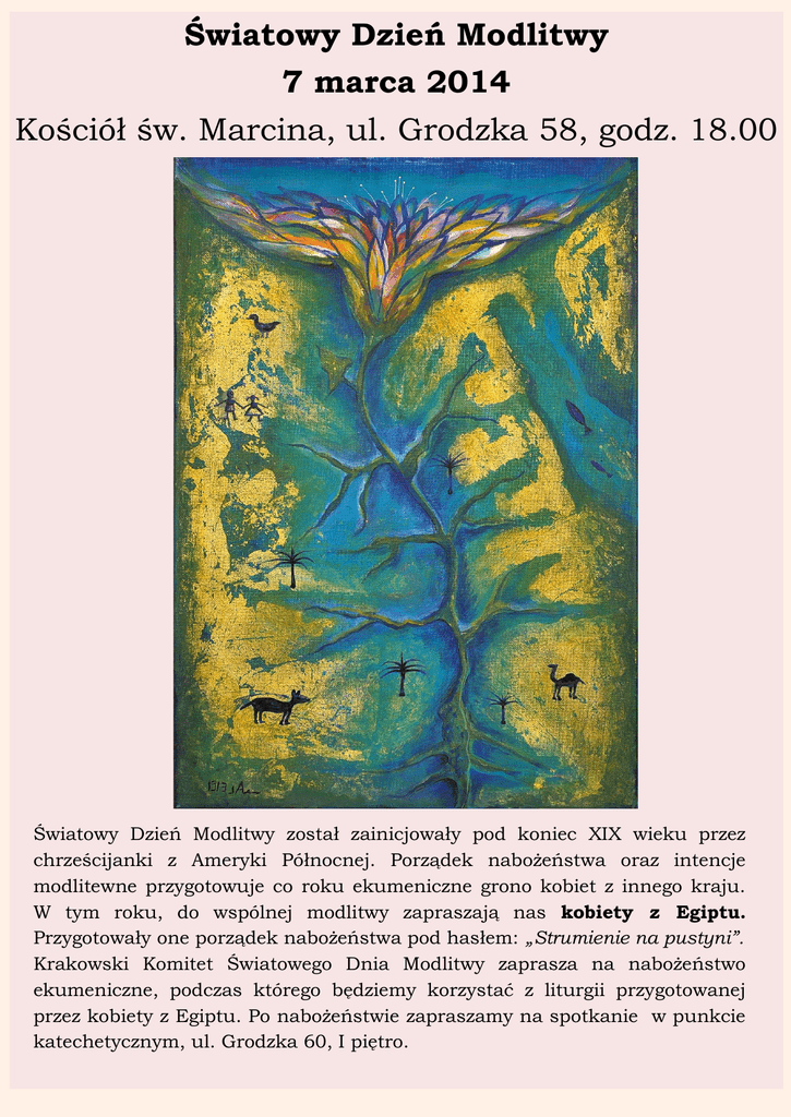 Światowy Dzień Modlitwy 7 marca 2014 Kościół św. Marcina, ul. Grodzka 58, godz. 18.00 Światowy Dzień Modlitwy został zainicjowały pod koniec XIX wieku przez chrześcijanki z Ameryki Północnej. Porządek nabożeństwa oraz intencje modlitewne przygotowuje co roku ekumeniczne grono kobiet z innego kraju. W tym roku, do wspólnej modlitwy zapraszają nas kobiety z Egiptu. Przygotowały one porządek nabożeństwa pod hasłem: „Strumienie na pustyni”. Krakowski Komitet Światowego Dnia Modlitwy zaprasza na nabożeństwo ekumeniczne, podczas którego będziemy korzystać z liturgii przygotowanej przez kobiety z Egiptu. Po nabożeństwie zapraszamy na spotkanie w punkcie katechetycznym, ul. Grodzka 60, I piętro.