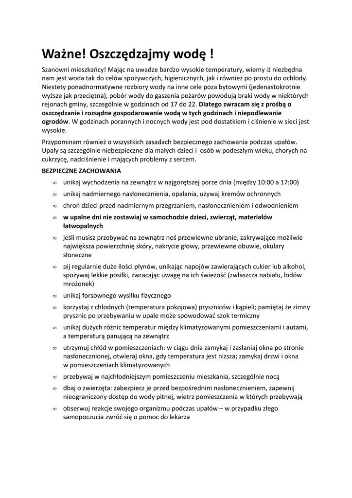 Ważne! Oszczędzajmy wodę ! Szanowni mieszkańcy! Mając na uwadze bardzo wysokie temperatury, wiemy iż niezbędna nam jest woda tak do celów spożywczych, higienicznych, jak i również po prostu do ochłody. Niestety ponadnormatywne rozbiory wody na inne cele poza bytowymi (jedenastokrotnie wyższe jak przeciętna), pobór wody do gaszenia pożarów powodują braki wody w niektórych rejonach gminy, szczególnie w godzinach od 17 do 22. Dlatego zwracam się z prośbą o oszczędzanie i rozsądne gospodarowanie wodą w tych godzinach i niepodlewanie ogrodów. W godzinach porannych i nocnych wody jest pod dostatkiem i ciśnienie w sieci jest wysokie. Przypominam również o wszystkich zasadach bezpiecznego zachowania podczas upałów. Upały są szczególnie niebezpieczne dla małych dzieci i osób w podeszłym wieku, chorych na cukrzycę, nadciśnienie i mających problemy z sercem. BEZPIECZNE ZACHOWANIA • unikaj wychodzenia na zewnątrz w najgorętszej porze dnia (między 10:00 a 17:00) • unikaj nadmiernego nasłonecznienia, opalania, używaj kremów ochronnych • chroń dzieci przed nadmiernym przegrzaniem, nasłonecznieniem i odwodnieniem • w upalne dni nie zostawiaj w samochodzie dzieci, zwierząt, materiałów łatwopalnych • jeśli musisz przebywać na zewnątrz noś przewiewne ubranie, zakrywające możliwie największa powierzchnię skóry, nakrycie głowy, przewiewne obuwie, okulary słoneczne • pij regularnie duże ilości płynów, unikając napojów zawierających cukier lub alkohol, spożywaj lekkie posiłki, zwracając uwagę na ich świeżość (zwłaszcza nabiału, lodów mrożonek) • unikaj forsownego wysiłku fizycznego • korzystaj z chłodnych (temperatura pokojowa) pryszniców i kąpieli; pamiętaj że zimny prysznic po przebywaniu w upale może spowodować szok termiczny • unikaj dużych różnic temperatur między klimatyzowanymi pomieszczeniami i autami, a temperaturą panującą na zewnątrz • utrzymuj chłód w pomieszczeniach: w ciągu dnia zamykaj i zasłaniaj okna po stronie nasłonecznionej, otwieraj okna, gdy temperatura jest niższa; zamykaj drzwi i okna w pomieszczeniach klimatyzowanych • przebywaj w najchłodniejszym pomieszczeniu mieszkania, szczególnie nocą • dbaj o zwierzęta: zabezpiecz je przed bezpośrednim nasłonecznieniem, zapewnij nieograniczony dostęp do wody pitnej, wietrz pomieszczenia w których przebywają • obserwuj reakcje swojego organizmu podczas upałów – w przypadku złego samopoczucia zwróć się o pomoc do lekarza