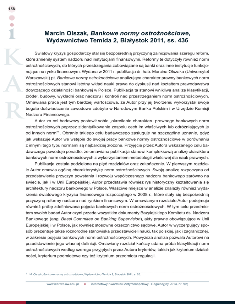 158 Marcin Olszak, Bankowe normy ostrożnościowe, Wydawnictwo Temida 2, Białystok 2011, ss. 436 Światowy kryzys gospodarczy stał się bezpośrednią przyczyną zainicjowania szeregu reform, które zmieniły system nadzoru nad instytucjami finansowymi. Reformy te dotyczyły również norm ostrożnościowych, do których przestrzegania zobowiązane są banki oraz inne instytucje funkcjonujące na rynku finansowym. Wydana w 2011 r. publikacja dr. hab. Marcina Olszaka (Uniwersytet Warszawski) pt. Bankowe normy ostrożnościowe analizująca charakter prawny bankowych norm ostrożnościowych stanowi istotny wkład nauki prawa do dyskusji nad kształtem prawodawstwa dotyczącego działalności bankowej w Polsce. Publikacja ta stanowi wnikliwą analizę klasyfikacji, źródeł, budowy, wykładni oraz nadzoru i kontroli nad przestrzeganiem norm ostrożnościowych. Omawiana praca jest tym bardziej wartościowa, że Autor przy jej tworzeniu wykorzystał swoje bogate doświadczenie zawodowe zdobyte w Narodowym Banku Polskim i w Urzędzie Komisji Nadzoru Finansowego. Autor za cel badawczy postawił sobie „określenie charakteru prawnego bankowych norm ostrożnościowych poprzez zidentyfikowanie zespołu cech im właściwych lub odróżniających je od innych norm”1. Obranie takiego celu badawczego zasługuje na szczególne uznanie, gdyż jak wskazuje Autor we wstępie do swojej pracy bankowe normy ostrożnościowe w porównaniu z innymi tego typu normami są najbardziej złożone. Przyjęcie przez Autora wskazanego celu badawczego powoduje ponadto, że omawiana publikacja stanowi kompleksową analizę charakteru bankowych norm ostrożnościowych z wykorzystaniem metodologii właściwej dla nauk prawnych. Publikacja została podzielona na pięć rozdziałów oraz zakończenie. W pierwszym rozdziale Autor omawia ogólną charakterystykę norm ostrożnościowych. Swoją analizę rozpoczyna od przedstawienia przyczyn powstania i rozwoju współczesnego nadzoru bankowego zarówno na świecie, jak i w Unii Europejskiej. Autor przedstawia również rys historyczny kształtowania się architektury nadzoru bankowego w Polsce. Właściwe miejsce w analizie znalazły również wydarzenia światowego kryzysu finansowego rozpoczętego w 2008 r., które stały się bezpośrednią przyczyną reformy nadzoru nad rynkiem finansowym. W omawianym rozdziale Autor podejmuje również próbę zdefiniowana pojęcia bankowych norm ostrożnościowych. W tym celu przedmiotem swoich badań Autor czyni przede wszystkim dokumenty Bazylejskiego Komitetu ds. Nadzoru Bankowego (ang. Basel Commitee on Banking Supervision), akty prawne obowiązujące w Unii Europejskiej i w Polsce, jak również stosowne orzecznictwo sądowe. Autor w wyczerpujący sposób prezentuje także różnorodne stanowiska przedstawicieli nauki, tak polskiej, jak i zagranicznej, w zakresie pojęcia bankowych norm ostrożnościowych. Powyższa analiza pozwala Autorowi na przedstawienie jego własnej definicji. Omawiany rozdział kończy udana próba klasyfikacji norm ostrożnościowych według szeregu przyjętych przez Autora kryteriów, takich jak kryterium działalności, kryterium podmiotowe czy też kryterium przedmiotu regulacji. 1 M. Olszak, Bankowe normy ostrożnościowe, Wydawnictwo Temida 2, Białystok 2011, s. 20. www.ikar.wz.uw.edu.pl internetowy Kwartalnik Antymonopolowy i Regulacyjny 2013, nr 7(2) 159 Wojciech Podlasin Marcin Olszak, Bankowe normy ostrożnościowe W rozdziale drugim Autor prezentuje źródła, przedmiot oraz podmioty tworzące bankowe normy ostrożnościowe. Autor wyróżnia trzy poziomy tworzenia bankowych norm ostrożnościowych – międzynarodowy, Unii Europejskiej oraz polski. Autor zauważa, że na poziomie międzynarodowym najważniejszym podmiotem formułującym postulaty w zakresie bankowych norm ostrożnościowych jest Bazylejski Komitet ds. Nadzoru Bankowego, w ramach którego powstały takie dokumenty, jak Umowa Kapitałowa z 1988 r. (Bazylea I), Nowa Umowa Kapitałowa z 2004 r. (Bazylea II) oraz tzw. Bazylea III. Autor analizuje również charakter prawny tych dokumentów, wskazując, że nie mają one wiążącego charakteru. W zakresie bankowych norm ostrożnościowych tworzonych na poziomie Unii Europejskiej Autor opisuje traktatowe podstawy legislacji ustanawiającej bankowe normy ostrożnościowe oraz podstawowe akty prawne w tym zakresie, w szczególności Dyrektywę 2006/48/WE Parlamentu Europejskiego i Rady z 14 czerwca 2006 r. w sprawie podejmowania i prowadzenia działalności przez instytucje kredytowe2 oraz Dyrektywę 2006/49/WE Parlamentu Europejskiego i Rady z 14 czerwca 2006 r. w sprawie adekwatności kapitałowej firm inwestycyjnych i instytucji kredytowych3, i ich strukturę. Autor omawia także ramy prawne funkcjonowania Europejskiego Urzędu Nadzoru Bankowego (ang. European Banking Authority) oraz zasad odnoszących się do regulacyjnych standardów technicznych oraz wykonawczych standardów technicznych opracowywanych przez ten urząd. Autor poddaje następnie analizie charakter prawny wytycznych i zaleceń Europejskiego Urzędu Nadzoru Bankowego, jak również dokumentów wydanych przez Komitet Europejskich Organów Nadzoru Bankowego (ang. Committee of European Banking Supervisors). Autor wnikliwie bada również źródła bankowych norm ostrożnościowych w Polsce, w szczególności ustawy, w tym ustawę z 29 sierpnia 1997 r. – Prawo bankowe4, oraz odpowiednie akty wykonawcze, takie jak uchwały i zarządzenia Komisji Nadzoru Finansowego. W opisywanym rozdziale stosowne miejsce zajmuje również analiza rekomendacji Komisji Nadzoru Finansowego jako ewentualnych źródeł bankowych norm ostrożnościowych, które, jak zauważa Autor, pomimo swojego niewiążącego charakterem mają istotne znaczenie dla funkcjonowania systemu bankowego w Polsce. Rozdział trzeci opisywanej publikacji został poświęcony budowie bankowych norm ostrożnościowych. W rozdziale tym Autor omawia ich zakres st