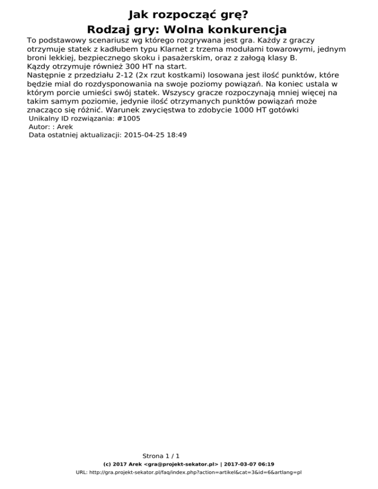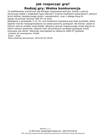 Jak rozpocząć grę? Rodzaj gry: Wolna konkurencja To podstawowy scenariusz wg którego rozgrywana jest gra. Każdy z graczy otrzymuje statek z kadłubem typu Klarnet z trzema modułami towarowymi, jednym broni lekkiej, bezpiecznego skoku i pasażerskim, oraz z załogą klasy B. Kązdy otrzymuje również 300 HT na start. Następnie z przedziału 2-12 (2x rzut kostkami) losowana jest ilość punktów, które będzie mial do rozdysponowania na swoje poziomy powiązań. Na koniec ustala w którym porcie umieści swój statek. Wszyscy gracze rozpoczynają mniej więcej na takim samym poziomie, jedynie ilość otrzymanych punktów powiązań może znacząco się różnić. Warunek zwycięstwa to zdobycie 1000 HT gotówki Unikalny ID rozwiązania: #1005 Autor: : Arek Data ostatniej aktualizacji: 2015-04-25 18:49 Strona 1 / 1 (c) 2017 Arek <[email protected]> | 2017-03-07 06:19 URL: http://gra.projekt-sekator.pl/faq/index.php?action=artikel&cat=3&id=6&artlang=pl Powered by TCPDF (www.tcpdf.org)