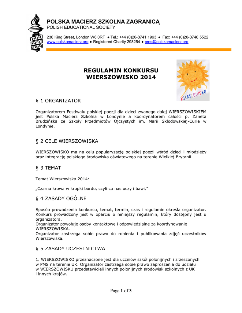 POLSKA MACIERZ SZKOLNA ZAGRANICĄ POLISH EDUCATIONAL SOCIETY 238 King Street, London W6 0RF ● Tel.: +44 (0)20-8741 1993 ● Fax: +44 (0)20-8748 5522 www.polskamacierz.org ● Registered Charity 298254 ● [email protected] REGULAMIN KONKURSU WIERSZOWISKO 2014 § 1 ORGANIZATOR Organizatorem Festiwalu polskiej poezji dla dzieci zwanego dalej WIERSZOWISKIEM jest Polska Macierz Szkolna w Londynie a koordynatorem całości p. Żaneta Brudzińska ze Szkoły Przedmiotów Ojczystych im. Marii Skłodowskiej-Curie w Londynie. § 2 CELE WIERSZOWISKA WIERSZOWISKO ma na celu popularyzację polskiej poezji wśród dzieci i młodzieży oraz integrację polskiego środowiska oświatowego na terenie Wielkiej Brytanii. § 3 TEMAT Temat Wierszowiska 2014: „Czarna krowa w kropki bordo, czyli co nas uczy i bawi.” § 4 ZASADY OGÓLNE Sposób prowadzenia konkursu, temat, termin, czas i regulamin określa organizator. Konkurs prowadzony jest w oparciu o niniejszy regulamin, który dostępny jest u organizatora. Organizator powołuje osoby kontaktowe i odpowiedzialne za koordynowanie WIERSZOWISKA. Organizator zastrzega sobie prawo do robienia i publikowania zdjęć uczestników Wierszowiska. § 5 ZASADY UCZESTNICTWA 1. WIERSZOWISKO przeznaczone jest dla uczniów szkół polonijnych i zrzeszonych w PMS na terenie UK. Organizator zastrzega sobie prawo zaproszenia do udziału w WIERSZOWISKU przedstawicieli innych polonijnych środowisk szkolnych z UK i innych krajów. Page 1 of 3 POLSKA MACIERZ SZKOLNA ZAGRANICĄ POLISH EDUCATIONAL SOCIETY 238 King Street, London W6 0RF ● Tel.: +44 (0)20-8741 1993 ● Fax: +44 (0)20-8748 5522 www.polskamacierz.org ● Registered Charity 298254 ● [email protected] 2. Przesłuchania odbywają się w dwóch kategoriach: to jest kategoria występ indywidualny podzielony na cztery grupy wiekowe oraz kategoria zespołowa zwana dalej występem zespołowym szkoły. 3. Czas prezentacji w kategoriach indywidualnych nie może przekraczać 5 minut a o kolejności prezentacji decyduje data nadesłania zgłoszenia. W kategorii występ zespołowy czas prezentacji nie może przekraczać 10 minut a rozstawienie scenografii nie może trwać dłużej niż 5 minut. Jury zastrzega sobie prawo odejmowania punktów za czas rozkładania i demontowania inscenizacji na scenie przed i po występie. 4. Chętnych do udziału w występie można zgłaszać według następujących kategorii wiekowych: a. Kategoria indywidualna: - od 4 do 6 lat - od 7 do 9 lat - od 10 do 13 lat - 14 + O przydziale do kategorii wiekowej decyduje ukończony wiek uczestnika w dniu odbycia się Wierszowiska. Ilość reprezentantów poszczególnych placówek oświatowych w obrębie kategorii indywidualnej określa następujące prawo: - 2 3 4 5 uczestników: uczestników: uczestników: uczestników: szkoły szkoły szkoły szkoły liczące liczące liczące liczące do 200 uczniów do 350 uczniów do 500 uczniów powyżej 500 uczniów Uczestnicy indywidualni mogą brać udział w kategorii zespołowej. b. Występ zespołowy szkoły: -Kategoria zespołowa Ilość osób reprezentujących szkołę w tej kategorii nie może przekroczyć 25 uczestników. Wiek uczestników nie jest ograniczony. Każda szkoła może przygotować tylko jeden występ zbiorowy. 5. Uczestnicy, którzy nie przygotują swoich występów Wierszowiska nie zostaną dopuszczeni do przesłuchań. zgodnie z tematem § 6 ZASADY POWOŁYWANIA JURY I KRYTERIA OCENY 1. O wyłonieniu zwycięzców konkursu decyduje powołane w tym celu przez Organizatora Jury. Organizator zastrzega sobie prawo do powołania niezależnych członków Jury. Page 2 of 3 POLSKA MACIERZ SZKOLNA ZAGRANICĄ POLISH EDUCATIONAL SOCIETY 238 King Street, London W6 0RF ● Tel.: +44 (0)20-8741 1993 ● Fax: +44 (0)20-8748 5522 www.polskamacierz.org ● Registered Charity 298254 ● [email protected] 2. Jury ocenia występy dzieci, przyznając od 1 do 5 punków, według następujących kryteriów: a. Walory aktorskie, czyli: dykcja, modulacja głosu, mimika, gesty, ruch sceniczny. b. Oryginalność interpretacji. c. Scenografia, wykorzystanie rekwizytów w prezentowanym występie. d. Ogólny wyraz artystyczny, zwany dalej ogólnym wrażeniem. 3. Wierszowisko jest imprezą recytatorską, występy typu playback lub soundmixshow nie będą podlegały ocenom Jury. 4. Organizator nie ponosi odpowiedzialności za podjętą przez Jury decyzję, która jest ostateczna i niepodważalna. § 7 NAGRODY I WYRÓŻNIENIA Laureaci obu kategorii otrzymują pamiątkowe dyplomy i medale. nagrody rzeczowe, a pozostali uczestnicy § 8 ZASADY ZGŁOSZENIA Zgłoszenia szkół do wzięcia udziału w imprezie prosimy nadsyłać na adres: [email protected] do końca lutego 2014, a zgłoszenia kandydatów do 15 maja 2014 r. W zgłoszeniu prosimy o podanie następujących informacji: 1. imię i nazwisko dziecka 2. data urodzenia 3.nazwa i adres szkoły oraz nazwisko i telefon kontaktowy nauczyciela odpowiedzialnego za organizację Wierszowiska i eliminacje wewnątrzszkolne 4. Imię i nazwisko poety oraz tytuł prezentowanego utworu, 5. rodzaj kategorii § 9 TERMINY 1. 2. 3. 4. Eliminacje wewnątrzszkolne odbywają się we własnym zakresie. Ostateczny termin zgłaszania szkół:28.02.2014 Ostateczny termin zgłaszania uczestników:15.05.2014 Przesłuchania odbędą się w Londynie: 29.06.14 §10 Organizator zastrzega sobie prawo do ewentualnych zmian. Page 3 of 3