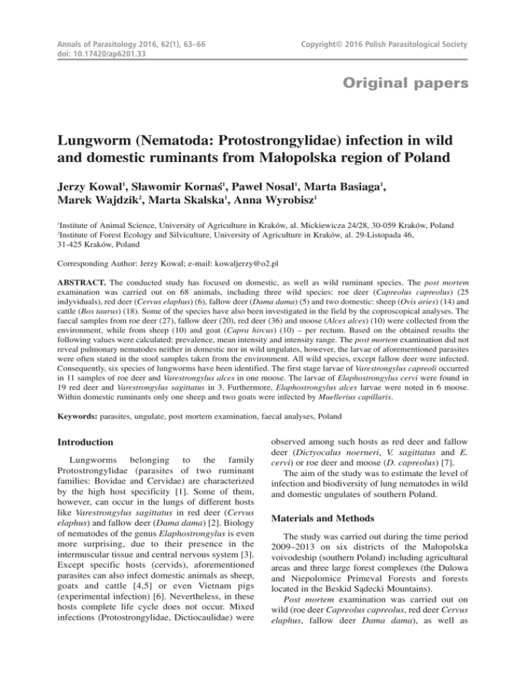 Annals of Parasitology 2016, 62(1), 63–66 doi: 10.17420/ap6201.33 Copyright© 2016 Polish Parasitological Society Original papers Lungworm (Nematoda: Protostrongylidae) infection in wild and domestic ruminants from Małopolska region of Poland Jerzy Kowal1, Sławomir Kornaś1, Paweł Nosal1, Marta Basiaga1, Marek Wajdzik2, Marta Skalska1, Anna Wyrobisz1 Institute of Animal Science, University of Agriculture in Kraków, al. Mickiewicza 24/28, 30-059 Kraków, Poland Institute of Forest Ecology and Silviculture, University of Agriculture in Kraków, al. 29-Listopada 46, 31-425 Kraków, Poland 1 2 Corresponding Author: Jerzy Kowal; e-mail: [email protected] ABSTRACT. The conducted study has focused on domestic, as well as wild ruminant species. The post mortem examination was carried out on 68 animals, including three wild species: roe deer (Capreolus capreolus) (25 indyviduals), red deer (Cervus elaphus) (6), fallow deer (Dama dama) (5) and two domestic: sheep (Ovis aries) (14) and cattle (Bos taurus) (18). Some of the species have also been investigated in the field by the coproscopical analyses. The faecal samples from roe deer (27), fallow deer (20), red deer (36) and moose (Alces alces) (10) were collected from the environment, while from sheep (10) and goat (Capra hircus) (10) – per rectum. Based on the obtained results the following values were calculated: prevalence, mean intensity and intensity range. The post mortem examination did not reveal pulmonary nematodes neither in domestic nor in wild ungulates, however, the larvae of aforementioned parasites were often stated in the stool samples taken from the environment. All wild species, except fallow deer were infected. Consequently, six species of lungworms have been identified. The first stage larvae of Varestrongylus capreoli occurred in 11 samples of roe deer and Varestrongylus alces in one moose. The larvae of Elaphostrongylus cervi were found in 19 red deer and Varestrongylus sagittatus in 3. Furthermore, Elaphostrongylus alces larvae were noted in 6 moose. Within domestic ruminants only one sheep and two goats were infected by Muellerius capillaris. Keywords: parasites, ungulate, post mortem examination, faecal analyses, Poland Introduction Lungworms belonging to the family Protostrongylidae (parasites of two ruminant families: Bovidae and Cervidae) are characterized by the high host specificity [1]. Some of them, however, can occur in the lungs of different hosts like Varestrongylus sagittatus in red deer (Cervus elaphus) and fallow deer (Dama dama) [2]. Biology of nematodes of the genus Elaphostrongylus is even more surprising, due to their presence in the intermuscular tissue and central nervous system [3]. Except specific hosts (cervids), aforementioned parasites can also infect domestic animals as sheep, goats and cattle [4,5] or even Vietnam pigs (experimental infection) [6]. Nevertheless, in these hosts complete life cycle does not occur. Mixed infections (Protostrongylidae, Dictiocaulidae) were observed among such hosts as red deer and fallow deer (Dictyocalus noerneri, V. sagittatus and E. cervi) or roe deer and moose (D. capreolus) [7]. The aim of the study was to estimate the level of infection and biodiversity of lung nematodes in wild and domestic ungulates of southern Poland. Materials and Methods The study was carried out during the time period 2009–2013 on six districts of the Małopolska voivodeship (southern Poland) including agricultural areas and three large forest complexes (the Dulowa and Niepolomice Primeval Forests and forests located in the Beskid Sądecki Mountains). Post mortem examination was carried out on wild (roe deer Capreolus capreolus, red deer Cervus elaphus, fallow deer Dama dama), as well as 64 domestic ungulates (sheep and cattle). The total number of analyzed animals was 68. Roe deer and red deer have not been treated with any antiparasitic compound, whereas fallow deer from Dulowa Forest was annually de-wormed with an ivermectin product. In turn, domestic ruminants were de-wormed twice a year. Lung dissection was done by opening of bronchia, bronchioles and observed nodules with fine scissors then flushing their lumen with physiological saline. Arisen liquid was poured through 250 μm sieve. The material collected on the sieve was transferred into a Petri dish and carefully examined under stereo microscope A coproscopy survey was conducted on faecal samples collected from captive fallow deer in Dulowa Forest and wild ruminants in Dulowska and Niepołomicka Primeval Forests. The faeces were distinguished on the basis of the shape and pellets’ dimensions [8]. The faecal samples from wild ruminants (roe deer n=27, fallow deer n=20, red deer n=36 and moose n=10) were collected directly from the field (mainly from the vicinity of feeding racks), while from domestic (10 sheep and 10 goats) – per rectum. To isolate lungworm larvae from faecal material, the Baermann technique was used [9]. The first stage larvae of lung nematodes were identified using morphological criteria [10–13]. Larvae measurements were made by means of a microscope Motic BA210, in the Motic Image Plus 2.0 Program (magnification 40×, 100× and 600×). Based on the obtained results the following values were calculated: prevalence of infection (P %), the average number of parasitic larvae per 5 g of faeces (I – intensity) and the minimal and maximal number of larvae (R – intensity range). Results Post mortem examination did not reveal pulmonary nematodes neither in domestic nor in wild ungulates, however, the larvae of aforementioned parasites were often stated in the stool samples taken from the environment. Additionally, larvae were found in samples from domestic sheep and goats. All wild species, except fallow deer were infected. Consequently, six species of lungworms have been identified. The first stage larvae of Varestrongylus capreoli occurred in 11 samples of roe deer (P=37.04%; I=265; R=1–933) and 
