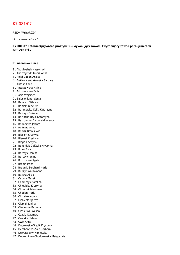 K7.081/07 REJON WYBORCZY Liczba mandatów - 6 K7.081/07 Katowice(prywatne praktyki+nie wykonujący zawodu+wykonujący zawód poza granicami RP)-DENTYŚCI lp. nazwisko i imię 1 . Abdulwahab Hasson Ali 2 . Andrzejczyk-Kosarz Anna 3 . Anioł-Caban Aniela 4 . Ankiewicz-Krakowska Barbara 5 . Antosz Anna 6 . Antoszewska Halina 7 . Arkuszewska Zofia 8 . Bacia Wojciech 9 . Bajer-Wildner Sonia 10 . Banasik Elżbieta 11 . Baniak Ireneusz 12 . Baranowicz-Kulig Katarzyna 13 . Barczyk Bożena 14 . Bartocha-Bryła Katarzyna 15 . Batkowska-Dyrda Małgorzata 16 . Bednarska Jolanta 17 . Bednarz Anna 18 . Benisz Bronisława 19 . Biasion Krystyna 20 . Biernat Krystyna 21 . Blaga Krystyna 22 . Bohoniuk-Gajówka Krystyna 23 . Bolek Ewa 24 . Borczyk Danuta 25 . Borczyk Janina 26 . Borkowska Agata 27 . Broma Irena 28 . Brudnik-Burchard Maria 29 . Budzyńska Romana 30 . Byrska Alicja 31 . Caputa Marek 32 . Chamczyk Karolina 33 . Chlebicka Krystyna 34 . Chmaruk Mirosława 35 . Chodań Maria 36 . Chrostek Adam 37 . Cichy Margarete 38 . Cieplak Janina 39 . Ciesielska Barbara 40 . Ciesielski Ewelina 41 . Czapla Dagmara 42 . Czarska Helena 43 . Ćwik Anna 44 . Dąbrowska-Głąbik Krystyna 45 . Dembowska-Ziaja Barbara 46 . Dewera-Bryk Agnieszka 47 . Dobromilska-Chodorowska Małgorzata 48 . Domanik Elżbieta 49 . Drewniany Barbara 50 . Duniewska-Kliś Aleksandra 51 . Durzyńska-Tracz Renata 52 . Dziankowski Bartłomiej 53 . Fąferko Wojciech 54 . Figołuszka Barbara 55 . Foryś Halina 56 . Gadomska Zofia 57 . Gadomska-Bona Magdalena 58 . Gajos Joanna 59 . Gałuszka-Kulik Blanka 60 . Gardulska-Machnikowska Olga 61 . Gaździk Michalina 62 . Gibińska Joanna 63 . Ginskaj-Wysocka Mirosława 64 . Godziesz-Bednarz Aleksandra 65 . Godzisz Irena 66 . Gola Anna 67 . Gołba-Świder Maria 68 . Górska Ewa 69 . Greń Anna 70 . Grychtol Aleksander 71 . Grzegorczyk Adolfina 72 . Gutry Alina 73 . Gwara Teresa 74 . Habas Ewa 75 . Hatlapa Andreas 76 . Hornik-Pietrzyk Ewa 77 . Hrabia Danuta 78 . Irzyk Magdalena 79 . Irzyk Marcin 80 . Jabłońska-Huchro Maria 81 . Jankowska Joanna 82 . Jaromin-Jezierska Joanna 83 . Jaskólska Halina 84 . Jaszcza Grażyna 85 . Jędrusik Irena 86 . Jędrzejczak-Plinta Krystyna 87 . Jędrzejczyk Iwona 88 . Jędrzejczyk-Kostrusiak Mirosława 89 . Jurczyk-Idzik Gabriela 90 . Kalinowska-Janas Maria 91 . Kaźmierczak-Rojek Halina 92 . Kądziela-Jakubowska Helena 93 . Klaczkowska Krystyna 94 . Klaudel-Suszyńska Anna 95 . Klimek Aleksandra 96 . Kmiecik Grażyna 97 . Knapik Irena 98 . Knast Marek 99 . Kołosowska Marta 100 . Kopińska Wanda 101 . Kopytyńska-Kasperczyk Anna 102 . Korczyńska Ewa 103 . Korzeniowska-Autin Barbara 104 . Korzuch Damian 105 . Korzuch Edyta 106 . Kosarz Stanisław 107 . Kościelny Artur 108 . Kotowski Marcin 109 . Kowal Bartłomiej 110 . Krakowska-Strąg Magdalena 111 . Krupa Iwona 112 . Krynicka Iwona 113 . Krywult Marcin 114 . Krzemień Jakub 115 . Krzykawski Stanisław 116 . Księżycka Ewa 117 . Kukulska-Koehler Anna 118 . Kuś Agnieszka 119 . Kwiatek-Stańczyk Magdalena 120 . Laske Maria 121 . Lekstan Jacek 122 . Lipczyk Grzegorz 123 . Lisiewicz-Dyduch Jadwiga 124 . Łysowska Stefania 125 . Machniak Dariusz 126 . Majchrzak Aleksandra 127 . Makowska Anna 128 . Malirz-Muszyńska Teresa 129 . Małachowska Teresa 130 . Mańczak Barbara 131 . Markiewicz Romana 132 . Masalska Joanna 133 . Mastej Marta 134 . Mayer-Parka Danuta 135 . Meyer Iwona 136 . Michalik Jan 137 . Michalik-Rąbek Joanna 138 . Mikucka Maria 139 . Milbauer Wojciech 140 . Morawska Katarzyna 141 . Musiał Antoni 142 . Muś-Hayatullah Bożena 143 . Mysiak Stanisław 144 . Namysłowska Katarzyna 145 . Namysłowska Krystyna 146 . Nendza Beata 147 . Neuman Marek 148 . Niedzielska-Sośnierz Henryka 149 . Niewiarowska Anna 150 . Nocoń Leszek 151 . Nowińska Janina 152 . Nowińska Małgorzata 153 . Ochudło Halina 154 . Ociepka Urszula 155 . Olek Tomasz 156 . Olszowski Zbigniew 157 . Opławska Barbara 158 . Pabian Danuta 159 . Pachlewska Irena 160 . Paździora Joanna 161 . Pisarek Stanisław 162 . Pisarska-Bródka Halina 163 . Płonka-Krzemień Maria 164 . Płonka-Wrochna Teresa 165 . Pniak Maria 166 . Pochaba Michał 167 . Podleska Barbara 168 . Pojda Zofia 169 . Popiołek-Wydra Maria 170 . Porębska-Winiarska Maria 171 . Porusiewicz Janusz 172 . Przytuła-Wypych Renata 173 . Puchała Piotr 174 . Puzio Andrzej 175 . Radomska Beata 176 . Rawicz Iwona 177 . Rączkowska-Piątek Maria 178 . Rippel-Rogala Ewa 179 . Rodak Marta 180 . Rola Jerzy 181 . Ruda Lucyna 182 . Rutkowska-Błaszczyk Danuta 183 . Rzepka-Lis Zofia 184 . Rzewicok-Bielak Maria 185 . Sauermann Teresa 186 . Scholl Łucja 187 . Siemek Barbara 188 . Sieroń Mariusz 189 . Sieroń-Kałuża Ewelina 190 . Siostrzyńska-Stokłosa Agata 191 . Sitko-Majka Anastazja 192 . Skierska-Goli Ewa 193 . Skorwider-Dybczak Joanna 194 . Słomka-Cofalik Jadwiga 195 . Słomkowska Dorota 196 . Sobieszek-Burdzy Alicja 197 . Sobota-Trzcionkowska Gabriela 198 . Solarska-Słonicz Ewa 199 . Sosna-Woliwender Alina 200 . Stacherska-Kleszcz Bożena 201 . Stawowy-Dymacz Justyna 202 . Stępień Beata 203 . Stuła Norbert 204 . Suchodolski Michał 205 . Sypniewska Lidia 206 . Szczepański Tomasz 207 . Szczukowska Rita 208 . Szeligiewicz Romana 209 . Szewczyk Grażyna 210 . Szkodny Zofia 211 . Szlufik-Kwapińska Monika 212 . Sznicer Halina 213 . Szymkowiak Genowefa 214 . Szywała Leszek 215 . Śliwa Karolina 216 . Śliwińska-Koczerba Barbara 217 . Śmigiel Henryk 218 . Tkaczyk Marta 219 . Trojanowska Maja 220 . Trzeciak Lidia 221 . Urban-Święs Joanna 222 . Wach-Malara Elżbieta 223 . Waja Gedeon 224 . Waluś Irena 225 . Waniczek-Zajda Urszula 226 . Wędzka-Kozakiewicz Maria 227 . Wędzka-Polak Kinga 228 . Wętka Cyryla 229 . Wieczorek Jan 230 . Wieczorek Ligia 231 . Wieczorek Stefania 232 . Wiktor-Jezienicka Małgorzata 233 . Wild Teresa 234 . Wildner Piotr 235 . Wilk Maciej 236 . Witas Grażyna 237 . Witek Krystyna 238 . Witwicka Mirosława 239 . Wojciechowska Barbara 240 . Wojtacha Antonina 2