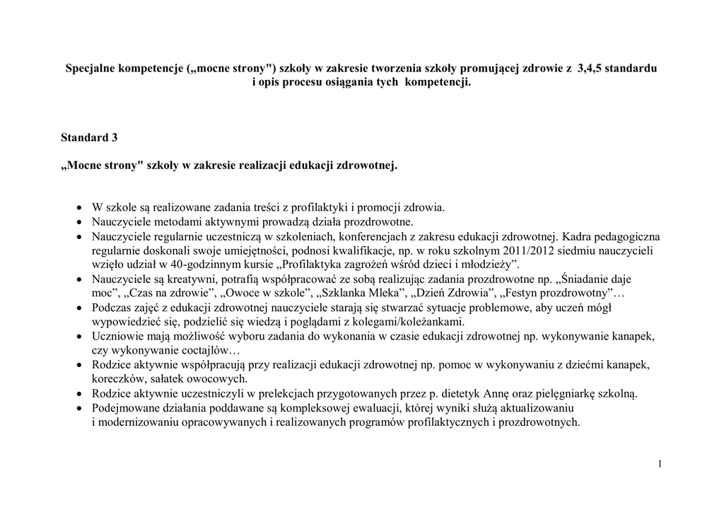 Specjalne kompetencje („mocne strony") szkoły w zakresie tworzenia szkoły promującej zdrowie z 3,4,5 standardu i opis procesu osiągania tych kompetencji. Standard 3 „Mocne strony" szkoły w zakresie realizacji edukacji zdrowotnej. W szkole są realizowane zadania treści z profilaktyki i promocji zdrowia. Nauczyciele metodami aktywnymi prowadzą działa prozdrowotne. Nauczyciele regularnie uczestniczą w szkoleniach, konferencjach z zakresu edukacji zdrowotnej. Kadra pedagogiczna regularnie doskonali swoje umiejętności, podnosi kwalifikacje, np. w roku szkolnym 2011/2012 siedmiu nauczycieli wzięło udział w 40-godzinnym kursie „Profilaktyka zagrożeń wśród dzieci i młodzieży”. Nauczyciele są kreatywni, potrafią współpracować ze sobą realizując zadania prozdrowotne np. „Śniadanie daje moc”, „Czas na zdrowie”, „Owoce w szkole”, „Szklanka Mleka”, „Dzień Zdrowia”, „Festyn prozdrowotny”… Podczas zajęć z edukacji zdrowotnej nauczyciele starają się stwarzać sytuacje problemowe, aby uczeń mógł wypowiedzieć się, podzielić się wiedzą i poglądami z kolegami/koleżankami. Uczniowie mają możliwość wyboru zadania do wykonania w czasie edukacji zdrowotnej np. wykonywanie kanapek, czy wykonywanie coctajlów… Rodzice aktywnie współpracują przy realizacji edukacji zdrowotnej np. pomoc w wykonywaniu z dziećmi kanapek, koreczków, sałatek owocowych. Rodzice aktywnie uczestniczyli w prelekcjach przygotowanych przez p. dietetyk Annę oraz pielęgniarkę szkolną. Podejmowane działania poddawane są kompleksowej ewaluacji, której wyniki służą aktualizowaniu i modernizowaniu opracowywanych i realizowanych programów profilaktycznych i prozdrowotnych. 1 W ramach edukacji zdrowotnej są prowadzone m.in. zajęcia rekreacyjno – sportowe dla dziewcząt i chłopców, wycieczki rowerowe, wycieczki piesze po okolicy, nordic walking - wspólne marsze terenowe (nauczyciele, uczniowie, rodzice), aerobic organizowany dla nauczycieli i rodziców (integracja i promocja zdrowego trybu życia). Opis procesu osiągania tych kompetencji W ramach Szkoły Promującej Zdrowie w roku szkolnym 2012/2013 zrealizowano ogólnopolski program „Czas na Zdrowie”, którym celem było propagowanie i utrwalanie wzorców pozytywnych zachowań. W realizacji zadań było widoczne duże zaangażowanie uczniów np.. opracowywanie sprawozdań i umieszczanie ich na stronie internetowej programu. Szkoła zajęła 18 miejsce ogólnopolskim rankingu. Opracowano również program zaznajomienia społeczności szkolnej z zasadami zdrowego odżywiania. Systematycznie realizuje się programy prozdrowotne oraz z zakresu profilaktyki uzależnień. Szkoła utrzymuje współpracę z lokalnymi instytucjami i organizacjami działającymi na rzecz dziecka. Dorobek Szkoły Promującej Zdrowie systematycznie prezentowany jest na forum szkolnym i lokalnym (np. prezentacje multimedialne „Zdrowe odżywianie inwestycja w przyszłość” – ARR oraz PSSE w Opolu, udział w Pikniku „Moje Zdrowie w Twoich Rękach” - MDK, „Dniach Młodych Twórców”- MDK). Systematyczna ewaluacja wskazuje osiągnięte sukcesy oraz obszary wymagające dalszej pracy. Podkreśla potrzebę zaktywizowania szerszej grupy rodziców. 2 Standard 4 „Mocne strony" szkoły w zakresie klimatu społecznego. Placówka posiada kadrę o wysokich kwalifikacjach, większość uzyskała stopień nauczyciela dyplomowanego. Ze względu na bardzo zróżnicowane trudne środowisko, co potwierdzają badania ankietowe, szkoła kładzie nacisk na sprawy profilaktyczno-wychowawcze i opiekuńcze. Specyficzne dla osiedli problemy to: duże bezrobocie, przesuwające się granice ubóstwa obejmujące coraz większą liczbę rodzin, wzrost liczby rodzin dysfunkcyjnych, wzrost oczekiwań i roszczeń rodziców wobec szkoły dotyczących rozwiązywania różnych problemów, wzrost liczby dzieci przejawiających zachowania ryzykowne. Szkoła wychodząc naprzeciw potrzebom środowiska opracowuje i wdraża systemowe programy profilaktyczne i prozdrowotne. Wyniki przeprowadzonych ankiet świadczą o tym, że uczniowie czują się w szkole dobrze i bezpiecznie. Jako dobrą stronę szkoły rodzice wskazują: - podmiotowe podejście do ucznia, - przyjazną atmosferę panującą w placówce, - zadowolonych nauczycieli z pracy, - dobry klimat w stosunkach międzyludzkich. „Słabe strony” szkoły Wskaźnik 3,3 wśród pracowników szkoły, którzy nie są nauczycielami (poczucie przeciążenia praca w szkole i stres w pracy)wynika stąd, że w szkołach podstawowych obowiązuje kalkulator, który ogranicza liczbę etatów w administracji i obsłudze. Nastąpiły cięcia w etatach, natomiast powierzchnia szkoły nie uległa zmianie. 3 Standard 5 „Mocne strony" środowiska fizycznego szkoły. Szkoła posiada dobrą bazę rekreacyjno-sportową: dużą sale gimnastyczną, salę do gimnastyki korekcyjnej, pełnowymiarowe boisko, plac zabaw, tereny zielone. Szkoła organizuje różnorodne i atrakcyjne zajęcia pozalekcyjne, ze szczególnym uwzględnieniem zajęć sportowych: - ćwiczenia rytmiczno-ruchowe dla dziewcząt, - zajęcia z elementami lekkoatletyki, - gry i zabawy zespołowe (siatkówka, piłka nożna, koszykówka), - gry i zabawy ruchowe i ogólnorozwojowe dla dzieci młodszych, - turnieje sportowe. Zajęcia sportowe wpisują się w realizację działań profilaktycznych opisanych w Szkolnym Programie Profilaktyki. Są również integralnym elementem projektów Szkoły Promującej Zdrowie i Szkoły bez Przemocy. Zajęcia sportowe są realizowane także w ramach zajęć MOS, każdy uczeń może uczestniczyć w zajęciach sportowych i odnosić swoje indywidualne sukcesy. Ta forma zajęć cieszysz się ogromnym zainteresowaniem wśród uczniów i rodziców. Zajęcia sportowe prowadzone są przez wysoko wykwalifikowaną kadrę pedagogiczną systematycznie doskonalącą swoje umiejętności. Prowadzone zajęcia podlegają komp