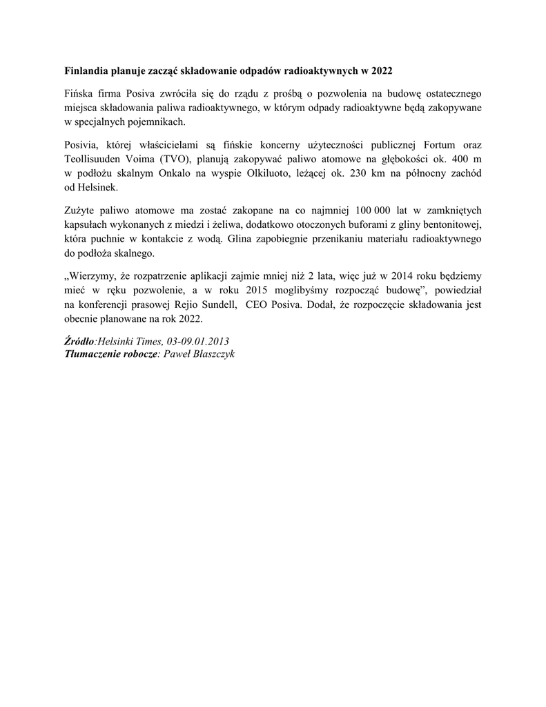 Finlandia planuje zacząć składowanie odpadów radioaktywnych w 2022 Fińska firma Posiva zwróciła się do rządu z prośbą o pozwolenia na budowę ostatecznego miejsca składowania paliwa radioaktywnego, w którym odpady radioaktywne będą zakopywane w specjalnych pojemnikach. Posivia, której właścicielami są fińskie koncerny użyteczności publicznej Fortum oraz Teollisuuden Voima (TVO), planują zakopywać paliwo atomowe na głębokości ok. 400 m w podłożu skalnym Onkalo na wyspie Olkiluoto, leżącej ok. 230 km na północny zachód od Helsinek. Zużyte paliwo atomowe ma zostać zakopane na co najmniej 100 000 lat w zamkniętych kapsułach wykonanych z miedzi i żeliwa, dodatkowo otoczonych buforami z gliny bentonitowej, która puchnie w kontakcie z wodą. Glina zapobiegnie przenikaniu materiału radioaktywnego do podłoża skalnego. „Wierzymy, że rozpatrzenie aplikacji zajmie mniej niż 2 lata, więc już w 2014 roku będziemy mieć w ręku pozwolenie, a w roku 2015 moglibyśmy rozpocząć budowę”, powiedział na konferencji prasowej Rejio Sundell, CEO Posiva. Dodał, że rozpoczęcie składowania jest obecnie planowane na rok 2022. Źródło:Helsinki Times, 03-09.01.2013 Tłumaczenie robocze: Paweł Błaszczyk