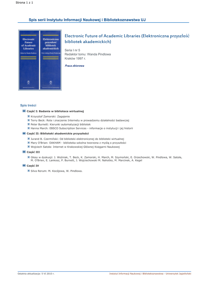Strona 1 z 1 Spis serii Instytutu Informacji Naukowej i Bibliotekoznawstwa UJ Electronic Future of Academic Libraries (Elektroniczna przyszłość bibliotek akademickich) Seria I nr 5 Redaktor tomu: Wanda Pindlowa Kraków 1997 r. Praca zbiorowa Spis treści Część I: Badania w bibliotece wirtualnej Krzysztof Zamorski: Zagajenie Terry Beck: Rola i znaczenie Internetu w prowadzeniu działalności badawczej Peter Burnett: Kierunki automatyzacji bibliotek Hanna March: EBSCO Subscription Services - informacje o instytucji i jej historii Część II: Biblioteki akademickie przyszłości Jurand B. Czermiński: Od biblioteki elektronicznej do biblioteki wirtualnej Mary O'Brian: OAKHAM - biblioteka szkolna tworzona z myślą o przyszłości Wojciech Satoła: Internet w Krakowskiej Głównej Księgarni Naukowej Część III Głosy w dyskusji: J. Woźniak, T. Beck, K. Zamorski, H. March, M. Szymoński, E. Orzechowski, W. Pindlowa, W. Satoła, M. O'Brien, E. Lankosz, P. Burnett, J. Wojciechowski M. Nahotko, M. Marcinek, A. Kegel Część IV Silva Rerum: M. Kocójowa, W. Pindlowa. Ostatnia aktualizacja: 5 VI 2010 r. Instytut Informacji Naukowej i Bibliotekoznawstwa - Uniwersytet Jagielloński