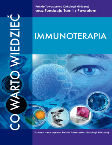 Polskie Towarzystwo Onkologii Klinicznej CO WARTO WIEDZIEĆ oraz Fundacja Tam i z Powrotem IMMUNOTERAPIA Patronat merytoryczny: Polskie Towarzystwo Onkologii Klinicznej WWW.PROGRAMEDUKACJIONKOLOGICZNEJ.PL Kierując się poczuciem odpowiedzialności i chęcią rozwoju metod wspierania chorych na nowotwory i ich rodzin, środowiska medycznego, wolontariuszy, a także będąc świadomymi potrzeby współdziałania – Polskie Towarzystwo Onkologii Klinicznej i Fundacja „Tam i z powrotem” rozpoczęły w 2014 roku realizację Programu Edukacji Onkologicznej. Program Edukacji Onkologicznej ma na celu upowszechnianie i propagowanie wiedzy o nowotworach, edukację osób zdrowych i osób z grupy podwyższonego ryzyka, osób chorych na nowotwory, ich rodzin i bliskich, a także wsparcie fachową wiedzą pracowników medycznych oraz wolontariuszy. Do współpracy przy realizacji programu zaproszeni zostali Partnerzy oraz Sponsorzy, bez których wsparcia nie byłaby możliwa kontynuacja założeń programowych. W tym miejscu chcielibyśmy serdecznie podziękować wszystkim, którzy przyczynili się do powstania programu oraz jego rozwoju. Patronaty: Naczelna Rada Pielęgniarek i Położnych Dziękujemy, że jesteście z nami! „CO WARTO WIEDZIEĆ. IMMUNOTERAPIA” Wydawca: PRIMOPRO Warszawa 2016 Opracowanie: dr n. med. Ewa Kalinka-Warzocha Konsultacja merytoryczna: Prof. dr hab. med. Maciej Krzakowski Korekta: Katarzyna Kulesza Opracowanie graficzne: Tomasz Rupociński Redakcja: Katarzyna Kowalska, Ewa Podymniak Sekretarz Redakcji: Sylwia Staniukiewicz Druk: Miller Druk Sp. z o.o. Wszelkie prawa zastrzeżone. Kopiowanie, powielanie i wykorzystywanie części lub całości informacji, zdjęć i innych treści zawartych w publikacji w jakiejkolwiek formie bez pisemnej zgody wydawcy zabronione. Niniejsza publikacja podlega ochronie na mocy prawa autorskiego. PRIMOPRO 2016 ISBN: 978-83-63398-63-7 Zapraszamy na stronę www.tamizpowrotem.org. Przekaż 1% na rzecz Fundacji Tam i z Powrotem KRS: 0000374992 Wesprzyj działania Fundacji Tam i z Powrotem dokonując wpłaty na nr konta: 97 1240 6247 1111 0010 3791 7745. FUNDACJA TAM I Z POWROTEM Fundacja powstała z potrzeby wspomożenia chorych na nowotwory pacjentów polskich szpitali. W Radzie Fundacji zasiadają wybitni onkolodzy oraz osoby pragnące poświęcić swój czas i energię realizacji działań statutowych Fundacji. Jednym z głównych zadań Fundacji jest prowadzenie szeroko pojętej działalności informacyjno-promocyjnej. Działalność ta ma na celu podniesienie w polskim społeczeństwie świadomości i wiedzy na temat chorób nowotworowych, sposobów ich leczenia i profilaktyki. Jesteśmy organizatorem akcji wydawniczej, której celem jest dostarczenie zainteresowanym – chorym i ich rodzinom – rzetelnej, fachowej wiedzy prezentowanej w zrozumiały i przystępny sposób. Wydawane w ramach akcji poradniki są bezpłatnie dystrybuowane w ośrodkach onkologicznych, szpitalach, przychodniach czy w fundacjach i stowarzyszeniach w całej Polsce. Poradniki można również bezpłatnie pobrać w formie elektronicznej. Dzięki wsparciu darczyńców, Fundacja do tej pory wydała i dostarczyła zainteresowanym ponad 1,3 miliona egzemplarzy poradników. Zainteresowanie przerosło wszelkie oczekiwania. Taki odbiór pokazuje również, jak bardzo ważne jest wsparcie przez sponsorów i partnerów. Polskie Towarzystwo Onkologii Klinicznej (PTOK) objęło akcję wydawniczą Honorowym Patronatem. Wsparcie tej inicjatywy przez wybitnych specjalistów zrzeszonych w PTOK jest ogromnym wyróżnieniem i stanowi potwierdzenie rzetelności oraz wiarygodności poradników. www.tamizpowrotem.org Na stronie uzyskasz również informacje o organizacjach niosących pomoc pacjentom z chorobami nowotworowymi i ich rodzinom, a także znajdziesz wiele informacji dotyczących samej choroby. Programy i projekty realizowane przez naszą Fundację są w pełni finansowane dzięki wsparciu darczyńców. Każdy sposób wsparcia jest dla nas ogromnym wyróżnieniem i stanowi podstawę naszej działalności. Skontaktuj się z nami: - jeśli jesteś zainteresowany współpracą z Fundacją: [email protected] - jeśli jesteś zainteresowany otrzymaniem i/lub dystrybucją poradników: [email protected] Jesteśmy też na Facebook’u i Twitterze! www.twitter.com/FundacjaTizP www.facebook.com/FundacjaTamizPowrotem Jeśli chcesz nam pomóc w poradniku znajdziesz przygotowany przekaz pocztowy. Wystarczy wyciąć, uzupełnić o wybraną kwotę, dokonać wpłaty na poczcie lub w oddziale wybranego banku i gotowe! Dziękujemy, że jesteście z nami! W ramach akcji prowadzone są dwie serie wydawnicze, w ramach których zostały wydane następujące pozycje: Seria wydawnicza „Razem zwyciężymy raka!”: 1. Po diagnozie. Poradnik dla pacjentów z chorobą nowotworową i ich rodzin. 2. Seksualność kobiety w chorobie nowotworowej. Poradnik dla kobiet i ich partnerów. 3. Seksualność mężczyzny w chorobie nowotworowej. Poradnik dla mężczyzn i ich partnerek. 4. Pomoc socjalna – przewodnik dla pacjentów z chorobą nowotworową. 5. Pielęgnacja pacjenta w chorobie nowotworowej. 6. Chemioterapia i Ty. Poradnik dla pacjentów z chorobą nowotworową i ich rodzin. 7. Żywienie a choroba nowotworowa. Poradnik dla pacjentów z chorobą nowotworową i ich rodzin. 8. Gdy bliski choruje. Poradnik dla rodzin i opiekunów osób z chorobą nowotworową. 9. Ból w chorobie nowotworowej. Poradnik dla pacjentów z chorobą nowotworową i ich rodzin. 10. Mój rodzic ma nowotwór. Poradnik dla nastolatków. 11. Radioterapia i Ty. Poradnik dla pacjentów z chorobą nowotworową i ich rodzin. 12. Moja rehabilitacja. Poradnik dla pacjentów z chorobą nowotworową i ich rodzin. 13. Życie po nowotworze. Poradnik dla osób po przebytej chorobie. Seria wydawnicza „Co warto wiedzieć”: Co warto wiedzieć. Rak skóry, czerniak i znamiona skóry. Co warto wiedzieć. Rak płuca. Co warto wiedzieć.