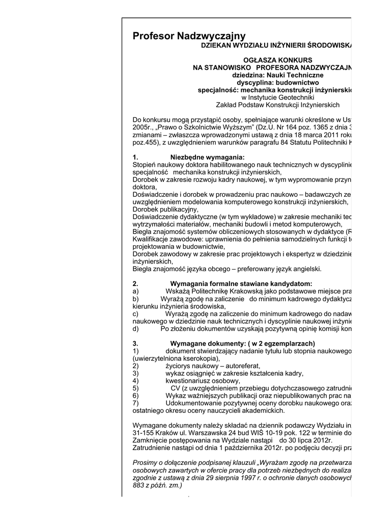 Profesor Nadzwyczajny DZIEKAN WYDZIAŁU INŻYNIERII ŚRODOWISKA OGŁASZA KONKURS NA STANOWISKO PROFESORA NADZWYCZAJNEGO dziedzina: Nauki Techniczne dyscyplina: budownictwo specjalność: mechanika konstrukcji inżynierskich w Instytucie Geotechniki Zakład Podstaw Konstrukcji Inżynierskich Do konkursu mogą przystąpić osoby, spełniające warunki określone w Ustawie z 2005r., „Prawo o Szkolnictwie Wyższym” (Dz.U. Nr 164 poz. 1365 z dnia 30.08.2 zmianami – zwłaszcza wprowadzonymi ustawą z dnia 18 marca 2011 roku (Dz. poz.455), z uwzględnieniem warunków paragrafu 84 Statutu Politechniki Krakow 1. Niezbędne wymagania: Stopień naukowy doktora habilitowanego nauk technicznych w dyscyplinie budo specjalność mechanika konstrukcji inżynierskich, Dorobek w zakresie rozwoju kadry naukowej, w tym wypromowanie przynajmnie doktora, Doświadczenie i dorobek w prowadzeniu prac naukowo – badawczych ze szcz uwzględnieniem modelowania komputerowego konstrukcji inżynierskich, Dorobek publikacyjny, Doświadczenie dydaktyczne (w tym wykładowe) w zakresie mechaniki teoretycz wytrzymałości materiałów, mechaniki budowli i metod komputerowych, Biegła znajomość systemów obliczeniowych stosowanych w dydaktyce (Robot, Kwalifikacje zawodowe: uprawnienia do pełnienia samodzielnych funkcji technic projektowania w budownictwie, Dorobek zawodowy w zakresie prac projektowych i ekspertyz w dziedzinie kons inżynierskich, Biegła znajomość języka obcego – preferowany język angielski. 2. Wymagania formalne stawiane kandydatom: a) Wskażą Politechnikę Krakowską jako podstawowe miejsce pracy, b) Wyrażą zgodę na zaliczenie do minimum kadrowego dydaktycznego kierunku inżynieria środowiska, c) Wyrażą zgodę na zaliczenie do minimum kadrowego do nadawania s naukowego w dziedzinie nauk technicznych i dyscyplinie naukowej inżynieria śro d) Po złożeniu dokumentów uzyskają pozytywną opinię komisji konkursow 3. Wymagane dokumenty: ( w 2 egzemplarzach) 1) dokument stwierdzający nadanie tytułu lub stopnia naukowego dokto (uwierzytelniona kserokopia), 2) życiorys naukowy – autoreferat, 3) wykaz osiągnięć w zakresie kształcenia kadry, 4) kwestionariusz osobowy, 5) CV (z uwzględnieniem przebiegu dotychczasowego zatrudnienia), 6) Wykaz ważniejszych publikacji oraz niepublikowanych prac naukowo 7) Udokumentowanie pozytywnej oceny dorobku naukowego oraz dyda ostatniego okresu oceny nauczycieli akademickich. Wymagane dokumenty należy składać na dziennik podawczy Wydziału inżynier 31-155 Kraków ul. Warszawska 24 bud WIŚ 10-19 pok. 122 w terminie do dnia 2 Zamknięcie postępowania na Wydziale nastąpi do 30 lipca 2012r. Zatrudnienie nastąpi od dnia 1 października 2012r. po podjęciu decyzji przez JM Prosimy o dołączenie podpisanej klauzuli „Wyrażam zgodę na przetwarzanie mo osobowych zawartych w ofercie pracy dla potrzeb niezbędnych do realizacji pro zgodnie z ustawą z dnia 29 sierpnia 1997 r. o ochronie danych osobowych (Dz. 883 z późń. zm.) Wydział Inżynierii Środowiska Politechniki Krakowskiej zastrzega sobie możliwo Wydział Inżynierii Środowiska Politechniki Krakowskiej zastrzega sobie możliwo jedynie z wybranymi kandydatami oraz prawo do powiadamiania o podjęciu dec obsadzenia stanowiska jedynie wybranego kandydata. © Wydział Inżynierii Środowiska http://www.wis.pk.edu.pl/