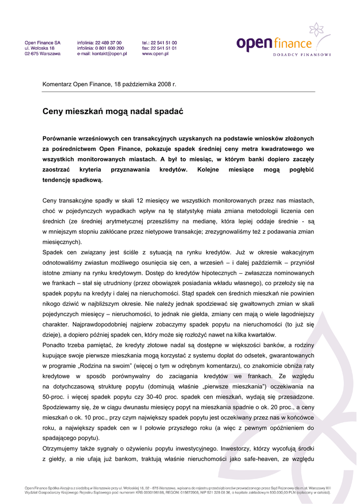 Komentarz Open Finance, 18 października 2008 r. Ceny mieszkań mogą nadal spadać Porównanie wrześniowych cen transakcyjnych uzyskanych na podstawie wniosków złożonych za pośrednictwem Open Finance, pokazuje spadek średniej ceny metra kwadratowego we wszystkich monitorowanych miastach. A był to miesiąc, w którym banki dopiero zaczęły zaostrzać kryteria przyznawania kredytów. Kolejne miesiące mogą pogłębić tendencję spadkową. Ceny transakcyjne spadły w skali 12 miesięcy we wszystkich monitorowanych przez nas miastach, choć w pojedynczych wypadkach wpływ na tę statystykę miała zmiana metodologii liczenia cen średnich (ze średniej arytmetycznej przeszliśmy na medianę, która lepiej oddaje średnie - są w mniejszym stopniu zakłócane przez nietypowe transakcje; zrezygnowaliśmy też z podawania zmian miesięcznych). Spadek cen związany jest ściśle z sytuacją na rynku kredytów. Już w okresie wakacyjnym odnotowaliśmy zwiastun możliwego osunięcia się cen, a wrzesień – i dalej październik – przyniósł istotne zmiany na rynku kredytowym. Dostęp do kredytów hipotecznych – zwłaszcza nominowanych we frankach – stał się utrudniony (przez obowiązek posiadania wkładu własnego), co przełoży się na spadek popytu na kredyty i dalej na nieruchomości. Stąd spadek cen średnich mieszkań nie powinien nikogo dziwić w najbliższym okresie. Nie należy jednak spodziewać się gwałtownych zmian w skali pojedynczych miesięcy – nieruchomości, to jednak nie giełda, zmiany cen mają o wiele łagodniejszy charakter. Najprawdopodobniej najpierw zobaczymy spadek popytu na nieruchomości (to już się dzieje), a dopiero później spadek cen, który może się rozłożyć nawet na kilka kwartałów. Ponadto trzeba pamiętać, że kredyty złotowe nadal są dostępne w większości banków, a rodziny kupujące swoje pierwsze mieszkania mogą korzystać z systemu dopłat do odsetek, gwarantowanych w programie „Rodzina na swoim” (więcej o tym w odrębnym komentarzu), co znakomicie obniża raty kredytowe w sposób porównywalny do zaciągania kredytów we frankach. Ze względu na dotychczasową strukturę popytu (dominują właśnie „pierwsze mieszkania”) oczekiwania na 50-proc. i więcej spadek popytu czy 30-40 proc. spadek cen mieszkań, wydają się przesadzone. Spodziewamy się, że w ciągu dwunastu miesięcy popyt na mieszkania spadnie o ok. 20 proc., a ceny mieszkań o ok. 10 proc., przy czym największy spadek popytu jest oczekiwany przez nas w końcówce roku, a największy spadek cen w I połowie przyszłego roku (a więc z pewnym opóźnieniem do spadającego popytu). Otrzymujemy także sygnały o ożywieniu popytu inwestycyjnego. Inwestorzy, którzy wycofują środki z giełdy, a nie ufają już bankom, traktują właśnie nieruchomości jako safe-heaven, ze względu na gwarancję własności. Oczekujemy, że popyt inwestycyjny będzie wsparciem dla rynku mieszkaniowego zwłaszcza wobec oczekiwanego wzrostu rentowności z inwestycji pod wynajem. Jeśli chodzi o podażową stronę rynku, to mamy do czynienia z pewnego rodzaju paniką wśród deweloperów, którzy zawieszają kolejne projekty. W ciągu 12-18 miesięcy może to skutkować niewystarczającą podażą nowych mieszkań i zahamowaniem tempa spadku cen. W dalszej perspektywie możliwe jest ponowne ożywienie popytu zwłaszcza, gdyby udało się zrealizować zapowiedzi wejścia Polski do strefy euro, co ponownie obniżyłoby koszty kredytów. Również spadająca inflacja może pomóc zarówno w zbijaniu cen mieszkań (tańsze będą materiały budowlane, a być może także robocizna) jak i ożywieniu popytu ze względu na spadek stóp procentowych. miasto ceny za mkw. w 09.2008 r. (mediana) ceny za mkw. w 09.2007 r. (mediana) zmiana roczna ceny nieruchomości w 2008 (mediana) ceny nieruchomości w 2007 (mediana) Gdańsk 5 933 6 052 -1,96% 310 000 300 000 Kraków 6 492 6 875 -5,57% 300 000 320 000 Poznań 6 163 6 522 -5,50% 300 000 350 000 Warszawa 8 333 8 607 -3,18% 420 000 430 000 Wrocław 6 103 6 424 -4,99% 325 000 317 500 *ceny transakcyjne na podstawie wniosków założonych za pośrednictwem Open Finance W przypadku Gdyni, Katowic, Lublina i Olsztyna wolumen zarejestrowanych transakcji jest zbyt niski, aby mówić o wyznaczeniu precyzyjnych średnich cen transakcyjnych. Dlatego podane ceny należy traktować wyłącznie poglądowo – jako średnie zawartych ostatnio transakcji za pośrednictwem Open Finance, a w żadnym wypadku nie powinny być traktowane jako średnie dla całego rynku w tych miastach. miasto ceny za mkw. w 09.2008 r. (mediana) ceny za mkw. w 09.2007 r. (mediana) zmiana roczna ceny nieruchomości w 2008 (mediana) ceny nieruchomości w 2007 (mediana) Gdynia 6 465 6 667 -3,02% 310 000 313 000 Katowice 4 000 5 152 -22,35% 200 000 250 000 Lublin 4 858 5 393 -9,92% 238 867 286 161 Olsztyn 4 987 5 578 -10,60% 231 500 222 500 *ceny transakcyjne na podstawie wniosków założonych za pośrednictwem Open Finance Podsumowanie Ze względu na obecną sytuację na rynku kredytowym, jak również na rynkach finansowych i obawy o znaczące spowolnienie gospodarcze tak w ujęciu globalnym jak i lokalnym (dla Polski), sądzimy że w okresie najbliższych kwartałów należy spodziewać się spadku cen transakcyjnych wymuszonego zmniejszającym się popytem na nieruchomości, przy jednocześnie wciąż wysokiej podaży w początkowym okresie tego spadku. Ustabilizowania cen oczekujemy nie wcześniej niż w przyszłym roku na poziomach nawet o 10 proc. niższych niż obecnie. W dalszej perspektywie wpływ na tendencje cenowe na rynku mieszkań będzie miała odporność polskiej gospodarki na obecne zawirowania na rynkach finansowych i spodziewane w przyszłym roku spowolnienie gospodarcze. Emil Szweda, analityk Open Finance