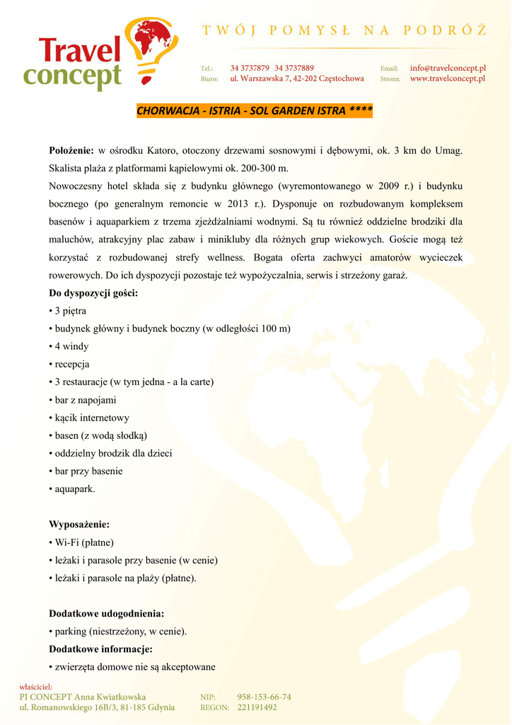 CHORWACJA - ISTRIA - SOL GARDEN ISTRA **** Położenie: w ośrodku Katoro, otoczony drzewami sosnowymi i dębowymi, ok. 3 km do Umag. Skalista plaża z platformami kąpielowymi ok. 200-300 m. Nowoczesny hotel składa się z budynku głównego (wyremontowanego w 2009 r.) i budynku bocznego (po generalnym remoncie w 2013 r.). Dysponuje on rozbudowanym kompleksem basenów i aquaparkiem z trzema zjeżdżalniami wodnymi. Są tu również oddzielne brodziki dla maluchów, atrakcyjny plac zabaw i minikluby dla różnych grup wiekowych. Goście mogą też korzystać z rozbudowanej strefy wellness. Bogata oferta zachwyci amatorów wycieczek rowerowych. Do ich dyspozycji pozostaje też wypożyczalnia, serwis i strzeżony garaż. Do dyspozycji gości: • 3 piętra • budynek główny i budynek boczny (w odległości 100 m) • 4 windy • recepcja • 3 restauracje (w tym jedna - a la carte) • bar z napojami • kącik internetowy • basen (z wodą słodką) • oddzielny brodzik dla dzieci • bar przy basenie • aquapark. Wyposażenie: • Wi-Fi (płatne) • leżaki i parasole przy basenie (w cenie) • leżaki i parasole na plaży (płatne). Dodatkowe udogodnienia: • parking (niestrzeżony, w cenie). Dodatkowe informacje: • zwierzęta domowe nie są akceptowane • taksa klimatyczna (w cenie) Zakwaterowanie: Pokoje bardzo dobrze urządzone, z wanną lub prysznicem, WC, suszarką, telefonem, TV sat., minibarem, sejfem, klimatyzacją i balkonem. Wyżywienie: śniadanie lub 2 posiłki. Bufet śniadaniowy i kolacyjny oraz sałatkowy, pokazy kulinarne. W sezonie bufety tematyczne. Rozrywka: dzienny i wieczorny hotelowy program animacyjny. Sport: w niewielkiej odległości centrum sportowe Sport Art oferujące za opłatą: 14 kortów tenisowych, minigolf, tenis stołowy, boisko do gier zespołowych i wiele innych atrakcji. Wellness: bez opłaty: kryty basen (ok. 25 x 6 m), siłownia. Za opłatą: (od 16 lat): strefa spa The Body Holidays: rozmaite sauny, jacuzzi i zabiegi pielęgnacyjne. Dzieci: • mini klub 5-13 lat, • klub dla nastolatków 14-17 lat w lipcu i sierpniu • aquapark z 3 zjeżdżalniami • brodziki • plac zabaw • łóżeczko