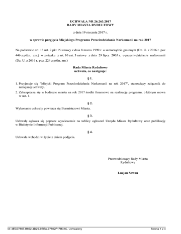 UCHWAŁA NR 26.263.2017 RADY MIASTA RYDUŁTOWY z dnia 19 stycznia 2017 r. w sprawie przyjęcia Miejskiego Programu Przeciwdziałania Narkomanii na rok 2017 Na podstawie art. 18 ust. 2 pkt 15 ustawy z dnia 8 marca 1990 r. o samorządzie gminnym (Dz. U. z 2016 r. poz 446 z późn. zm.) w związku z art. 10 ust. 3 ustawy z dnia 29 lipca 2005 r. o przeciwdziałaniu narkomanii (Dz. U. z 2016 r. poz. 224 z późn. zm.) Rada Miasta Rydułtowy uchwala, co następuje: § 1. 1. Przyjmuje się "Miejski Program Przeciwdziałania Narkomanii na rok 2017", stanowiący załącznik do niniejszej uchwały. 2. Zabezpiecza się w budżecie miasta na rok 2017 środki finansowe na realizację programu, o którym mowa w ust. 1. § 2. Wykonanie uchwały powierza się Burmistrzowi Miasta. § 3. Uchwałę ogłasza się poprzez wywieszenie na tablicy ogłoszeń Urzędu Miasta Rydułtowy oraz publikację w Biuletynie Informacji Publicznej. § 4. Uchwała wchodzi w życie z dniem podjęcia. Przewodniczący Rady Miasta Rydułtowy Lucjan Szwan Id: 4EC07867-B922-4D29-9EEA-97802F1FB31C. Uchwalony Strona 1 z 4 Załącznik do Uchwały Nr 26.263.2017 Rady Miasta Rydułtowy z dnia 19 stycznia 2017 r. MIEJSKI PROGRAM PRZECIWDZIAŁANIA NARKOMANII NA ROK 2017 Rozdział I CELE 1. Ograniczanie rozpowszechniania się problemów narkomanii oraz zażywania narkotyków poprzez działalność wychowawczą, edukacyjną i zapobiegawczą; 2. Ograniczanie szkód zdrowotnych i społecznych związanych z zażywaniem narkotyków oraz uzależnieniem od narkotyków; 3. Ograniczanie ryzyka sięgania po narkotyki wśród młodzieży poprzez poznawanie przyczyn narkomanii i skutków zażywania narkotyków; 4. Rozwijanie szkolnych i środowiskowych programów profilaktycznych; 5. Wspieranie i organizowanie imprez profilaktycznych; 6. Wzbogacanie bazy materialnej, organizacyjnej i merytorycznej dla realizacji programu, kształtowanie nawyków trzeźwego, aktywnego i zdrowego spędzania czasu wolnego, bez nałogów. Rozdział II CHARAKTERYSTYKA PROBLEMU NARKOMANII W MIEŚCIE RYDUŁTOWY W Mieście Rydułtowy na pobyt stały zameldowanych jest 20 450 mieszkańców. Kobiet zameldowanych jest 10 638, co stanowi 52% ogółu. Mężczyzn zameldowanych jest 9812, co stanowi 48% ogółu. Szczegółową strukturę mieszkańców przedstawia poniższa tabela*. Kryterium Ogółem % Kobiety % Mężczyźni % Wiek przedprodukcyjny (od 0-18 lat) 3 758 18 1 791 17 1 967 20 Wiek produkcyjny- kobiety (od 19-60 lat) mężczyźni (od 19-65 lat) 12 240 60 5 905 56 6 335 64,6 Wiek poprodukcyjny kobiety (61 lat i powyżej) mężczyźni (66 lat i powyżej) 4 452 22 2 942 28 1 510 15,4 razem 20 450 100 10 638 52 9 812 48 * dane Referatu Ewidencji Ludności i Działalności Gospodarczej Urzędu Miasta Rydułtowy na dzień 6.12.2016 r. Biorąc pod uwagę przedstawione dane, można stwierdzić, iż miasto Rydułtowy wpisuje się w ogólne tendencje zmian demograficznych jakie zachodzą w Polsce. Podkreślić należy, iż zgodnie z danymi Powiatowego Urzędu Pracy w Wodzisławiu Śląskim, na koniec III kwartału 2016 r. w Rydułtowach było 660 osób bezrobotnych w tym 431 kobiet. Osoby te stanowią grupę zagrożoną problemami substancji psychoaktywnych. Brak możliwości znalezienia pracy, bądź długotrwałe pozostawanie bez pracy może spowodować sięgnięcie po substancje psychoaktywne, a to z kolei może wzmóc agresję, przemoc wobec rodziny i najbliższego otoczenia. W 2014 r. na zlecenie Miasta Rydułtowy przeprowadzona została „Diagnoza lokalnych zagrożeń społecznych”. Badania te zostały zrealizowane przez firmę „Małopolskie Centrum Profilaktyki” z Krakowa. Spośród grupy badanych mieszkańców gminy (450 osób) 72% nie zna w swoim otoczeniu nikogo, kto 1 Id: 4EC07867-B922-4D29-9EEA-97802F1FB31C. Uchwalony Strona 1 z 3 używałby narkotyków – choć pozostali wskazują na znajomość od kilku do dziesięciu osób używających narkotyki. Młodzi ludzie – uczniowie szkół w gminie – stosunkowo rzadko przyznają się do doświadczeń z narkotykami. Spośród grupy badanych uczniów średnio 8% (36 uczniów) przyznało, że miało kontakt z narkotykami. W tym 2% uczniów szkół podstawowych, 8% uczniów gimnazjum oraz 17% licealistów. 65% uczniów deklarujących używanie narkotyków wskazuje, że sięgają po nie jedynie okazjonalnie. Pozostali deklarują częstsze sięganie po narkotyki – 8% sięga po nie kilka razy w miesiącu, kolejne 4% uczniów używających narkotyki sięga po nie co najmniej kilka razy w tygodniu, a 22% codziennie lub prawie codziennie. Rozdział III ZADANIA 1. Prowadzenie profilaktycznej działalności informacyjnej, edukacyjnej oraz szkoleniowej w zakresie rozwiązywania problemów narkomanii, w szczególności dla dzieci i młodzieży: 1) organizowanie w szkołach i placówkach oświatowo - wychowawczych na terenie gminy programów profilaktycznych dla dzieci, młodzieży oraz ich rodziców; 2) prowadzenie konkursów z zakresu szeroko rozumianej profilaktyki uzależnień; 3) udział w lokalnych i ogólnopolskich kampaniach edukacyjnych związanych z profilaktyką narkotykową i rozwiązywaniem problemów społecznych związanych z uzależnieniami; 4) dofinansowanie zajęć dla dzieci i młodzieży z rodzin dysfunkcyjnych, prowadzenie zajęć profilaktyczno – wychowawczych; 5) prowadzenie zajęć opiekuńczo - wychowawczych i rekreacyjno - sportowych z elementami profilaktyki uzależnień dla dzieci i młodzieży w różnych kategoriach wiekowych; 6) upowszechnianie materiałów edukacyjnych o tematyce antynarkotykowej - plakaty, ulotki, informatory, organizowanie promocji filmów i książek; 7) współorganizowanie szkoleń w zakresie rozwiązywania problemów narkomanii dla poszczególnych grup zawodowych z terenu gminy: pracowników oświaty, policji, ośrodka pomocy społecznej, administracji samorządowej i innych podmiotów; 8) promowanie zdrowego stylu życia wolnego od narkotyków i innych używek oraz r