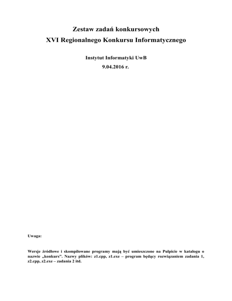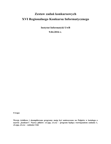 Zestaw zadań konkursowych XVI Regionalnego Konkursu Informatycznego Instytut Informatyki UwB 9.04.2016 r. Uwaga: Wersje źródłowe i skompilowane programy mają być umieszczone na Pulpicie w katalogu o nazwie „konkurs”. Nazwy plików: z1.cpp, z1.exe – program będący rozwiązaniem zadania 1, z2.cpp, z2.exe – zadania 2 itd. Zadanie 1: Rozgrzewka Jeden z uczestników Regionalnego Konkursu Informatycznego, który kiedyś zakwalifikował się do drugiego etapu konkursu po wejściu do siedziby Instytutu Informatyki w Białymstoku, miał wątpliwości, czy powinien wejść na piętro gdzie miał się odbyć finał konkursu. Wchodził kilka schodów w górę, po czym zawracał się i schodził kilka z nich, aby następnie znów odzyskać wiarę w siebie i wejść kilka stopni w górę, itd. Po kilku minutach, gdy trzeci raz zszedł ze schodów, przypomniał sobie, że konkurs i tak jest na parterze, więc nie musi „zdobywać schodów”. Postanowił jednak, że jako zadanie na rozgrzewkę obliczy liczbę dróg jakie mógł przebyć po schodach. Oczywiście w budynku nie ma zejścia do podziemi. Dodatkowo rozpoczął zdobywanie schodów z parteru oraz zszedł 3 razy na parter. Założył, że schodów w górę jest dostatecznie dużo oraz, że przebył łącznie 30 schodów w górę i 30 schodów w dół. Jego program okazał się jednak zbyt wolny aby to obliczyć i przez pierwszą godzinę przeanalizował tylko 1 biliard przypadków. Twoim zadaniem jest napisać program, który przeliczy liczbę możliwych dróg w czasie nie dłuższym niż 10 sekund. Dane wejściowe: Pierwsza linia zawiera w sobie liczbę zejść na parter (nie przekraczającą 20) oraz łączną liczbę przebytych schodów w górę i w dół (liczba parzysta, nie przekraczająca 200). Dane wyjściowe: Liczba dróg, która nie przekracza zakresu long long int. Przykład 1 Dane wejściowe: 3 10 Dane wyjściowe: 9 Przykład 2 Dane wejściowe: 3 60 Dane wyjściowe: 738494264901008 Zadanie 2: A-65 a-97 447A69656369 77 7A65726F776365 6A65737A637A65 6E6965 706F747261666961 7069736163 616E69 6C69637A7963 616C65 706F747261666961 6F62736C756769776163 6B6F6D7075746572 4E617069737A 70726F737479 6B616C6B756C61746F72 6B746F7279 6265647A6965 756D69616C 74796C6B6F 646F6461776163 69 6F64656A6D6F776163 6C69637A6279 63616C6B6F77697465 Wejscie (nie ma zadnych spacji) 4A65646E61 6C696E6961 7A 70727A796B6C6164656D 646F 6F626C69637A656E6961 Wyjscie 4A65646E61 6C69637A6261 63616C6B6F77697461 626564616361 77796E696B69656D 6F626C69637A656E 69 7A6E616B 6B6F6E6361 6C696E6969 Przyklad: Wejście 1-2+(1-(3--12)) Wyjście -15 Zadanie 3: Horror Niestety, najgorszy kosmiczny kicz z horrorów Eda Wooda, próbuje zawładnąć Ziemią. Kosmici, właściwie nie podobni do niczego, sieją spustoszenie na całym globie. Na szczęście dzielnym agentom CIA i analitykom NSA udało się opracować plan walki z przybyszami. Otóż okazało się, że krwiożerczy kosmici poruszają się luźnymi trójkami. Aby ich unicestwić należy znaleźć się w tej samej odległości od każdego z nich i trzema strzałami zakończyć brutalny żywot bestii. Potem trzeba przemieścić się w okolice kolejnej trójki kosmitów i znowu oddać tylko trzy strzały itd. Problem jest tylko jeden – czy strzelec wyborowy NAVY Seals zdąży przed wykryciem? Od pierwszego wystrzału ma on ograniczony czas na dokonanie rzezi pobliskich krwiożerczych bestii z kosmosu. Dane wejściowe W pierwszej linii dwie liczby xs i ys oznaczające współrzędne miejsca startu strzelca. W drugiej linii n – liczba grup (trójek) kosmitów do unicestwienia. W kolejnych n liniach po 6 liczb (oddzielonych spacjami) oznaczających odpowiednio współrzędne xp i yp kolejnych potworów w grupie. W ostatniej linii czas t (w sekundach), w którym musi zostać wykonane zadanie. Każdy strzał to 1 sekunda, a pomiędzy punktami, z których oddawane są strzały, strzelec porusza się z prędkością 2 m/s. Wszystkie współrzędne wyrażone są w metrach. Należy założyć, że pole walki opisane jest współrzędnymi dodatnimi (I ćwiartka układu współrzędnych). Strzelec porusza się pomiędzy trójkami w kolejności zadanej danymi wejściowymi i zawsze najkrótszą drogą. Ograniczenia: wszystkie współrzędne znajdują się w zakresie 0 x,y 1000. Potwory w danej grupie nie mogą znajdować się współliniowo. Dane wyjściowe Jeżeli strzelec zdąży wykonać zadanie to należy na standardowym wyjściu wypisać słowo „WIN” i po spacji czas, który mu jeszcze pozostał. Jeżeli nie zdąży – słowo „DEFEAT” i po spacji czas, którego zabrakło do wykonania zadania. Czas powinien być wyświetlony z dokładnością do dwóch miejsc po przecinku. Przykład: Dane wejściowe: 13 3 3 10 5 8 5 9 7 7 2 3 2 5 5 4 8 2 6 2 8 30 Dane wyjściowe: DEFEAT 9.07 Zadanie 4: Superkolejka W nowo otwartym centrum obliczeniowym UCO panuje straszny tłok – wszyscy naukowcy chcą mieć dostęp do najnowszego superkomputera wyposażonego w dużą liczbę jednakowych rdzeni obliczeniowych. Zasypany ogromną ilością zadań system kolejkowy przestał działać. Administratorzy muszą szybko opracować skuteczny sposób podziału zadań tak, by maksymalnie wykorzystać czas dostępu użytkowników do supermaszyny. Twoje zadanie polega na tym, aby pomóc im podzielić listę zadań do wykonania w taki sposób, aby było wiadomo, które rdzenie wykonują dane zadanie i wszystkie zadania skończyły się możliwie szybko. Dane wejściowe W pierwszej linii znajduje się ilość rdzeni superkomputera 1 < r < 1000, które można wykorzystać. Pozostałe linie (max. 100000) zawierają unikalny identyfikator kolejnego zadania (napis o długości od 1 do 8 znaków utworzony z małych liter, cyfr lub znaków podkreślenia) i oddzielony spacją odpowiadający mu czas działania 0 < t < 10000 (w pełnych sekundach). Dane wyjściowe W kolejnych r liniach powinny się znaleźć listy identyfikatorów zadań do wykon