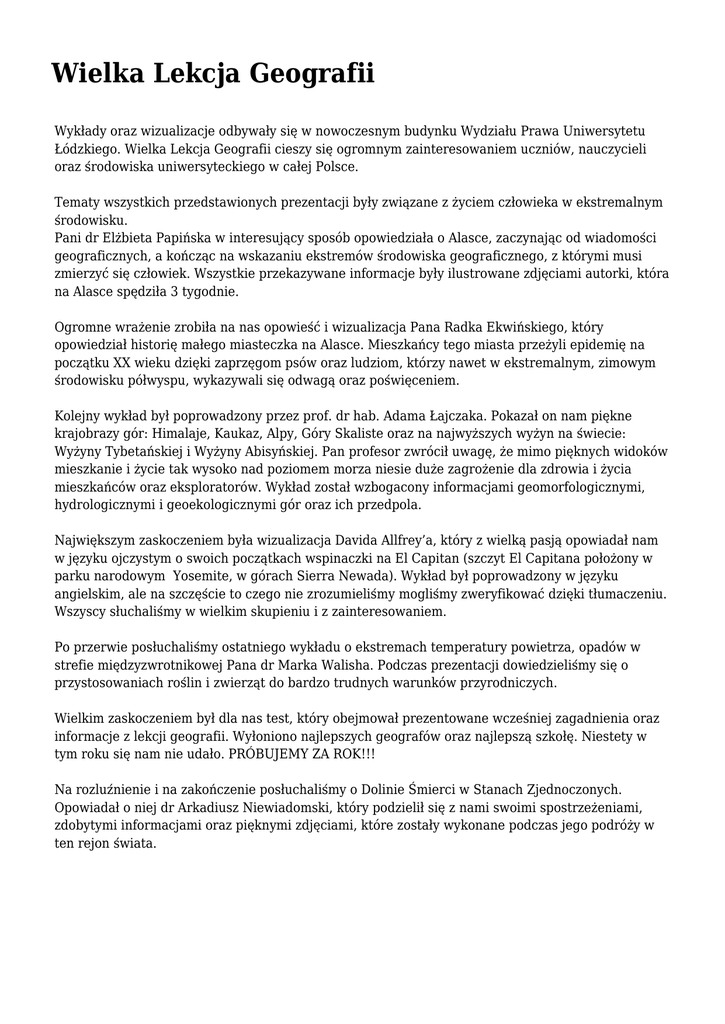 Wielka Lekcja Geografii Wykłady oraz wizualizacje odbywały się w nowoczesnym budynku Wydziału Prawa Uniwersytetu Łódzkiego. Wielka Lekcja Geografii cieszy się ogromnym zainteresowaniem uczniów, nauczycieli oraz środowiska uniwersyteckiego w całej Polsce. Tematy wszystkich przedstawionych prezentacji były związane z życiem człowieka w ekstremalnym środowisku. Pani dr Elżbieta Papińska w interesujący sposób opowiedziała o Alasce, zaczynając od wiadomości geograficznych, a kończąc na wskazaniu ekstremów środowiska geograficznego, z którymi musi zmierzyć się człowiek. Wszystkie przekazywane informacje były ilustrowane zdjęciami autorki, która na Alasce spędziła 3 tygodnie. Ogromne wrażenie zrobiła na nas opowieść i wizualizacja Pana Radka Ekwińskiego, który opowiedział historię małego miasteczka na Alasce. Mieszkańcy tego miasta przeżyli epidemię na początku XX wieku dzięki zaprzęgom psów oraz ludziom, którzy nawet w ekstremalnym, zimowym środowisku półwyspu, wykazywali się odwagą oraz poświęceniem. Kolejny wykład był poprowadzony przez prof. dr hab. Adama Łajczaka. Pokazał on nam piękne krajobrazy gór: Himalaje, Kaukaz, Alpy, Góry Skaliste oraz na najwyższych wyżyn na świecie: Wyżyny Tybetańskiej i Wyżyny Abisyńskiej. Pan profesor zwrócił uwagę, że mimo pięknych widoków mieszkanie i życie tak wysoko nad poziomem morza niesie duże zagrożenie dla zdrowia i życia mieszkańców oraz eksploratorów. Wykład został wzbogacony informacjami geomorfologicznymi, hydrologicznymi i geoekologicznymi gór oraz ich przedpola. Największym zaskoczeniem była wizualizacja Davida Allfrey’a, który z wielką pasją opowiadał nam w języku ojczystym o swoich początkach wspinaczki na El Capitan (szczyt El Capitana położony w parku narodowym Yosemite, w górach Sierra Newada). Wykład był poprowadzony w języku angielskim, ale na szczęście to czego nie zrozumieliśmy mogliśmy zweryfikować dzięki tłumaczeniu. Wszyscy słuchaliśmy w wielkim skupieniu i z zainteresowaniem. Po przerwie posłuchaliśmy ostatniego wykładu o ekstremach temperatury powietrza, opadów w strefie międzyzwrotnikowej Pana dr Marka Walisha. Podczas prezentacji dowiedzieliśmy się o przystosowaniach roślin i zwierząt do bardzo trudnych warunków przyrodniczych. Wielkim zaskoczeniem był dla nas test, który obejmował prezentowane wcześniej zagadnienia oraz informacje z lekcji geografii. Wyłoniono najlepszych geografów oraz najlepszą szkołę. Niestety w tym roku się nam nie udało. PRÓBUJEMY ZA ROK!!! Na rozluźnienie i na zakończenie posłuchaliśmy o Dolinie Śmierci w Stanach Zjednoczonych. Opowiadał o niej dr Arkadiusz Niewiadomski, który podzielił się z nami swoimi spostrzeżeniami, zdobytymi informacjami oraz pięknymi zdjęciami, które zostały wykonane podczas jego podróży w ten rejon świata.