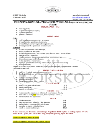32-020 Wieliczka Ul. Górsko 14/16 www.hotelgorsko.pl [email protected] Tel./fax. +48 12 278-39-27 CHRZCINY/KOMUNIA/PRZYJĘCIE WESELNE/impreza integracyjna MENU PRZYSTAWKA – 10 zł łosoś z jajkiem, snopek szparagowy z szynką, szynka w galarecie, galaretka drobiowa. OBIAD – 40 zł ZUPA rosół z makaronem serwowany w wazach, krem z brokuł z groszkiem ptysiowym, krem z białych warzyw z groszkiem ptysiowym, krem z pieczarek z grzankami czosnkowymi. II DANIE Pieczeń wieprzowa w sosie własnym, kotlet schabowy w pierzynie, de Volaille faszerowany pieczarkami, papryką czerwoną i serem żółtym, złocista nóżka z kurczaka, roladki drobiowe faszerowane szpinakiem w sosie serowym, bitka wieprzowa w sosie własnym, łódka drobiowa z warzywami, kotlet po góralsku faszerowany serem żółtym, ogórkiem i musztardą, łosoś grillowany. Dodatek skrobiowy do wyboru: ziemniaki, frytki, ryż z warzywami, kluski śląskie + zestaw 3 surówek sezonowych. ZIMNA PŁYTA – 40 zł/os wędliny: 3 rodzaje podawane na paterach, sery 2 rodzaje sałatek : do wyboru jarzynowa, grecka, selerowa, porowa, brokułowa, sos tatarski, sałatka owocowa, śledzie w śmietanie i oleju, galaretka drobiowa 2 rodzaje pieczywa: jasne i ciemne. CIEPŁE DANIE barszcz czerwony z krokietem, 8 zł boeuf strogonow, 10 zł karczek w naleśniku 15 zł NAPOJE – 10 zł woda mineralna z cytryną w dzbankach podawana do obiadu, 1 litr soku na osobę lub coca-cola, fanta i sprite ( 2 szt./os.), kawa i herbata bez ograniczeń. DESER sałatka owocowa, 6 zł kolorowy puchar z galaretką i bitą śmietaną, 6 zł puchar lodowy z owocami i bitą śmietaną, 6 zł szarlotka na ciepło z bitą śmietaną, 8 zł sernik na lustrze malinowym 10 zł W cenę wliczone jest dekoracja Sali i obsługa. Po godzinie 21:00 dopłata za obsługę wynosi 100 zł/h. Dzieci do lat 3 gratis, od 4 -10 lat 50% ceny, bezpłatny parking, kącik dla dzieci. Dodatkowa porcja mięsa 8 szł/szt Dodatkowo płatne pokrowce na krzesła 5 zł/szt