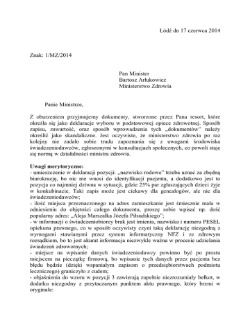 Łódź dn 17 czerwca 2014 Znak: 1/MZ/2014 Pan Minister Bartosz Arłukowicz Ministerstwo Zdrowia Panie Ministrze, Z oburzeniem przyjmujemy dokumenty, stworzone przez Pana resort, które określa się jako deklaracje wyboru w podstawowej opiece zdrowotnej. Sposób zapisu, zawartość, oraz sposób wprowadzenia tych „dokumentów” należy określić jako skandaliczne. Jest oczywiste, że ministerstwo zdrowia po raz kolejny nie zadało sobie trudu zapoznania się z uwagami środowiska świadczeniodawców, zgłoszonymi w konsultacjach społecznych, co powoli staje się normą w działalności ministra zdrowia. Uwagi merytoryczne: - umieszczenie w deklaracji pozycji: „nazwisko rodowe” trzeba uznać za zbędną biurokrację, bo nic nie wnosi do identyfikacji pacjenta, a dodatkowo jest to pozycja co najmniej dziwna w sytuacji, gdzie 25% par zgłaszających dzieci żyje w konkubinacie. Taki zapis może jest ciekawy dla genealogów, ale nie dla świadczeniodawców; - ilość miejsca przeznaczonego na adres zamieszkanie jest śmiesznie mała w odniesieniu do objętości całego dokumentu, proszę sobie wpisać np. dość popularny adres: „Aleja Marszałka Józefa Piłsudskiego”; - w informacji o świadczeniobiorcy brak jest imienia, nazwiska i numeru PESEL opiekuna prawnego, co w sposób oczywisty czyni taką deklarację niezgodną z wymogami stawianymi przez system informatyczny NFZ i ze zdrowym rozsądkiem, bo to jest akurat informacja niezwykle ważna w procesie udzielania świadczeń zdrowotnych; - miejsce na wpisanie danych świadczeniodawcy powinno być po prostu miejscem na pieczątkę firmową, bo wpisanie tych danych przez pacjenta bez błędu będzie (dzięki wspaniałym zapisom o przedsiębiorstwach podmiotu leczniczego) graniczyło z cudem; - objaśnienia do wzoru w pozycji 3 zawierają zupełnie niezrozumiały bełkot, w dodatku niezgodny z przytaczanym punktem aktu prawnego, który brzmi w oryginale: 1b. Świadczeniobiorca, dokonując wyboru, o którym w ust. 1a, może wybrać: 1) lekarza, o którym mowa w art. 55 ust. 2a, pielęgniarkę podstawowej opieki zdrowotnej lub położną podstawowej opieki zdrowotnej u tego samego świadczeniodawcy albo u różnych świadczeniodawców, albo 2) lekarza, o którym mowa w art. 55 ust. 2a, pielęgniarkę podstawowej opieki zdrowotnej lub położną podstawowej opieki zdrowotnej będących świadczeniodawcami. Uwagi pozostałe: - wprowadzenie przepisów jest skandaliczne! Rozporządzenie zostało podpisane 11 czerwca, a ukazało się w Dzienniku Ustaw w dn. 13 czerwca 2014, który to dzień, dziwnym zbiegiem okoliczności, był piątkiem. Rozporządzenie obowiązuje od 15 czerwca, czyli niedzieli. Świadczeniodawcy podstawowej opieki zdrowotnej nie pracują w soboty i niedziele, co zapewne panu ministrowi umknęło, a to oznacza, że nie mieli możliwości zaopatrzyć się w nowe druki. Również dostosowanie oprogramowania nie było w tym czasie możliwe, a nowy wzór deklaracji nie spełnia warunków do przesyłania go do NFZ co oznacza, że i pacjenci i świadczeniodawcy zostali postawieni wobec faktu niemożności realizacji takiego prawa; - trzy osobne deklaracje to zwiększenie obowiązków administracyjnych personelu, bo pacjent samodzielnie nie jest w stanie takiego druku wypełnić. Argumentacje ministerstwa co do konieczności wprowadzenia osobnych druków należy uznać za śmieszne, albo wręcz obraźliwe dla naszych pacjentów którzy, wg ministerstwa zdrowia, jakoby nie wiedzą co podpisują; - trzy osobne deklaracje to konieczność złożenia podpisów w trzech miejscach na jednej deklaracji(!!!) czyli przy składaniu deklaracji do lekarza, pielęgniarki i położnej aż dziewięciu podpisów!!! Dla np. czteroosobowej rodziny z dwoma córkami są to więc 22 strony deklaracji, 11 wpisów o danych osobowych i 35 podpisów!!!; - trzy deklaracje to zwiększenie ilości dokumentacji papierowej w sytuacji, gdzie cały czas mówimy o elektronizacji; - trzy deklaracje to również narażenie na złość pacjentów, którzy nie odmówią sobie komentarza na ten temat; - trzy deklaracje to wreszcie tony papieru i tysiące zużytych rocznie tonerów do drukarek co, oprócz wpływu na środowisko, wpływa na finanse poradni; Panie ministrze, Zdecydowanie protestujemy przeciwko takiemu prawu i takiemu jego wprowadzaniu. Deklaracje w tej postaci są bublami prawnymi i graficznymi. Żądamy unieważnienia wzorów deklaracji wprowadzonych ostatnim rozporządzeniem i wprowadzenia nowych, po konsultacji z ekspertami, którymi na pewno są świadczeniodawcy opieki podstawowej. W oczekiwaniu na pilną reakcję Jarosław Krawczyk Prezes Porozumienia Łódzkiego – Łódzkiego Związku Pracodawców Ochrony Zdrowia