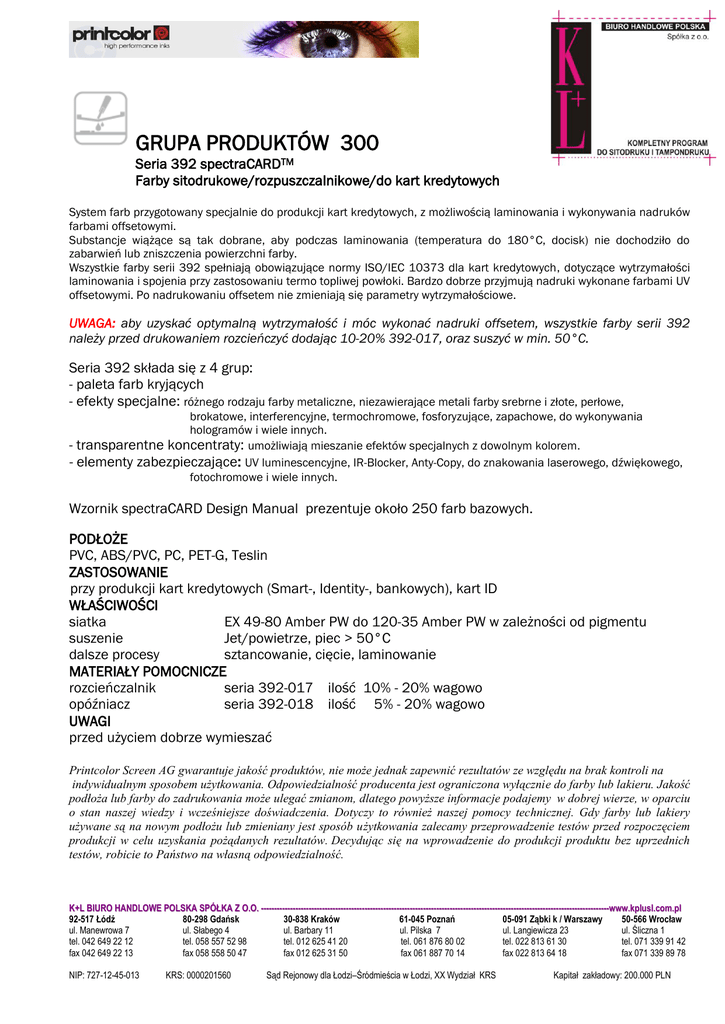 GRUPA PRODUKTÓW 300 Seria 392 spectraCARDTM Farby sitodrukowe/rozpuszczalnikowe/do kart kredytowych System farb przygotowany specjalnie do produkcji kart kredytowych, z możliwością laminowania i wykonywania nadruków farbami offsetowymi. Substancje wiążące są tak dobrane, aby podczas laminowania (temperatura do 180°C, docisk) nie dochodziło do zabarwień lub zniszczenia powierzchni farby. Wszystkie farby serii 392 spełniają obowiązujące normy ISO/IEC 10373 dla kart kredytowych, dotyczące wytrzymałości laminowania i spojenia przy zastosowaniu termo topliwej powłoki. Bardzo dobrze przyjmują nadruki wykonane farbami UV offsetowymi. Po nadrukowaniu offsetem nie zmieniają się parametry wytrzymałościowe. UWAGA: aby uzyskać optymalną wytrzymałość i móc wykonać nadruki offsetem, wszystkie farby serii 392 należy przed drukowaniem rozcieńczyć dodając 10-20% 392-017, oraz suszyć w min. 50°C. Seria 392 składa się z 4 grup: - paleta farb kryjących - efekty specjalne: różnego rodzaju farby metaliczne, niezawierające metali farby srebrne i złote, perłowe, brokatowe, interferencyjne, termochromowe, fosforyzujące, zapachowe, do wykonywania hologramów i wiele innych. - transparentne koncentraty: umożliwiają mieszanie efektów specjalnych z dowolnym kolorem. - elementy zabezpieczające: UV luminescencyjne, IR-Blocker, Anty-Copy, do znakowania laserowego, dźwiękowego, fotochromowe i wiele innych. Wzornik spectraCARD Design Manual prezentuje około 250 farb bazowych. PODŁOŻE PVC, ABS/PVC, PC, PET-G, Teslin ZASTOSOWANIE przy produkcji kart kredytowych (Smart-, Identity-, bankowych), kart ID WŁAŚCIWOŚCI siatka EX 49-80 Amber PW do 120-35 Amber PW w zależności od pigmentu suszenie Jet/powietrze, piec > 50°C dalsze procesy sztancowanie, cięcie, laminowanie MATERIAŁY POMOCNICZE rozcieńczalnik seria 392-017 ilość 10% - 20% wagowo opóźniacz seria 392-018 ilość 5% - 20% wagowo UWAGI przed użyciem dobrze wymieszać Printcolor Screen AG gwarantuje jakość produktów, nie może jednak zapewnić rezultatów ze względu na brak kontroli na indywidualnym sposobem użytkowania. Odpowiedzialność producenta jest ograniczona wyłącznie do farby lub lakieru. Jakość podłoża lub farby do zadrukowania może ulegać zmianom, dlatego powyższe informacje podajemy w dobrej wierze, w oparciu o stan naszej wiedzy i wcześniejsze doświadczenia. Dotyczy to również naszej pomocy technicznej. Gdy farby lub lakiery używane są na nowym podłożu lub zmieniany jest sposób użytkowania zalecamy przeprowadzenie testów przed rozpoczęciem produkcji w celu uzyskania pożądanych rezultatów. Decydując się na wprowadzenie do produkcji produktu bez uprzednich testów, robicie to Państwo na własną odpowiedzialność. K+L BIURO HANDLOWE POLSKA SPÓŁKA Z O.O. -----------------------------------------------------------------------------------------------------------------------------------www.kplusl.com.pl 92-517 Łódź 80-298 Gdańsk 30-838 Kraków 61-045 Poznań 05-091 Ząbki k / Warszawy 50-566 Wrocław ul. Manewrowa 7 ul. Słabego 4 ul. Barbary 11 ul. Pilska 7 ul. Langiewicza 23 ul. Śliczna 1 tel. 042 649 22 12 tel. 058 557 52 98 tel. 012 625 41 20 tel. 061 876 80 02 tel. 022 813 61 30 tel. 071 339 91 42 fax 042 649 22 13 fax 058 558 50 47 fax 012 625 31 50 fax 061 887 70 14 fax 022 813 64 18 fax 071 339 89 78 NIP: 727-12-45-013 KRS: 0000201560 Sąd Rejonowy dla Łodzi–Śródmieścia w Łodzi, XX Wydział KRS Kapitał zakładowy: 200.000 PLN