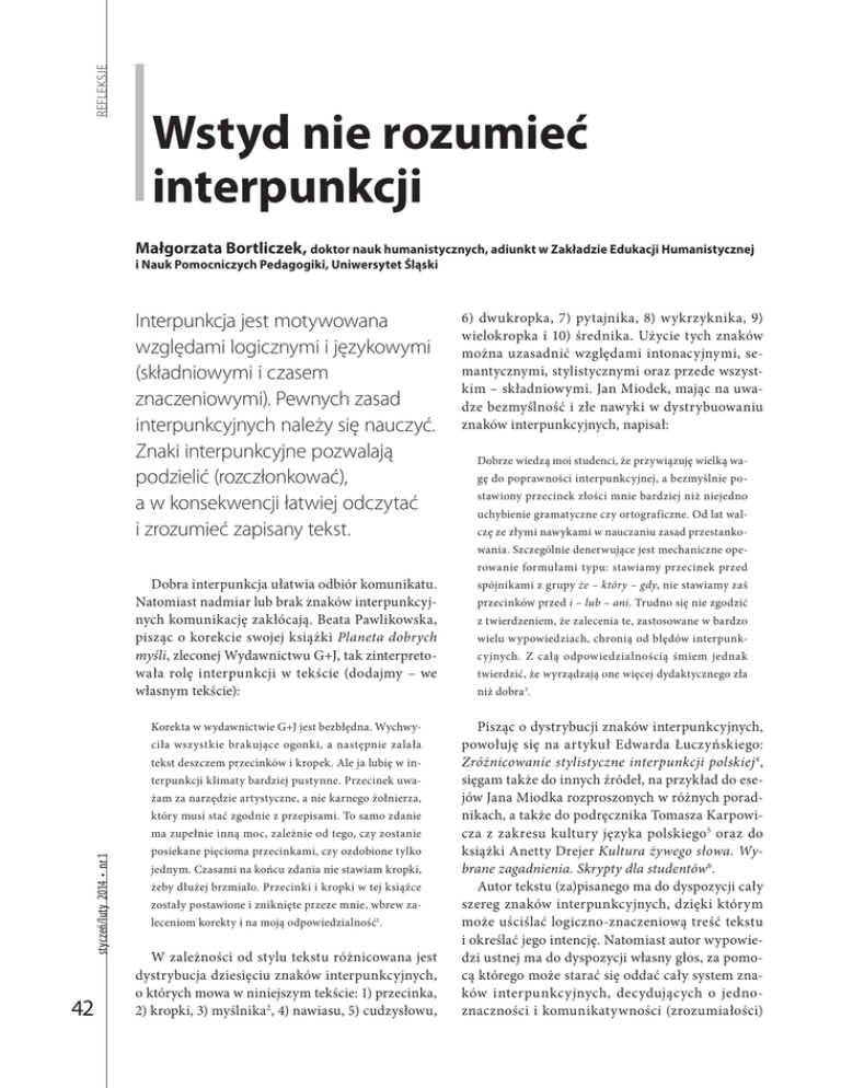 REFLEKSJE Wstyd nie rozumieć interpunkcji Małgorzata Bortliczek, doktor nauk humanistycznych, adiunkt w Zakładzie Edukacji Humanistycznej i Nauk Pomocniczych Pedagogiki, Uniwersytet Śląski Interpunkcja jest motywowana względami logicznymi i językowymi (składniowymi i czasem znaczeniowymi). Pewnych zasad interpunkcyjnych należy się nauczyć. Znaki interpunkcyjne pozwalają podzielić (rozczłonkować), a w konsekwencji łatwiej odczytać i zrozumieć zapisany tekst. 6) dwukropka, 7) pytajnika, 8) wykrzyknika, 9) wielokropka i 10) średnika. Użycie tych znaków można uzasadnić względami intonacyjnymi, semantycznymi, stylistycznymi oraz przede wszystkim – składniowymi. Jan Miodek, mając na uwadze bezmyślność i złe nawyki w dystrybuowaniu znaków interpunkcyjnych, napisał: Dobrze wiedzą moi studenci, że przywiązuję wielką wagę do poprawności interpunkcyjnej, a bezmyślnie postawiony przecinek złości mnie bardziej niż niejedno uchybienie gramatyczne czy ortograficzne. Od lat walczę ze złymi nawykami w nauczaniu zasad przestankowania. Szczególnie denerwujące jest mechaniczne ope- Dobra interpunkcja ułatwia odbiór komunikatu. Natomiast nadmiar lub brak znaków interpunkcyjnych komunikację zakłócają. Beata Pawlikowska, pisząc o korekcie swojej książki Planeta dobrych myśli, zleconej Wydawnictwu G+J, tak zinterpretowała rolę interpunkcji w tekście (dodajmy – we własnym tekście): Korekta w wydawnictwie G+J jest bezbłędna. Wychwyciła wszystkie brakujące ogonki, a następnie zalała tekst deszczem przecinków i kropek. Ale ja lubię w interpunkcji klimaty bardziej pustynne. Przecinek uważam za narzędzie artystyczne, a nie karnego żołnierza, który musi stać zgodnie z przepisami. To samo zdanie styczeń/luty 2014 • nr 1 ma zupełnie inną moc, zależnie od tego, czy zostanie 42 posiekane pięcioma przecinkami, czy ozdobione tylko jednym. Czasami na końcu zdania nie stawiam kropki, żeby dłużej brzmiało. Przecinki i kropki w tej książce zostały postawione i zniknięte przeze mnie, wbrew zaleceniom korekty i na moją odpowiedzialność1. W zależności od stylu tekstu różnicowana jest dystrybucja dziesięciu znaków interpunkcyjnych, o których mowa w niniejszym tekście: 1) przecinka, 2) kropki, 3) myślnika 2, 4) nawiasu, 5) cudzysłowu, rowanie formułami typu: stawiamy przecinek przed spójnikami z grupy że – który – gdy, nie stawiamy zaś przecinków przed i – lub – ani. Trudno się nie zgodzić z twierdzeniem, że zalecenia te, zastosowane w bardzo wielu wypowiedziach, chronią od błędów interpunkcyjnych. Z całą odpowiedzialnością śmiem jednak twierdzić, że wyrządzają one więcej dydaktycznego zła niż dobra 3. Pisząc o dystrybucji znaków interpunkcyjnych, powołuję się na artykuł Edwarda Łuczyńskiego: Zróżnicowanie stylistyczne interpunkcji polskiej4 , sięgam także do innych źródeł, na przykład do esejów Jana Miodka rozproszonych w różnych poradnikach, a także do podręcznika Tomasza Karpowicza z zakresu kultury języka polskiego5 oraz do książki Anetty Drejer Kultura żywego słowa. Wybrane zagadnienia. Skrypty dla studentów6. Autor tekstu (za)pisanego ma do dyspozycji cały szereg znaków interpunkcyjnych, dzięki którym może uściślać logiczno-znaczeniową treść tekstu i określać jego intencję. Natomiast autor wypowiedzi ustnej ma do dyspozycji własny głos, za pomocą którego może starać się oddać cały system znaków interpunkcyjnych, decydujących o jednoznaczności i komunikatywności (zrozumiałości) Z kolei po cyfrach rzymskich w ogóle nie stawiamy kropek (por. zapis daty: 14 VII 1777). Druga uwaga poprawnościowa dotyczy dystrybucji kropki po skrótach od wyrażeń: i tak dalej, i tym podobne, między innymi, na przykład, tak zwany. Jerzy Bralczyk wyjaśnia sposób tworzenia i zapisu tych skrótów następująco: REFLEKSJE przekazywanej treści7. Anetta Drejer, powołując się na książkę Jerzego Krama Zarys kultury żywego słowa 8, podaje klasyfikację znaków interpunkcyjnych uzależnioną od linii głosu mówcy; zarówno w wypadku linii wznoszącej (antykadencji), jak i w wypadku linii opadającej (kadencji) znane powszechnie znak i interpunkcy jne plasują się w trzech kategoriach: znaki milczenia, znaki intonacyjne, znaki modulacyjne. Obrazowo ilustruje to poniższa tabela. Reguły polskiej interpunkcji zakładają, że w skrócie od wyrażenia wielowyrazowego, jeżeli kolejne wyrazy zaczynają się od spółgłosek, powinna być tylko jedna Linia głosu Linia głosu wznosząca Linia głosu opadająca Kategoria znaku – antykadencja – kadencja kropka – na końcu całego skrótu. Dlatego w skrótach Znaki milczenia (pauzy) zwany mamy jedną kropkę: np., itd., itp., tzw., a w skró- , – … ;:. Znaki intonacyjne ? ! Znaki modulacyjne „ ” () Źródło: na podstawie J. Kram, Zarys kultury żywego słowa…, s. 115. cie od wyrażenia między innymi, gdzie drugi wyraz zaczyna się na samogłoskę – mamy kropki po każdym wyrazie. W skrótach od nazw wielowyrazowych kropek w ogóle nie stawiamy12. Reguły interpunkcyjne określają także kwestię obligatoryjnego niestawiania kropki. Zalecenie to dotyczy między innymi kart tytułowych i okładek książek. A zatem kropki zwyczajowo nie stawia się: 1) po nazwisku autora (przy czym na stronie tytułowej nie powinny znajdować się inicjały, a zwłaszcza – inicjał pierwszego imienia autora), 2) po tytule książki, 3) po ewentualnym podtytule, 4) po nazwie wydawnictwa, a także 5) po roku wydania. Dodać należy, że kropki nie stawia się także po tytułach artykułów publikowanych w różnych periodykach oraz po tytułach rozdziałów i podrozdziałów w książkach13. Myślnik Myślnik (zwany w przeszłości też pauzą) oznacza przerwę w toku mowy dłuższą niż przerwa oddana przecinkiem. Podwojony myślnik (np. Miał talenty manualne – stwierdza Chmielewska – umiał n