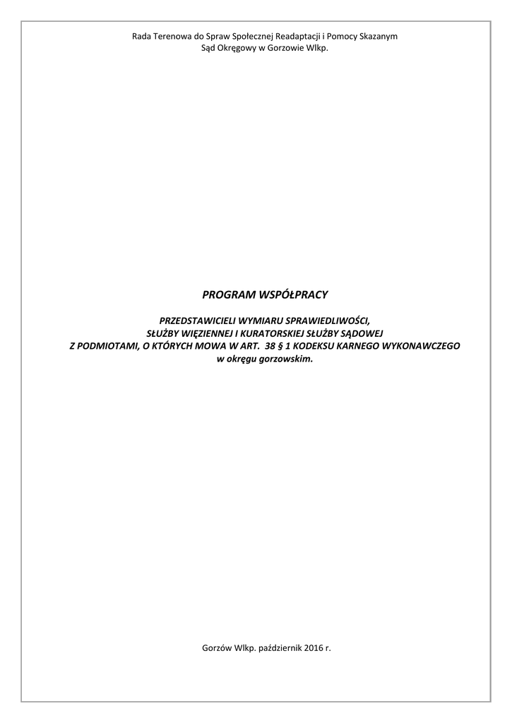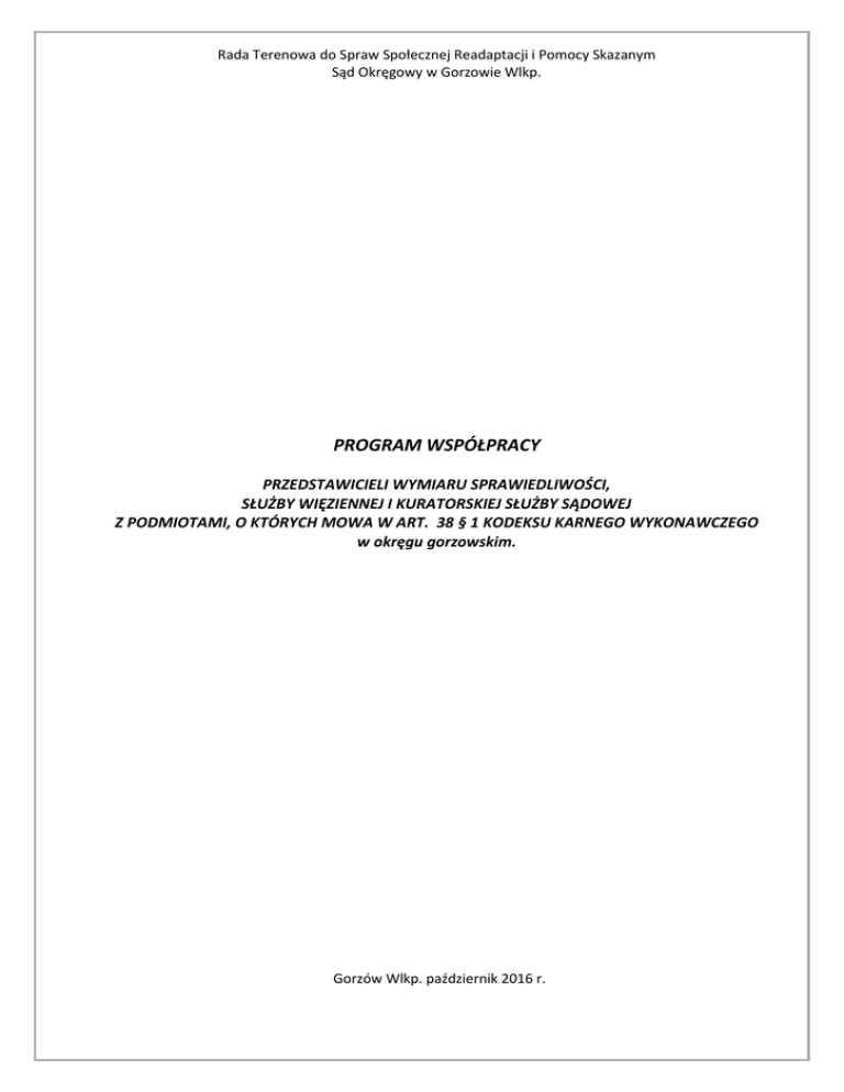 Rada Terenowa do Spraw Społecznej Readaptacji i Pomocy Skazanym Sąd Okręgowy w Gorzowie Wlkp. PROGRAM WSPÓŁPRACY PRZEDSTAWICIELI WYMIARU SPRAWIEDLIWOŚCI, SŁUŻBY WIĘZIENNEJ I KURATORSKIEJ SŁUŻBY SĄDOWEJ Z PODMIOTAMI, O KTÓRYCH MOWA W ART. 38 § 1 KODEKSU KARNEGO WYKONAWCZEGO w okręgu gorzowskim. Gorzów Wlkp. październik 2016 r. Rada Terenowa do Spraw Społecznej Readaptacji i Pomocy Skazanym Sąd Okręgowy w Gorzowie Wlkp. Spis treści WSTĘP ...................................................................................................................................................................... 2 1. ZAŁOŻENIA PROGRAMU .................................................................................................................................. 5 2. REALIZACJA ZAŁOŻEO PROGRAMU .................................................................................................................. 7 3. BENEFICJENCI I PARTNERZY ............................................................................................................................. 9 4. ZASOBY .......................................................................................................................................................... 11 5. ANALIZA MOCNYCH I SŁABYCH STRON .......................................................................................................... 15 6. OCZEKIWANE EFEKTY ..................................................................................................................................... 16 SPIS ZAŁĄCZNIKÓW: ............................................................................................................................................... 17 1 Rada Terenowa do Spraw Społecznej Readaptacji i Pomocy Skazanym Sąd Okręgowy w Gorzowie Wlkp. Wstęp Zarządzeniem Nr 434 z dnia 15 listopada 2010, zmienionym następnie w dniu 2 lipca 2013r. Wojewoda Lubuski powołał Radę Terenową ds. Społecznej Readaptacji i Pomocy Skazanym, wskazując jednocześnie obszar właściwości Sądu Okręgowego w Gorzowie Wlkp. jako objęty jej działalnością. Na tej podstawie Prezes Sądu Okręgowego w Gorzowie Wlkp. zarządzeniem Nr 1/2011 z dnia 3 stycznia 2011 powołał skład osobowy Rady Terenowej i ustanowił zasady i tryb jej funkcjonowania. Kadencja Rady ustanowiona została w Zarządzeniu Prezesa Sądu na 4 lata. Po tym czasie Zarządzeniem Nr 7/2015 z dnia 5 marca 2015r. Prezes Sądu Okręgowego powołał skład osobowy rady terenowej II kadencji, zasady i tryb jej funkcjonowania na lata 2015-2019. W składzie Rady działającej zarówno w I jak i w II kadencji znaleźli się przedstawiciele instytucji mających istotny wpływ na możliwości udzielania stosowanej pomocy skazanym i ich rodzinom oraz ich społecznej readaptacji po opuszczeniu zakładu karnego. Członkami Rady są m.in. przedstawiciele: Sądu, Prokuratury, Kuratorskiej Służby Sądowej, Policji, Wojewody Lubuskiego, Wojska Polskiego, Kuratorium Oświaty, Urzędu Pracy, Zakładów Karnych, właściwych starostów. Rada powołała Prezydium w składzie 6 osób. Do głównych zadao Rady Terenowej należy: organizowanie, inicjowanie i wspieranie przedsięwzięd służących zapobieganiu przestępczości i społecznej readaptacji skazanych; opiniowanie działalności organów rządowych i przedstawicieli społeczeostwa, podejmowanej w zakresie zapobiegania przestępczości, wykonywania orzeczeo i readaptacji społecznej skazanych oraz udzielania pomocy skazanym i ich rodzinom; koordynowanie działalności stowarzyszeo, fundacji, organizacji i instytucji oraz kościołów i związków wyznaniowych, jak również osób godnych zaufania, podejmowanej w zakresie wykonywania kar, środków karnych, zabezpieczających i zapobiegawczych; 2 Rada Terenowa do Spraw Społecznej Readaptacji i Pomocy Skazanym Sąd Okręgowy w Gorzowie Wlkp. podejmowanie, organizowanie i koordynowanie społecznej kontroli nad wykonaniem kar, środków karnych, zabezpieczających i zapobiegawczych oraz opracowywanie wyników tych kontroli; dokonywanie oceny polityki penitencjarnej; przedstawianie wniosków i opinii w sprawie podziału oraz wykorzystania środków z funduszu pomocy penitencjarnej; inicjowanie i wspieranie badao naukowych służących zapobieganiu przestępczości i społecznej readaptacji skazanych. W toku prawie postpenitencjarnej, sześcioletniej zorganizowała działalności spotkanie Rada opracowała przedstawicieli mapę zakładów pomocy karnych z przedstawicielami ośrodków pomocy społecznej, spotkanie z przedstawicielami gminnych jednostek samorządu terytorialnego, z udziałem kierowników Kuratorskiej Służby Sądowej ds. karnych w Okręgu (kara ograniczenia wolności w formie pracy społecznie użytecznej), propagowała tematykę programów korekcyjno – edukacyjnych dla sprawców przemocy w rodzinie, podejmowała działania rozwoju programów wolnościowych wobec skazanych; zorganizowała spotkanie zainteresowanych służb z p. Generałem Pawłem Nasiłowskim na temat zasad funkcjonowania systemu dozoru elektronicznego. Na skutek tych działao udało się dokonad istotnych ustaleo służących usprawnieniu udzielanej na terenie Okręgu pomocy i readaptacji skazanym, zacieśniona została współpraca pomiędzy poszczególnymi instytucjami, podniesiona świadomośd co do wzajemnych kompetencji oraz upowszechniona wiedza z różnych obszarów. Podejmowane przez Radę działania stworzyły nieformalnie działający program współpracy przedstawicieli poszczególnych instytucji na rzecz pomocy i readaptacji skazanych i ich rodzin. Sytuację tą dodatkowo usankcjonował § 4 Uchwały nr 2/2016 Rady Głównej do Spraw Społecznej Readaptacji i Pomocy Skazanym z dnia 15 marca 2016 roku w sprawie wydania rekomendacji dla Dyrektora Służby Więziennej oraz terenowych rad do spraw społecznej readaptacji i pomocy skazanym. Zgodnie z jego treścią Rada Terenowa do Spraw Społecznej R