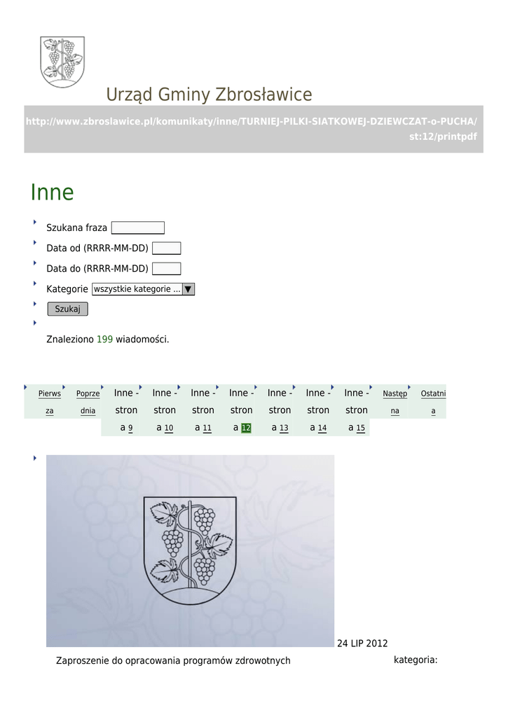 Urząd Gminy Zbrosławice http://www.zbroslawice.pl/komunikaty/inne/TURNIEJ-PILKI-SIATKOWEJ-DZIEWCZAT-o-PUCHA/ st:12/printpdf Inne Szukana fraza Data od (RRRR-MM-DD) Data do (RRRR-MM-DD) Kategorie wszystkie kategorie ... ▼ Szukaj Znaleziono 199 wiadomości. Pierws Poprze Inne - Inne - Inne - Inne - Inne - Inne - Inne - Następ Ostatni za dnia stron stron stron stron stron stron stron na a a9 a 10 a 11 a a 13 a 14 a 15 12 24 LIP 2012 Zaproszenie do opracowania programów zdrowotnych kategoria: Inne Urząd Gminy Zbrosławice zaprasza wszystkich zainteresowanych do opracowania następujących programów zdrowotnych: profilaktyka raka piersi, badanie wykrywające boleriozę, badanie gruczołu krokowego u mężczyzn (badanie prostaty). W/w programy należy opracować zgodnie z ustawą o świadczeniach opieki zdrowotnej finansowanej ze środków publicznych ( Dz. U. z 2008 r., Nr 164, poz. 1027 ) oraz muszą spełniać kryteria zawarte 16 LIP 2012 kategoria: Zmiana rozkładów jazdy MZKP Inne W związku ze Świętem Wniebowzięcia NMP w dniu 15.08.2012 r. komunikacja miejska MZKP będzie funkcjonować wg rozkładów jazdy obowiązujących w niedziele i święta bez obsługi centrów handlowych. W dniach 16 - 17.08.2012 r. autobusy kursować będą wg rozkładu jazdy na soboty ( linia nr 129 obsługiwana będzie taborem przegubowym), odstępstwem od tej reguły będą linie nr 17,80,179,180,225,246,288,625,738, które będą kursować 09 LIP 2012 Rolnicy - zgłaszajcie szkody spowodowane siłą wyższą! 06 LIP 2012 Uwaga upał, pomóż zwierzętom! 06 LIP 2012 IFUBA 2012 i NATUR & WEIN kategoria: Inne Tradycją stały się już spotkania młodych piłkarzy z zaprzyjaźnionych gmin partnerskich. W tym roku gospodarzem Międzynarodowego Turnieju Piłki Nożnej IFUBA 2012 była gmina Brackenheim. 14 czerwca do malowniczej, otoczonej winnicami miejscowości zjechała się młodzież z Francji, Włoch, Walii i Polski. Po uroczystym powitaniu i zakwaterowaniu sportowcy przystąpili do treningów, by już następnego dnia wziąć udział w 11 CZE 2012 kategoria: ODBIÓR WYNIKÓW Z MAMMOGRAFII Inne Wyniki z badań mammograficznych wykonanych w mammobusie w dniach 31 maja oraz 1 i 4 czerwca br. przy Urzędzie Gminy Zbrosławice będą do osobistego odbioru od 20 CZERWCA do 11 LIPCA br. w Urzędzie Gminy Zbrosławice -pokój nr 7 (Zbrosławice, ul. Oświęcimska 2) od poniedzialku do piątku, w godzinach od 8.00 do 14.00 Wyniki będą wydawane tylko do 11 lipca 2012r. Kobiety, które nie mogą odebrać wyników osobiście, powinny 04 CZE 2012 Wieś w fotografii kategoria: Inne Rusza konkurs fotograficzny „Wieś województwa śląskiego okiem obiektywu" Zarząd Województwa Śląskiego wraz Sekretariatem Regionalnym Krajowej Sieci Obszarów Wiejskich zapraszają do udziału w konkursie fotograficznym. Jego głównym tematem jest wieś i zmiany na niej przebiegające, jej walory kulturowe i przyrodnicze, a także osiągnięcia w rozwoju. O laury mogą rywalizować osoby, które amatorsko lub profesjonalnie zajmują 30 MAJ 2012 kategoria: Wojewódzki Ośrodek Koordynujący Inne Populacyjne Programy Wczesnego Wykrywania Raka Piersi i Szyjki Macicy pod hasłem „Gdzie się badać" podaje adresy i telefony śląskich przychodni , które wykonują bezpłatne badania profilaktyczne w ramach umów podpisanych z Narodowym Funduszem Zdrowia. Populacyjny Program Wczesnego Wykrywania Raka Piersi www.raksutka.org e-mail: [email protected] tel. 32 278 96 73 Populacyjny Program Profilaktyki i Wczesnego 29 MAJ 2012 Czy znasz działanie i korzystasz z kanałów RSS - posumowanie kategoria: Inne Podsumowanie ankiety o kanale RSS na stronie urzędu. Prawie połowa głosujących chciałaby się dowiedzieć co to takiego - najprościej mówiąc: Kanał RSS to sposób informowania użytkowników o nowych informacjach umieszczonych na stronie internetowej. Nie trzeba "wchodzić" na stronę i sprawdzać czy może ktoś coś tam umieścił. Zatrudniamy do tego czytnik kanałów RSS - prosty program, który co kilka minut w tle sprawdza 22 MAJ 2012 Niespasowani zapraszają na spektakl - Kalejdoskop uczuć Pierws Poprze Inne - Inne - Inne - Inne - Inne - Inne - Inne - Następ Ostatni za dnia stron stron stron stron stron stron stron na a a9 a 10 a 11 a a 13 a 14 a 15 12