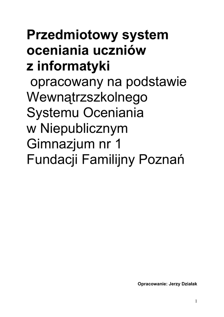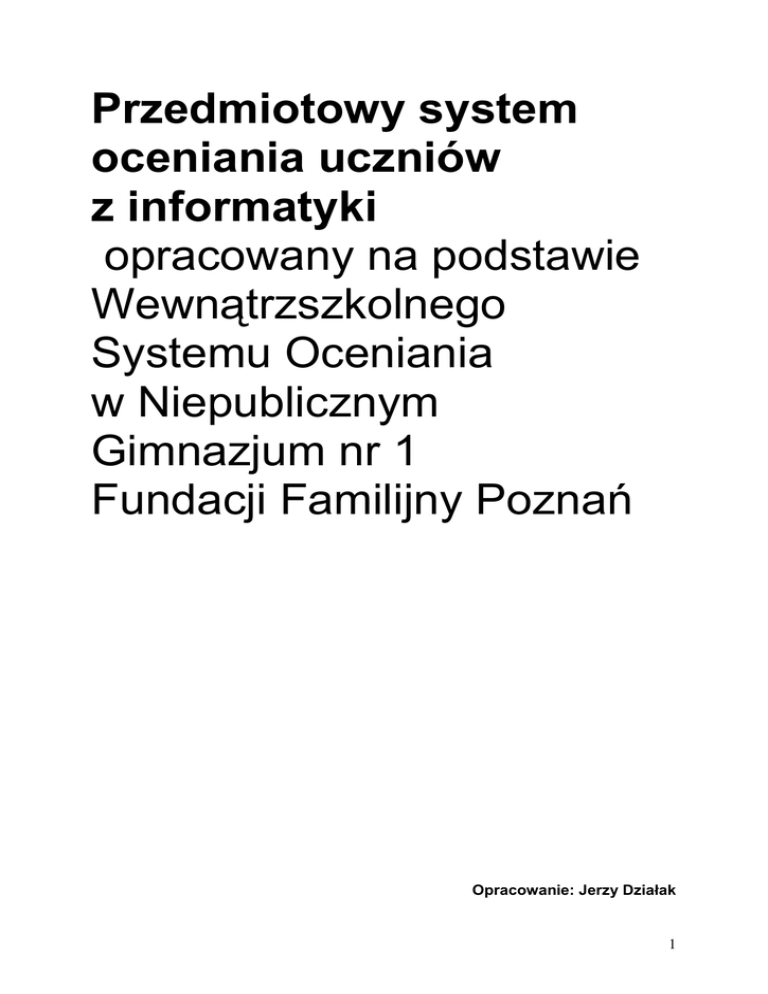 Przedmiotowy system oceniania uczniów z informatyki opracowany na podstawie Wewnątrzszkolnego Systemu Oceniania w Niepublicznym Gimnazjum nr 1 Fundacji Familijny Poznań Opracowanie: Jerzy Działak 1 1. Wymagania na poszczególne oceny. OCENA CELUJĄCA: 1. Spełnia wszystkie kryteria na ocenę bardzo dobrą 2. Ćwiczenia praktyczne wykonuje samodzielnie i bezbłędnie 3. Uświadamia sobie zagrożenia związane z grami komputerowymi. 4. Bierze czynny udział w konkursach i zajmuje na nich czołowe miejsca OCENA BARDZO DOBRA: 1. Omawia pojęcie piractwa komputerowego i jego konsekwencje. 2. Dostrzega korzyści wykorzystania komputera w codziennej pracy. 3. Obsługuje wybrane urządzenia z pomocą nauczyciela. 4. Dokonuje poprawek w pracy i zapisują zmiany. 5. Samodzielnie redaguje teksty na zadany temat. 6. Drukuje gotowe elementy i własne prace. 7. Samodzielnie wykorzystuje wyszukane informacje ze zbiorów multimedialnych. 8. Potrafi wyszukiwać informacje w Internecie na zadany temat. 9. Zna strukturę bazy danych. 10. Stosuje adresowanie względne i bezwzględne w arkuszu kalkulacyjnym OCENA DOBRA: 1. Omawia możliwości wykorzystania wyników pracy innych osób z tego samego komputera. 2. Rozumie znaczenie komputera dla rozwoju techniki. 3. Poznaje działanie i obsługę wybranych urządzeń. 4. Wykorzystuje pamięć kalkulatora do wykonywania operacji powtarzalnych. 5. Dokonuje trafnego doboru koloru, zwracają uwagę na wygląd estetyczny. 6. Tworzy samodzielnie rysunek na zadany temat. 7. Wykonuje operacje na blokach tekstu. 8. Obsługuje szkolną drukarkę. 9. Wykorzystuje programy dydaktyczne do uczenia się. 10. Rozumie wykorzystanie gier jako rozrywki z komputerem. 11. Wyszukuje informacje w Internecie. 12. Zna budowę Arkusza kalkulacyjnego. 13. Dokonuje prostych obliczeń w Arkuszu kalkulacyjnym. 14. Formatuje tekst, dostosowując go do jego przeznaczenia. OCENA DOSTATECZNA: 2 1. Opisuje prawidłowo zorganizowane stanowisko pracy. 2. Porusza się po strukturze danych. 3. Wyszukuje zbiory wykonywalne. 4. Zapisuje i odczytują pracę na dysku. 5. Zna przeznaczenie klawiszy edycyjnych. 6. Potrafi pisać polskie litery. 7. Zapisuje własne teksty na dysku. 8. Formatuje tekst. 9. Potrafi uruchomić dowolną grę i z niej korzystać. 10. Zna różne metody kopiowania. 11. Potrafi uruchomić przeglądarkę Internetową. OCENA DOPUSZCZAJĄCA: 1. Potrafi sprawnie rozpocząć i zakończyć pracę komputera. 2. Zna zasady bezpiecznego użytkowania komputera. 3. Zna główne elementy wchodzące w skład zestawu komputerowego. 4. Potrafi samodzielnie zakończyć pracę z programem. 5. Wprowadza dane do programu. 6. Zapisuje wyniki swojej pracy na dysku. 7. Zna funkcje prostego kalkulatora. 8. Wykonuje proste operacje arytmetyczne. 9. Uruchamia prosty edytor grafiki. 10. Uruchamia prosty edytor tekstu. 11. Zna budowę wnętrza komputera. 12. Potrafi wykonać prosty rysunek posługując się ołówkiem i kredką. OCENA NIEDOSTATECZNA: 1. Nie spełnia kryteriów na ocenę dopuszczającą 2. Sposoby sprawdzania wiedzy uczniów. Na lekcjach informatyki uczeń będzie oceniany za: -ćwiczenia praktyczne - wykonywane w komputerze na lekcji (min. 2 w semestrze - za posługiwanie się omawianymi narzędziami informatycznymi) - odpowiedzi ustne - co najmniej 1 raz w semestrze, z trzech ostatnich lekcji - kartkówki/testy – obejmują materiał z 3 ostatnich lekcji, co najmniej 1raz w semestrze, nie wymagają wcześniejszego zapowiadania - sprawdziany pisemne - zapowiedziane z tygodniowym wyprzedzeniem po skończonym dziale (lub kilku działach), co najmniej 1 w semestrze - zadania domowe – sprawdzanie zadania domowego odbywa się w postaci głośnego czytania lub bezpośrednio sprawdzane przez nauczyciela 3 - aktywność podczas zajęć - zeszyt przedmiotowy – co najmniej 1 raz w semestrze, prowadzenie zeszytu przedmiotowego jest obowiązkowe, w zeszycie powinny się znajdować zapisy tematów lekcji, notatki podawane przez nauczyciela, pisemne prace domowe. Nauczyciel ocenia staranność i kompletność zapisu - zadania dodatkowe dla chętnych(referaty, prezentacje, plansze poglądowe) 3. Aktywność Aktywność ucznia podczas lekcji podlega ocenie poprzez zdobywanie „ plusów” (3 „plusy” = ocena bardzo dobra wpisana do dziennika) 4. Zasady poprawiania ocen i pisania zaległych sprawdzianów i kartkówek a) Ocen z kartkówek/testów uczeń nie poprawia b) Oceny ze sprawdzianów pisemnych podlegają poprawie w ciągu dwóch tygodni od momentu uzyskania oceny. Poprawiane są oceny niedostateczne i dopuszczające. Poprawa prac pisemnych jest dobrowolna i powinna się odbyć w umówionym terminie z nauczycielem c) W przypadku nieobecności ucznia podczas sprawdzianu lub pracy pisemnej, kartkówki, uczeń po przyjściu do szkoły powinien w ciągu 2 tygodni napisać zaległy sprawdzian/ pracę klasową. Uczeń ma obowiązek zgłosić się do nauczyciela w celu ustalenia terminu napisania pracy. W przypadku niezgłoszenia się ucznia nauczyciel w w/w terminie egzekwuje zaległą pracę. W wyjątkowych okolicznościach np. dłuższej choroby ucznia lub w innych uzasadnionych przypadkach nauczyciel może wydłużyć termin zaległego sprawdzianu. 5. Nieprzygotowanie do lekcji obejmuje: a) nieprzygotowanie z 3 ostatnich lekcji do odpowiedzi ustnej b) brak wykonania zadania domowego c) brak zeszytu, książki , materiałów do zajęć(np. zeszytu do ćwiczeń 6. Nieprzygotowania i brak zadania domowego a) każdy uczeń ma możliwość jednokrotnego zgłoszenia nieprzygotowania w semestrze 4 b) każdy uczeń ma możliwość jednokrotnego zgłoszenia braku zadania domowego w semestrze, jeżeli zadana praca domowa powinna być napisana w zeszycie, a na następnej lekcji uczeń zgłasza jego brak, traktowane jest to jako brak zadania domowego c) w przypadku braku zadania domowego lub nieprzygotowania do lekcji, uczeń ma obowiązek zgłosić dany fakt nauczycielowi przed rozpoczęciem lekcji, po