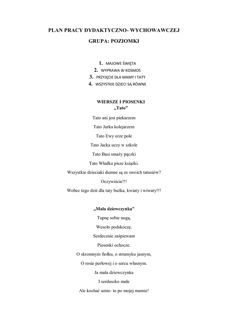 PLAN PRACY DYDAKTYCZNO- WYCHOWAWCZEJ GRUPA: POZIOMKI 1. 2. 3. 4. MAJOWE ŚWIĘTA WYPRAWA W KOSMOS PRZYJĘCIE DLA MAMY I TATY WSZYSTKIE DZIECI SĄ RÓWNE WIERSZE I PIOSENKI „Tato” Tato ani jest piekarzem Tato Jurka kolejarzem Tato Ewy orze pole Tato Jacka uczy w szkole Tato Basi smaży pączki Tato Władka pisze książki. Wszystkie dzieciaki dumne są ze swoich tatusiów? Oczywiście!!! Wobec tego dziś dla taty buźka, kwiaty i wiwaty!!! „Mała dziewczynka” Tupnę sobie nogą, Wesoło podskoczę. Serdecznie zaśpiewam Piosenki ochocze. O skromnym fiołku, o strumyku jasnym, O rosie perłowej i o sercu własnym. Ja mała dziewczynka I serduszko małe Ale kochać umie- to po mojej mamie! „Rodzeństwo” 1.Sznurowadło mi zawiąże Rower zreperuje Na huśtawce tak rozbuja, że świat zawiruje. Ref W całym świecie moi mili Nie znajdziecie mówię Wam Nic lepszego nad rodzeństwo Ja się na tym dobrze znam. 2.Gdy wieczorem nie zasypiam Śpiewa mi piosenkę A jak smutno jest czy ciemno Głaszcze moją rękę. 3.Już wiadomo jest nas czworo Staś i starszy Franio. I do pary dwie dziewczyny Basia z młodsza Hanią.