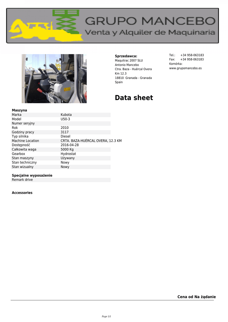 Sprzedawca: Maquitrac 2007 SLU Antonio Mancebo Ctra. Baza - Huércal Overa Km 12.3 18810 Granada - Granada Spain Tel.: +34 958-063183 Fax: +34 958-063183 Komórka: www.grupomancebo.es Data sheet Maszyna Marka Model Numer seryjny Rok Godziny pracy Typ silnika Machine Location Dostępność Całkowita waga Gearbox Stan maszyny Stan techniczny Stan wizualny Kubota U50-3 2010 3117 Diesel CRTA. BAZA-HUÉRCAL OVERA, 12.3 KM 2016-04-28 5000 Kg Hydrostat Używany Nowy Nowy Specjalne wyposażenie Remark drive Accessories Cena od Na żądanie Page 1/1