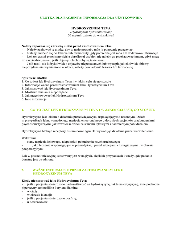 ULOTKA DLA PACJENTA: INFORMACJA DLA UśYTKOWNIKA HYDROXYZINUM TEVA (Hydroxyzini hydrochloridum) 50 mg/ml roztwór do wstrzykiwań NaleŜy zapoznać się z treścią ulotki przed zastosowaniem leku. - NaleŜy zachować tę ulotkę, aby w razie potrzeby móc ją ponownie przeczytać. - NaleŜy zwrócić się do lekarza lub farmaceuty, gdy potrzebna jest rada lub dodatkowa informacja. - Lek ten został przepisany ściśle określonej osobie i nie naleŜy go przekazywać innym, gdyŜ moŜe im zaszkodzić, nawet, jeśli objawy ich choroby są takie same. - Jeśli nasili się którykolwiek z objawów niepoŜądanych lub wystąpią jakiekolwiek objawy niepoŜądane nie wymienione w ulotce, naleŜy powiadomić lekarza lub farmaceutę. Spis treści ulotki: 1. Co to jest lek Hydroxyzinum Teva i w jakim celu się go stosuje 2. Informacje waŜne przed zastosowaniem leku Hydroxyzinum Teva 3. Jak stosować lek Hydroxyzinum Teva 4. MoŜliwe działania niepoŜądane 5. Jak przechowywać lek Hydroxyzinum Teva 6. Inne informacje 1. CO TO JEST LEK HYDROXYZINUM TEVA I W JAKIM CELU SIĘ GO STOSUJE Hydroksyzyna jest lekiem o działaniu przeciwlękowym, uspokajającym i nasennym. Działa w przypadkach lęku, wzmoŜonego napięcia emocjonalnego u dorosłych pacjentów z zaburzeniami psychosomatycznymi, jak równieŜ u dzieci ze stanami lękowymi i nadmiernym pobudzeniem. Hydroksyzyna blokuje receptory histaminowe typu H1 wywołując działanie przeciwuczuleniowe. Wskazania: - stany napięcia lękowego, niepokoju i pobudzenia psychoruchowego; jako leczenie wspomagające w premedykacji przed zabiegami chirurgicznymi i w okresie pooperacyjnym; Lek w postaci iniekcyjnej stosowany jest w nagłych, cięŜkich przypadkach i wtedy, gdy podanie doustne jest utrudnione. 2. WAśNE INFORMACJE PRZED ZASTOSOWANIEM LEKU HYDROXYZINUM TEVA Kiedy nie stosować leku Hydroxyzinum Teva - jeśli u pacjenta stwierdzono nadwraŜliwość na hydroksyzynę, takŜe na cetyryzynę, inne pochodne piperazyny, aminofilinę i etylenodiaminę; - w ciąŜy; - w okresie laktacji; - jeśli u pacjenta stwierdzono porfirię; - u noworodków. 1 Kiedy zachować szczególną ostroŜność stosując lek Hydroxyzinum Teva Hydroksyzyna jest przeznaczona tylko do stosowania w iniekcjach domięśniowych i nie moŜe być stosowana w iniekcji podskórnej, doŜylnej, ani dotętniczej. NaleŜy zachować ostroŜność u pacjentów ze zwiększonym ryzykiem wystąpienia napadu drgawek. Dzieci są bardziej wraŜliwe na wystąpienie działań niepoŜądanych ze strony ośrodkowego układu nerwowego. U dzieci drgawki występowały częściej niŜ u pacjentów dorosłych. Ze względu na działanie cholinolityczne naleŜy zachować ostroŜność w przypadku stosowania u pacjentów z jaskrą z wąskim katem przesączania, zaburzeniami odpływu moczu, zmniejszoną perystaltyką przewodu pokarmowego, nuŜliwością mięśni (osłabieniem i zmęczeniem mięśni o nieznanej przyczynie) i demencją (otępieniem). Hydroksyzyna nasila działanie środków działających depresyjnie na ośrodkowy układ nerwowy takich, jak: narkotyki, barbiturany, a takŜe alkoholu. JeŜeli leki te stosowane są jednocześnie z hydroksyzyną, ich dawka powinna być odpowiednio dostosowana (zmniejszona). Podczas stosowania hydroksyzyny naleŜy unikać spoŜywania alkoholu. NaleŜy równieŜ dostosować dawkowanie jednocześnie stosowanych leków o właściwościach cholinolitycznych. Lek naleŜy stosować ostroŜnie u pacjentów z astmą. NaleŜy zachować ostroŜność u pacjentów z zaburzeniami rytmu serca lub leczonych jednocześnie lekami, które mogą powodować zaburzenia rytmu serca. U pacjentów w podeszłym wieku naleŜy zmniejszyć dawkę, ze względu na przedłuŜone działanie leku. Pacjenci z niewydolnością wątroby lub umiarkowaną i cięŜką niewydolnością nerek wymagają zmniejszenia dawki leku. Leczenie hydroksyzyną naleŜy przerwać przynajmniej na 5 dni przed wykonaniem testów alergicznych lub testu prowokacji oskrzelowej metacholiną, gdyŜ lek moŜe wpływać na ich wyniki. Stosowanie leku Hydroxyzinum Teva u pacjentów z zaburzeniem czynności nerek i (lub) wątroby U pacjentów z niewydolnością wątroby i nerek moŜe być konieczne zmniejszenie dawki leku. Stosowanie leku Hydroxyzinum Teva u pacjentów w podeszłym wieku U pacjentów w podeszłym wieku naleŜy zmniejszyć dawkę, ze względu na przedłuŜone działanie leku. Pacjenci w podeszłym wieku mogą wykazywać większą wraŜliwość na lek i dlatego zaleca się dokładną obserwację w kierunku występowania działań niepoŜądanych. CiąŜa i karmienie piersią Przed zastosowaniem kaŜdego leku naleŜy poradzić się lekarza lub farmaceuty. Ze względu na brak danych dotyczących bezpieczeństwa stosowania w ciąŜy, nie zaleca się stosowania hydroksyzyny w tym okresie. Nie wiadomo, czy lek przenika do mleka kobiecego, dlatego nie zaleca się stosowania hydroksyzyny w okresie karmienia piersią. 2 Prowadzenie pojazdów i obsługa maszyn Hydroksyzyna upośledza sprawność psychofizyczną. Podczas stosowania leku nie naleŜy prowadzić pojazdów mechanicznych ani obsługiwać urządzeń mechanicznych w ruchu. Stosowanie innych leków Hydroksyzyna nasila działanie leków wpływających hamująco na ośrodkowy układ nerwowy (barbiturany, inne leki hamujące ośrodkowy układ nerwowy), alkoholu, a takŜe leków o właściwościach cholinolitycznych (które powodują m.in. rozszerzenie źrenic, rozszerzenie oskrzeli, spowolnienie perystaltyki jelit, wstrzymanie wydzielania przez gruczoły wydzielania zewnętrznego (czego efektem jest m.in. suchość w ustach), pobudzenie ośrodkowego układu nerwowego powodujące halucynacje, pobudzenie psychomotoryczne, podnoszenie temperatury ciała, rozkurcz mięśni gładkich). Hydroksyzyna znosi działanie betahistyny (lek stosowany w chorobach charakteryzujących się zawrotami głowy, szumami usznymi) oraz inhibitorów acetylocholinesterazy (leki stosowane w zabu