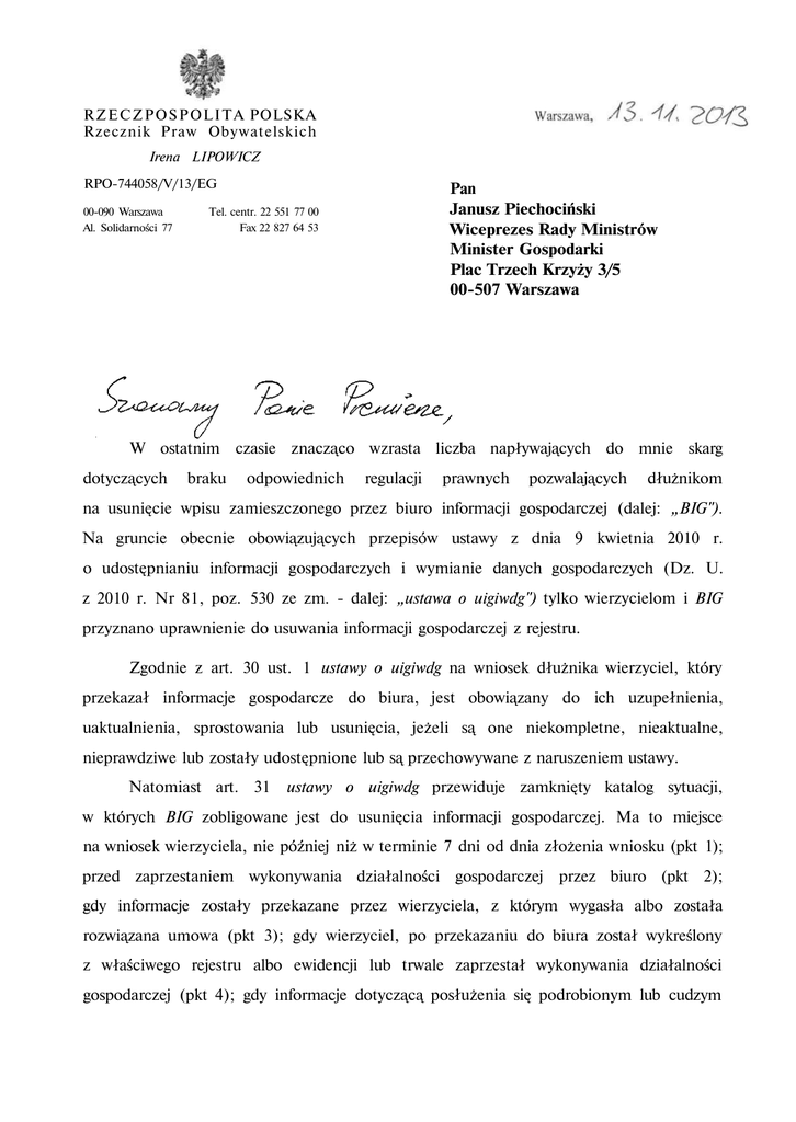 R Z E C Z P O S P O L I T A POLSKA Rzecznik Praw Obywatelskich Irena LIPOWICZ RPO-744058/V/13/EG 00-090 Warszawa Al. Solidarności 77 Pan Janusz Piechociński Wiceprezes Rady Ministrów Minister Gospodarki Plac Trzech Krzyży 3/5 00-507 Warszawa Tel. centr. 22 551 77 00 Fax 22 827 64 53 W ostatnim czasie znacząco wzrasta liczba napływających do mnie skarg dotyczących braku odpowiednich regulacji prawnych pozwalających dłużnikom na usunięcie wpisu zamieszczonego przez biuro informacji gospodarczej (dalej: „BIG"). Na gruncie obecnie obowiązujących przepisów ustawy z dnia 9 kwietnia 2010 r. o udostępnianiu informacji gospodarczych i wymianie danych gospodarczych (Dz. U. z 2010 r. Nr 81, poz. 530 ze zm. - dalej: „ustawa o uigiwdg") tylko wierzycielom i BIG przyznano uprawnienie do usuwania informacji gospodarczej z rejestru. Zgodnie z art. 30 ust. 1 ustawy o uigiwdg na wniosek dłużnika wierzyciel, który przekazał informacje gospodarcze do biura, jest obowiązany do ich uzupełnienia, uaktualnienia, sprostowania lub usunięcia, jeżeli są one niekompletne, nieaktualne, nieprawdziwe lub zostały udostępnione lub są przechowywane z naruszeniem ustawy. Natomiast art. 31 ustawy o uigiwdg przewiduje zamknięty katalog sytuacji, w których BIG zobligowane jest do usunięcia informacji gospodarczej. Ma to miejsce na wniosek wierzyciela, nie później niż w terminie 7 dni od dnia złożenia wniosku (pkt 1); przed zaprzestaniem wykonywania działalności gospodarczej przez biuro (pkt 2); gdy informacje zostały przekazane przez wierzyciela, z którym wygasła albo została rozwiązana umowa (pkt 3); gdy wierzyciel, po przekazaniu do biura został wykreślony z właściwego rejestru albo ewidencji lub trwale zaprzestał wykonywania działalności gospodarczej (pkt 4); gdy informacje dotyczącą posłużenia się podrobionym lub cudzym 2 dokumentem - po upływie 10 lat, licząc od końca roku, w którym biuro otrzymało te informacje (pkt 5); na podstawie uzasadnionej informacji o nieistnieniu zobowiązania (pkt 6); na podstawie uzasadnionej informacji o wygaśnięciu zobowiązania, jeżeli dane dotyczą dłużnika będącego konsumentem (pkt 7); po upływie 3 lat od ich ostatniej aktualizacji, nie później niż po upływie 10 lat od dnia ich przekazania przez wierzyciela (pkt 8). Mając na uwadze powyższe, pragnę wskazać, iż w ustawie o uigiwdg nie przewidziano wprost możliwości dokonania usunięcia wpisu przez BIG na podstawie wniosku dłużnika. Jednocześnie pragnę podkreślić, iż obowiązujące procedury w zakresie usuwania wpisu, w mojej ocenie, są nieprecyzyjne i co za tym idzie stanowią źródło problemów praktycznych. W przypadku przesłanki określonej w art. 31 pkt 6 ustawy o uigiwdg (usunięcie na podstawie uzasadnionej informacji o nieistnieniu zobowiązania), pojawia się wątpliwość, w jaki sposób dłużnik powinien udokumentować fakt nieistnienia zobowiązania. Może bowiem zdarzyć się sytuacja, gdy nie będzie możliwe uzyskanie oświadczenia wierzyciela w tym zakresie, wówczas powstaje pytanie, czy dłużnik powinien uzyskać wyrok ustalający nieistnienie zobowiązania w trybie art. 189 ustawy z dnia 17 listopada 1964 r. - Kodeks postępowania cywilnego (Dz. U. z 1964 r. Nr 43, poz. 296, ze zm. - dalej: „Kodeks postępowania cywilnego"). Zakładając, podkreślić, iż wymagane jest przedstawienie orzeczenia sądowego, pragnę iż dłużnicy będą zmuszeni do wszczynania postępowań o ustalenie nieistniejących zobowiązań i tym samym zostaną narażeni na poniesienie kosztów sądowych oraz wydatków na pomoc prawną. Innymi słowy, doprowadzi to do bezzasadnego przeniesienia ciężaru dowodu na dłużników niesłusznie wpisanych do rejestru. To z kolei wiąże się również z niebezpieczeństwem wpływu do sądów zbyt dużej liczby pozwów, których treścią będzie ustalenie nieistnienia stosunku prawnego lub prawa. Oznacza to, iż sądy będą rozpatrywały sprawy o nieistniejące zobowiązania, co z pewnością przyczyni się do pogłębienia zjawiska przeciążenia sądownictwa, a także przewlekłości postępowań. 3 Jeśli zaś chodzi o przesłankę określoną w art. 31 pkt 7 ustawy o uigiwdg, pragnę zwrócić uwagę, iż procedura usuwania informacji przez BIG z urzędu dotyczy tylko przypadku wygaśnięcia zobowiązania, jeżeli dane dotyczą dłużnika będącego konsumentem. Niezrozumiałe jest zatem, dlaczego w przypadku dłużników przedsiębiorców nie ma takiej możliwości. W mojej ocenie obowiązująca regulacja prowadzi do nieuprawnionego zróżnicowanego traktowania dłużników w zależności od ich statusu. W tym kontekście pojawia się również pytanie, czy możliwe jest w ogóle zakwestionowanie zasadności umieszczenia informacji przez BIG w momencie dokonywania samego wpisu. Ustawa o uigiwdg nie przewiduje bowiem wprost takiej możliwości. Powstaje zatem kolejny problem do rozstrzygnięcia, czy w tym przypadku, można stosować w drodze analogii przepisy o usuwaniu informacji przez BIG. Warto podkreślić, iż z uwagi na brak regulacji może dojść do sytuacji, kiedy BIG najpierw musiałoby dokonać wpisu, żeby zaraz potem móc go usunąć na podstawie art. 31 ustawy o uigiwdg. Podsumowując, wobec braku odpowiednich regulacji prawnych zabezpieczających dłużnika, aktualnie w sytuacji gdy wierzyciel nie dopełnia obowiązku usunięcia danych z rejestru (co bardzo często zdarza się w praktyce), dłużnikowi pozostaje jedynie wystąpienie z powództwem o ochronę dóbr osobistych. Za taką możliwością opowiedziała się judykatura (por. wyrok Sądu Apelacyjnego w Krakowie z dnia 21 maja 2010 r., sygn. akt I ACa 430/10, wyrok Sądu Najwyższego z dnia 26 października 2011 r., sygn. akt III CSK 16/11). Sąd Najwyższy w uzasadnieniu przywołanego wyroku podkreślił, iż „(...) w przepisach o ochronie dóbr osobistych należy poszukiwać roszczenia o zaniechanie naruszeń z uwagi na to, iż 