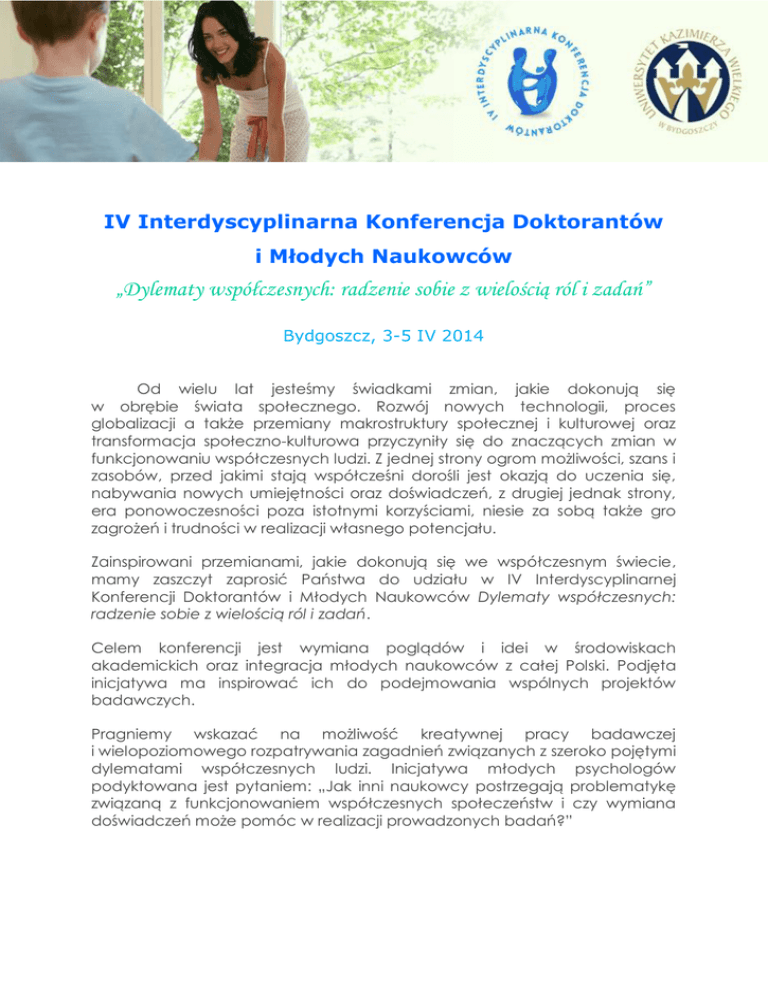 IV Interdyscyplinarna Konferencja Doktorantów i Młodych Naukowców „Dylematy współczesnych: radzenie sobie z wielością ról i zadań” Bydgoszcz, 3-5 IV 2014 Od wielu lat jesteśmy świadkami zmian, jakie dokonują się w obrębie świata społecznego. Rozwój nowych technologii, proces globalizacji a także przemiany makrostruktury społecznej i kulturowej oraz transformacja społeczno-kulturowa przyczyniły się do znaczących zmian w funkcjonowaniu współczesnych ludzi. Z jednej strony ogrom możliwości, szans i zasobów, przed jakimi stają współcześni dorośli jest okazją do uczenia się, nabywania nowych umiejętności oraz doświadczeń, z drugiej jednak strony, era ponowoczesności poza istotnymi korzyściami, niesie za sobą także gro zagrożeń i trudności w realizacji własnego potencjału. Zainspirowani przemianami, jakie dokonują się we współczesnym świecie, mamy zaszczyt zaprosić Państwa do udziału w IV Interdyscyplinarnej Konferencji Doktorantów i Młodych Naukowców Dylematy współczesnych: radzenie sobie z wielością ról i zadań. Celem konferencji jest wymiana poglądów i idei w środowiskach akademickich oraz integracja młodych naukowców z całej Polski. Podjęta inicjatywa ma inspirować ich do podejmowania wspólnych projektów badawczych. Pragniemy wskazać na możliwość kreatywnej pracy badawczej i wielopoziomowego rozpatrywania zagadnień związanych z szeroko pojętymi dylematami współczesnych ludzi. Inicjatywa młodych psychologów podyktowana jest pytaniem: „Jak inni naukowcy postrzegają problematykę związaną z funkcjonowaniem współczesnych społeczeństw i czy wymiana doświadczeń może pomóc w realizacji prowadzonych badań?” Do udziału w konferencji zapraszamy doktorantów i młodych naukowców reprezentujących wszystkie nauki zainteresowane problemami współczesności: psychologów, pedagogów, socjologów, filozofów, ekonomistów, jak i przedstawicieli innych dyscyplin nauki. Pragnąc stworzyć jak najszerszą płaszczyznę wymiany myśli, informacji i doniesień badawczych, podajemy przykładowe propozycje tematów sesji i sympozjów: Jakość życia człowieka w XXI wieku Uwarunkowania jakości życia współczesnych ludzi Zagrożenia cywilizacyjne – psychologiczne funkcjonowanie człowieka wobec chorób cywilizacyjnych Zachowania zdrowotne współczesnych ludzi Kryzysy współczesnego życia W obliczu zagrożenia – radzenie sobie w sytuacjach trudnych Oblicza uzależnień jako problem współczesności Temperamentalne, osobowościowe wyznaczniki aktywności człowieka Współczesne życie rodzinne Rodzina jako szansa na pomyślny rozwój człowieka Współczesna rodzina z punktu widzenia szans i zagrożeń (migracje zarobkowe, zmiany modelu rodziny, rozwody, „eurosieroctwo”, itp.) Godzenie ról rodzinnych i zawodowych jako wyzwanie współczesności Relacje partnerskie Współczesne związki interpersonalne – bliskość, intymność i miłość w relacjach Współczesne problemy prokreacji (bezpłodność, alternatywne metody poczęcia, rozwój antykoncepcji) Sfera seksualności człowieka – potencjał do wykorzystania czy obszar nadużyć? Funkcjonowanie człowieka w XXI wieku Znaczenie współczesnych zmian cywilizacyjnych dla relacji międzypokoleniowych Sposoby spędzania wolnego czasu – w poszukiwaniu tożsamości Współczesny świat wartości i autorytetów Zainteresowania jako ryzyko lub potencjał współczesnych ludzi Współczesna szkoła jako środowisko wspierające lub utrudniające rozwój uczniów i nauczycieli Funkcjonowanie współczesnych grup młodzieżowych Współczesne społeczeństwo obywatelskie Rola przemian ekonomicznych i technologicznych dla życia współczesnych ludzi Współczesne problemy osób niepełnosprawnych Współczesny rynek pracy (bezrobocie, ubóstwo, dyskryminacja w miejscu pracy) Media i współczesność (rozwój Internetu, portale randkowe, portale społecznościowe, blogi, telewizja, radio, prasa); „Dzisiejsze media z perspektywy rozwoju człowieka” Miejsce sztuki w życiu współczesnych (teatr, muzyka, galerie, filharmonia, opera, sztuka uliczna – graffiti) Podkreślając interdyscyplinarność konferencji, wykłady inauguracyjne wygłoszone zostaną przez znanych badaczy zajmujących się problematyką współczesności z różnych dziedzin nauki (psychologii, socjologii, pedagogiki). Podczas konferencji odbędą się wystąpienia ustne zorganizowane w sesjach tematycznych, sesja posterowa, interdyscyplinarna dyskusja panelowa. Mamy nadzieję na Państwa żywy odzew. Informacje organizacyjne: Opłata konferencyjna: Wysokość opłat: do 2 marca 2014 roku– 250 zł po 2 marca 2014 roku – 300 zł Termin uiszczania opłat za udział w Konferencji: 16.03.2014r. Opłatę konferencyjną prosimy uregulować przelewem na konto bankowe konferencji: Uniwersytet Kazimierza Wielkiego w Bydgoszczy Ul. Chodkiewicza 30, 85-064 Bydgoszcz 92 1500 1360 1213 6001 8602 0000 Kredyt Bank SA O. Bydgoszcz z dopiskiem: IKD Opłata konferencyjna obejmuje: - uczestnictwo w wykładach i sesjach, - materiały konferencyjne, - certyfikat uczestnictwa, - umieszczenie przyjętych wystąpień w punktowanej monografii (pod warunkiem uzyskania pozytywnej recenzji nadesłanego tekstu), -udział w imprezach towarzyszących. Miejsce konferencji: Instytut Psychologii Uniwersytetu Kazimierza Wielkiego ul. Staffa 1, 85-867 Bydgoszcz Zgłoszenie uczestnictwa: Zgłoszenia udziału w konferencji prosimy przesyłać drogą elektroniczną poprzez wypełnienie formularza zgłoszeniowego na stronie: http://ikd.edu.pl/sprawy-organizacyjne/zgloszenie-uczestnictwa/ Termin nadsyłania streszczeń referatów lub plakatów: 12 stycznia 2014. Komitet Naukowy konferencji po uprzednim zebraniu deklaracji czynnego udziału uczestników, dokona merytorycznej weryfikacji nadesłanych streszczeń. Informację o zakwalifikowaniu Państwa wystąpienia otrzymacie Państwo drogą mailową do 1