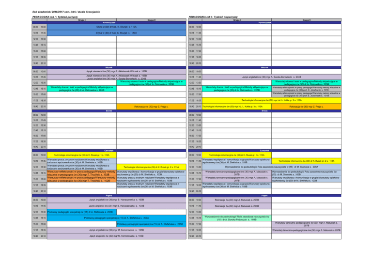 Rok akademicki 2016/2017 sem. letni / studia licencjackie PEDAGOGIKA rok I : Tydzień parzysty PEDAGOGIKA rok I : Tydzień nieparzysty Grupa I Grupa II Grupa I Poniedziałek Grupa II Poniedziałek 08:30 10:00 Etyka w (30) dr hab. K. Skurjat s. 110A 08:30 10:00 10:15 11:45 Etyka w (30) dr hab. K. Skurjat s. 110A 10:15 11:45 12:00 13:30 12:00 13:30 13:45 15:15 13:45 15:15 15:30 17:00 15:30 17:00 17:05 18:35 17:05 18:35 18:40 20:10 18:40 20:10 Wtorek 08:30 10:00 10:15 11:45 12:00 13:30 13:45 15:15 15:30 17:00 17:05 18:35 18:40 20:10 Wtorek Język niemiecki ćw (30) mgr A. Akielaszek-Witczak s. 105B Język niemiecki ćw (30) mgr A. Akielaszek-Witczak s. 105B Język angielski ćw (30) mgr A. Sarata-Borowiecki s. 204B Warsztaty drama i teatr w pedagogice/Metody aktywizujące w pedagogice ćw (30) dr A. Ostrowska s. 205B Warsztaty drama i teatr w pedagogice/Metody aktywizujące w pedagogice ćw (30) dr A. Ostrowska s. 205B 08:30 10:00 10:15 11:45 Język angielski ćw (30) mgr A. Sarata-Borowiecki s. 204B Warsztaty drama i teatr w pedagogice/Metody aktywizujące w pedagogice ćw (30) dr A. Ostrowska s. 205B 12:00 13:30 13:45 15:15 Warsztaty drama i teatr w pedagogice/Metody aktywizujące w pedagogice ćw (30) dr A. Ostrowska s. 205B Warsztaty refleksyjność w pracy pedagoga/Warsztaty metody wizualne w pedagogice ćw (30) prof. E. Józefowski s. 101B 15:30 17:00 17:05 18:35 Rekreacja ćw (30) mgr Z. Prejs s. Technologie informacyjne ćw (30) mgr inż. L. Kukła gr. 3 s. 113A 18:40 20:10 Technologie informacyjne ćw (30) mgr inż. L. Kukła gr. 3 s. 113A Środa 10:00 08:30 10:00 10:15 11:45 10:15 11:45 12:00 13:30 12:00 13:30 13:45 15:15 13:45 15:15 15:30 17:00 15:30 17:00 17:05 18:35 17:05 18:35 18:40 20:10 18:40 20:10 Czwartek 10:00 10:15 11:45 12:00 13:45 15:30 Warsztaty refleksyjność w pracy pedagoga/Warsztaty metody wizualne w pedagogice ćw (30) mgr T. Trociński s. 102B Warsztaty refleksyjność w pracy pedagoga/Warsztaty metody 17:00 wizualne w pedagogice ćw (30) mgr T. Trociński s. 102B 15:15 18:35 18:40 20:10 Czwartek Technologie informacyjne ćw (30) dr K. Rusak gr. 1 s. 113A Warsztaty praca z trudnym rodzicem/Warsztaty współpraca z rodzicami wychowanka ćw (30) dr M. Siwińska s. 103B Warsztaty praca z trudnym rodzicem/Warsztaty współpraca z 13:30 rodzicami wychowanka ćw (30) dr M. Siwińska s. 103B 17:05 Rekreacja ćw (30) mgr Z. Prejs s. Środa 08:30 08:30 Warsztaty refleksyjność w pracy pedagoga/Warsztaty metody wizualne w pedagogice ćw (30) prof. E. Józefowski s. 101B Technologie informacyjne ćw (30) dr K. Rusak gr. 2 s. 113A Warsztaty współpraca i komunikacja w grupie/Warsztaty opiekunawychowawcy ćw (30) dr M. Siwińska s. 103B Warsztaty praca z trudnym rodzicem/Warsztaty współpraca z rodzicami wychowanka ćw (30) dr M. Siwińska s. 103B Warsztaty praca z trudnym rodzicem/Warsztaty współpraca z rodzicami wychowanka ćw (30) dr M. Siwińska s. 103B 08:30 10:00 Technologie informacyjne ćw (30) dr K. Rusak gr. 1 s. 113A 10:15 11:45 Warsztaty współpraca i komunikacja w grupie/Warsztaty opiekunawychowawcy ćw (30) dr M. Siwińska s. 103B 12:00 13:30 Technologie informacyjne ćw (30) dr K. Rusak gr. 2 s. 113A Wprowadzenie do pedeutologii/ Rola zawodowa nauczyciela w (15) dr M. Siwińska s. 209A Warsztaty taneczno-pedagogiczne ćw (30) mgr A. Matusiak s. 207B Warsztaty taneczno-pedagogiczne ćw (30) mgr A. Matusiak s. 15:30 17:00 207B Warsztaty współpraca i komunikacja w grupie/Warsztaty opiekuna17:05 18:35 wychowawcy ćw (30) dr M. Siwińska s. 103B 13:45 15:15 Wprowadzenie do pedeutologii/ Rola zawodowa nauczyciela ćw (15) dr M. Siwińska s. 103B Warsztaty współpraca i komunikacja w grupie/Warsztaty opiekunawychowawcy ćw (30) dr M. Siwińska s. 103B 18:40 20:10 Piątek Piątek 08:30 10:00 Język angielski ćw (30) mgr B. Hanaczewska s. 103B 08:30 10:00 Rekreacja ćw (30) mgr A. Matusiak s. 207B 10:15 11:45 Język angielski ćw (30) mgr B. Hanaczewska s. 103B 10:15 11:45 Rekreacja ćw (30) mgr A. Matusiak s. 207B 12:00 13:30 Podstawy pedagogiki specjalnej ćw (15) dr A. Stefańska s. 205B 13:45 15:15 15:30 17:00 17:05 18:35 18:40 20:10 12:00 13:30 Podstawy pedagogiki specjalnej w (15) dr A. Stefańska s. 209A 13:45 15:15 Wprowadzenie do pedeutologii/ Rola zawodowa nauczyciela ćw (15) dr A. Soroka-Fedorczuk s. 104B 15:30 17:00 Warsztaty taneczno-pedagogiczne ćw (30) mgr A. Matusiak s. 207B Język angielski ćw (30) mgr M. Komorowska s. 105B 17:05 18:35 Warsztaty taneczno-pedagogiczne ćw (30) mgr A. Matusiak s.207B Język angielski ćw (30) mgr M. Komorowska s. 105B 18:40 20:10 Podstawy pedagogiki specjalnej ćw (15) dr A. Stefańska s. 205B