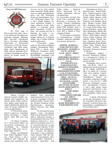6 10 Nowy wóz OSP Przywory! Gmina Tarnow Opolski W 1910 roku w Przyworach była tylko sikawka na podwoziu doczepiana do zaprzęgu konnego. Oficjalna data założenia Ochotniczej Straży Pożarnej (Freiwillige Feuerwehr) w Przyworach (Przywor) to 1928 rok. Na potwierdzenie tego faktu posiadamy obraz namalowany na szkle. Siłą tej jednostki byli i są ludzie (mieszkańcy) zawsze gotowi by pomóc innym w potrzebie. strażacy można było spełnić nasze marzenie. Środki finansowe na zakup gromadziliśmy przez cały rok, zbieraniem złomu od mieszkańców Przywór, Miedzianej, Kątów Op., a także dzięki hojności naszych sponsorów byliśmy w stanie uzbierać kwotę, która pokryła w znacznej części koszt samochodu 52.500 zł. Nasz wóz wyposażony jest w zbiornik na wodę o pojemności 3000 litrów, autopompę, kabinę na 8 osobową załogę. Jest w bardzo dobrym stanie technicznym. Uroczystość rozpoczęła się złożeniem meldunku Zastępcy Komendanta Miejskiego PSP w Opolu, bryg. Witoldowi Trojnarowi przez prowadzącego uroczystość Komendanta Gminnego Ludwika Janickiego. Następnym Sprzęt używany w tamtych czasach mógłby niejednego dziś rozśmieszyć ale obecny prezes byłby zachwycony gdyby mógł dzisiaj pozyskać jakikolwiek antyk strażacki do naszej jednostki by stworzyć Izbę Pamięci. W Przyworach stacjonował w garażu już samochód Robur pozyskany z wojska, Star25, Jelcz 004 oraz Star 244. W sobotę 13 listopada w Przyworach odbyła się uroczystość poświęcenia nowonabytego do tutejszej jednostki OSP wozu strażackiego marki IVECO. Dzięki przychylności Pana Wójta Zygmunta Cichonia i Rady Gminy, a także wkładowi jaki dołączyli do zakupu tego samochodu sami punktem było przywitanie zaproszonych gości m.in. Wójta gminy Zygmunta Cichonia, radnych Gminy Tarnów Opolski, Księdza Dziekana Józefa Kaczmarczyka, sponsorów, Sołtysa Przywór oraz Radę Sołecką. Po poświęceniu przez księdza wozu strażackiego Wójt wręczył kluczyki Naczelnikowi Marcinowi Kotula, a ten przekazał je kierowcy Waldemarowi Jaroszowi z życzeniami bezawaryjnej pracy wozu i utrzymywania go w ciągłej gotowości bojowej. W dalszej części były podziękowania i życzenia od zaproszonych gości, a także podziękowania prezesa OSP dla darczyńców (mieszkańców Miedzianej, Kątów Opolskich i Przywór), sponsorów oraz Wójta gminy i Radnych, którzy przyczynili się do zakupu samochodu ratowniczo-gaśniczego. Na uroczystość przybyli druhowie wraz z pocztami sztandarowymi z Kosorowic, Raszowej, Tarnowa Opolskiego oraz z zaprzyjaźnionej jednostki OSP Grudzice wraz z byłym Komendantem Rejonowym PSP w Opolu st. bryg. Antonim Pilchem. W tym miejscu chcieliśmy za pośrednictwem Gazetki Gminnej serdeczne podziękować naszym sponsorom: - ZESPÓŁ „MARVEL", - ZAKŁAD USŁUG REMONTOWO – BUDOWLANYCH „MALIK”, - P.U.H. DYGA - JERZY DYGA, - SPÓŁDZIELNIA PRACY SUROWCÓW MINERALNYCH, - PIOMAR SP.Z O.O, -NADLEŚNICTWO STRZELCE OPOLSKIE, - PAŃSTWOWE GOSPODARSTWO LEŚNE LASY PAŃSTWOWE NADLEŚNICTWO OPOLE, - OPOL - SPAW S.C. ANDRZEJ WANAT, - SUCHANEK JACEK, - AGGLONORDADVANCED QUALITY STONE; BERNADETTE KREUZ, - STOLL - WID, JÓZEF MIKA, - WRZECIONO GERARD i ELŻBIETA, - KUBOŃ MANFRED i TERESA, - BANK SPÓŁDZIELCZY W KRAPKOWICACH. 7 Mieszkańcom którzy podarowali złom: Banach Mirosław, Cebula Grzegorz, Cebula Jan, Czypek Alfred, Fajlert Alfred, Gabor Henryk, Golla Józef i Maria (Kąty Op. ul. Szkolna), Grel Gabriela (Kąty Op.), Kampa Czesław (Kąty Op.), Kołodziej Józef (Niemcy), Lysek Darek (Kąty Op.), Lysek Waldemar, Łaciak Mariusz (Miedziana), Macha Marian, Mańczyk Maria, Mateja Dorota, Mika Ginter, Pancerz Teresa, Pasoń Fryderyk, Piechaczek Alfons, Pisarek Barbara, Suchanek Jacek, Szczekala Małgorzata, Rataj Roman, Urban Lidia, Wenzel Róża, Wieszołek Norbert, Wróbel Krzysztof, Wrzeciono Roman, Żur Dorota. Dziękujemy radnym z Przywór: Henrykowi Gaborowi i Grzegorzowi Cebula za osobiste zaangażowanie się w sprawę zakupu. Dziękujemy także wszystkim strażakom, którzy w jakikolwiek sposób przyczynili się do zakupu samochodu a także za wkład sił i poświęcenie czasu podczas wyposażania w sprzęt gaśniczy. Chcielibyśmy jeszcze raz wszystkim serdecznie podziękować, a my strażacy z OSP Przywory ofiarujemy wszystkim mieszkańcom Przywór, a także całej gminy naszą gotowość i poświęcenie w niesieniu pomocy podczas pożarów, wypadków i klęsk żywiołowych. Z okazji zbliżającego się Bożego Narodzenia życzymy wszystkim zdrowych, spokojnych i wesołych Świąt oraz pomyślności w nadchodzącym Nowym Roku 2011!