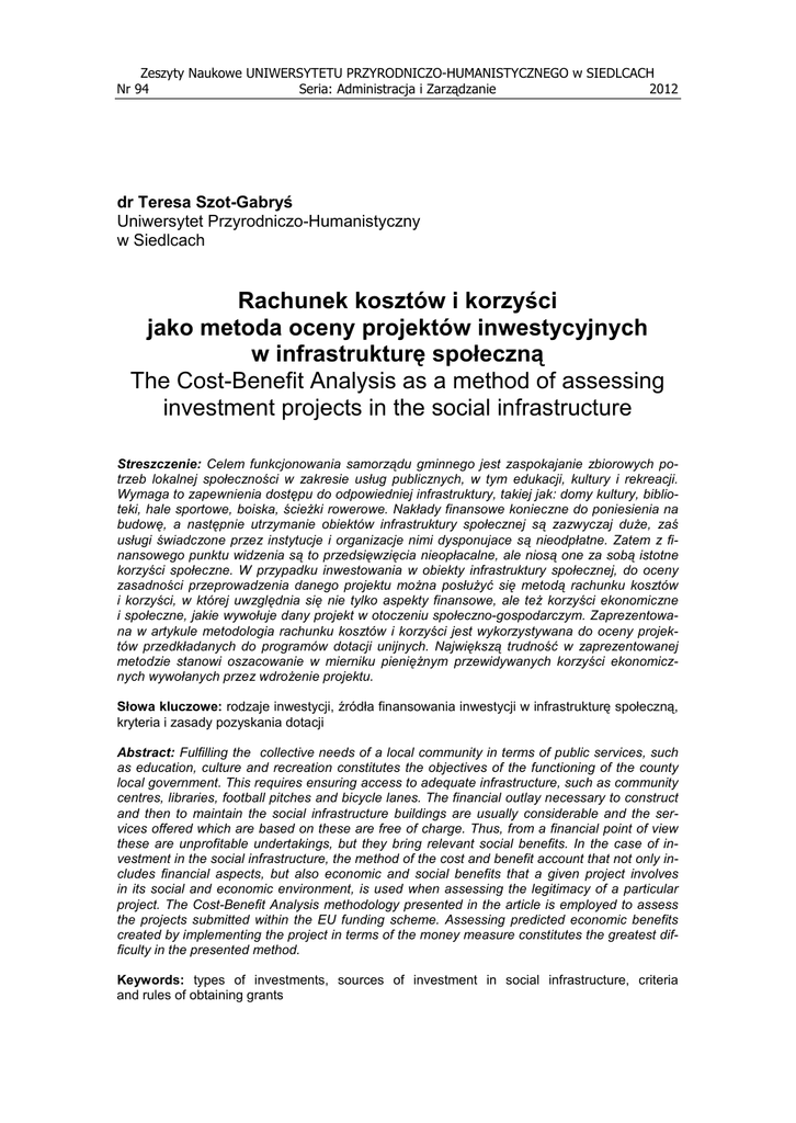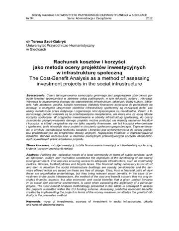 Zeszyty Naukowe UNIWERSYTETU PRZYRODNICZO-HUMANISTYCZNEGO w SIEDLCACH Nr 94 Seria: Administracja i Zarządzanie 2012 dr Teresa Szot-Gabryś Uniwersytet Przyrodniczo-Humanistyczny w Siedlcach Rachunek kosztów i korzyści jako metoda oceny projektów inwestycyjnych w infrastrukturę społeczną The Cost-Benefit Analysis as a method of assessing investment projects in the social infrastructure Streszczenie: Celem funkcjonowania samorządu gminnego jest zaspokajanie zbiorowych potrzeb lokalnej społeczności w zakresie usług publicznych, w tym edukacji, kultury i rekreacji. Wymaga to zapewnienia dostępu do odpowiedniej infrastruktury, takiej jak: domy kultury, biblioteki, hale sportowe, boiska, ścieżki rowerowe. Nakłady finansowe konieczne do poniesienia na budowę, a następnie utrzymanie obiektów infrastruktury społecznej są zazwyczaj duże, zaś usługi świadczone przez instytucje i organizacje nimi dysponujace są nieodpłatne. Zatem z finansowego punktu widzenia są to przedsięwzięcia nieopłacalne, ale niosą one za sobą istotne korzyści społeczne. W przypadku inwestowania w obiekty infrastruktury społecznej, do oceny zasadności przeprowadzenia danego projektu można posłużyć się metodą rachunku kosztów i korzyści, w której uwzględnia się nie tylko aspekty finansowe, ale też korzyści ekonomiczne i społeczne, jakie wywołuje dany projekt w otoczeniu społeczno-gospodarczym. Zaprezentowana w artykule metodologia rachunku kosztów i korzyści jest wykorzystywana do oceny projektów przedkładanych do programów dotacji unijnych. Największą trudność w zaprezentowanej metodzie stanowi oszacowanie w mierniku pieniężnym przewidywanych korzyści ekonomicznych wywołanych przez wdrożenie projektu. Słowa kluczowe: rodzaje inwestycji, źródła finansowania inwestycji w infrastrukturę społeczną, kryteria i zasady pozyskania dotacji Abstract: Fulfilling the collective needs of a local community in terms of public services, such as education, culture and recreation constitutes the objectives of the functioning of the county local government. This requires ensuring access to adequate infrastructure, such as community centres, libraries, football pitches and bicycle lanes. The financial outlay necessary to construct and then to maintain the social infrastructure buildings are usually considerable and the services offered which are based on these are free of charge. Thus, from a financial point of view these are unprofitable undertakings, but they bring relevant social benefits. In the case of investment in the social infrastructure, the method of the cost and benefit account that not only includes financial aspects, but also economic and social benefits that a given project involves in its social and economic environment, is used when assessing the legitimacy of a particular project. The Cost-Benefit Analysis methodology presented in the article is employed to assess the projects submitted within the EU funding scheme. Assessing predicted economic benefits created by implementing the project in terms of the money measure constitutes the greatest difficulty in the presented method. Keywords: types of investments, sources of investment in social infrastructure, criteria and rules of obtaining grants 96 T. Szot-Gabryś Wstęp Rolą samorządu terytorialnego jest zaspokojenie potrzeb lokalnej społeczności w dostępie do usług publicznych, co wyraża się w zapewnieniu dostępu do odpowiedniej infrastruktury komunalnej i społecznej. W tym celu gmina jako jednostka samorządu terytorialnego realizuje zadania inwestycyjne, których efektem są takie obiekty, jak: drogi, chodniki, wodociągi, kanalizacja, budynki bibliotek, szkół, hale sportowe, świetlice wiejskie, ścieżki rowerowe i inne. Wymienione zadania inwestycyjne wymagają zazwyczaj poniesienia na ich realizację pokaźnych nakładów finansowych, a potrzeby często znacznie przerastają możliwości finansowe budżetu gminy. Społeczność lokalna i reprezentująca je Rada Gminy stają zatem przed dylematem wyboru zadań, które będą przeprowadzone w pierwszej kolejności. W związku z tym powstaje problem wyboru metody oceny przedsięwzięć inwestycyjnych, które powinny być priorytetowe w programie inwestycyjnym danego samorządu terytorialnego. Ze względu na wymogi formalne gminy tworzą Wieloletni Program Inwestycyjny, będący załącznikiem do Strategii Rozwoju Lokalnego. Budowanie strategii i planów inwestycyjnych dokonywane jest najczęściej na zasadzie konsensusu społecznego i priorytetyzacji zadań inwestycyjnych. Jednak zgodnie z zasadą racjonalnego gospodarowania należy dążyć do osiągnięcia maksymalnych efektów przy danych środkach lub, inaczej, dane środki pożytkować w ten sposób, aby uzyskać jak największe korzyści. Zasadzie tej odpowiada idea rachunku kosztów i korzyści. Rachunek kosztów i korzyści jest metodą oceny przedsięwzięć inwestycyjnych niedochodowych, dotyczących infrastruktury społecznej. Na przykład budowa biblioteki z finansowego punktu widzenia jest nieopłacalna, bo pociąga za sobą jedynie nakłady inwestycyjne i koszty eksploatacyjne, a nie przynosi dochodów. Ale nikt chyba nie ma wątpliwości, że siedziby bibliotek należy budować. Rachunek kosztów i korzyści jest metodą, która pozwala dokonać pomiaru efektów ekonomicznych tego rodzaju przedsięwzięć. Stosowana jest między innymi do oceny projektów inwestycyjnych przedkładanych do konkursów o dotacje unijne. Celem tego artykułu jest ukazanie metodologii rachunku kosztów i korzyści na przykładzie projektów inwestycyjnych dotyczących obiektów infrastruktury społecznej. Metodologia ta ukazana zostanie w aspekcie teoretycznym i praktycznym, w oparciu o analizę przypadków wybranych projektów. Rodzaje inwestycji w infrastrukturę społeczną oraz źródła ich finansowania Celem funkcjonowania samorządu terytorialnego jest zaspokajanie zbiorowych potrzeb wspóln