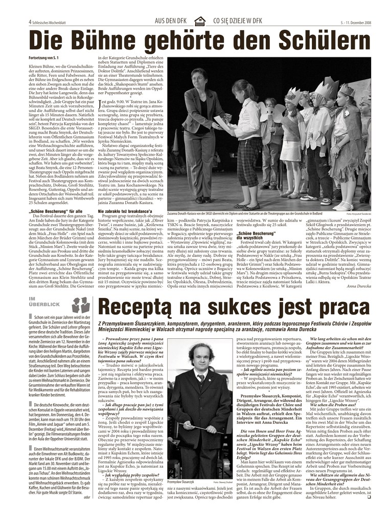 4 Schlesisches Wochenblatt Aus den DFK Co się dzieje w DFK 5. - 11. Dezember 2008 Die Bühne gehörte den Schülern Kleinen Bühne, wo die Grundschulkinder auftreten, dominieren Prinzessinnen, edle Ritter, Feen und Fabelwesen. Auf der Bühne im Erdgeschoss gibt es neben den sieben Zwergen auch schon mal die eine oder andere Break-dance Einlage. Die Jury hat keine Langeweile, denn das Bühnenbild verändert sich in Rekordgeschwindigkeit. „Jede Gruppe hat ein paar Minuten Zeit um sich vorzubereiten, und die Aufführung selbst darf nicht länger als 15 Minuten dauern. Natürlich soll sie komplett auf Deutsch vorbereitet sein“, betont Patrycja Karpińska von der SKGD. Besonders die erste Voraussetzung macht Beata Smyrek, der Deutschlehrerin vom Öffentlichen Gymnasium in Bodland, zu schaffen. „Wir werden eine Weihnachtsgeschichte aufführen, und unser Stück dauert immer so um die zwei, drei Minuten länger als die vorgegebene Zeit. Aber ich glaube, dass wir es schaffen. Wir haben uns gut vorbereitet“, sagt Beata Smyrek, die eine 12-PersonenTheatergruppe nach Oppeln mitgebracht hat. Neben den Bodländern nehmen am Festival auch Theatergruppen aus Komprachtschütz, Dobrau, Groß Strehlitz, Rosenberg, Guttentag, Oppeln und anderen Ortschaften der Woiwodschaft teil. Insgesamt haben sich zum Wettbewerb 25 Schulen angemeldet. in der Kategorie Grundschule erhielten neben Statuetten und Diplomen eine Einladung zur Aufführung „Tiere des Doktor Dolittle“. Anschließend werden sie an einer Theaterstunde teilnehmen. Die Gymnasiasten dagegen werden sich das Stück „Shakespeare’s Sturm“ ansehen. Beide Aufführungen werden im Oppelner Puppentheater gezeigt. * est godz. 9.00. W Teatrze im. Jana Kochanowskiego robi się gorąca atmosfera. Grupa dzieci pośpiesznie ustawia scenografię, inna grupa się przebiera, trzecia dopiero co przyszła. „Tu panuje kompletny chaos!” – lamentuje jedna z pracownic teatru. Czegoś takiego tutaj jeszcze nie było. Bo jest to pierwszy Festiwal Małych Form Teatralnych w Języku Niemieckim. Niełatwo złapać organizatorkę festiwalu Zuzannę Donath-Kasiurę z referatu ds. kultury Towarzystwa Społeczno-Kulturalnego Niemców na Śląsku Opolskim, która biega tu i tam, między małą sceną i sceną na parterze. – To dosyć duże wyzwanie pod względem organizacyjnym. Zdecydowaliśmy się przeprowadzić festiwal jednocześnie na dwóch scenach Teatru im. Jana Kochanowskiego. Na małej scenie występują grupy teatralne ze szkół podstawowych, a na scenie na parterze – gimnazjaliści i licealiści – wyjaśnia Zuzanna Donath-Kasiura. „Schöne Bescherung“ für alle Das Festival dauerte den ganzen Tag. Am Ende haben die Jury in der Kategorie Grundschule zwei Theatergruppen überzeugt: aus der Grundschule Nakel (mit dem Stück „Frau Holle“ - ein Spiel nach dem Märchen der Brüder Grimm) und die Grundschule Kolonnowska (mit dem Stück „Mission Mars“). Zweite wurde die Grundschule aus Proskau und dritte die Grundschule aus Koselwitz. In der Kategorie Gymnasium und Lyzeum gewann der Schulverband aus Oberglogau mit der Aufführung „Schöne Bescherung“. Platz zwei erreichte das Öffentliche Gymnasium aus Klein Strehlitz und den dritten Rang bekam das Gymnasium aus Groß Strehlitz. Die Gewinner Nie zabrakło też breakdance’a Program grup teatralnych obejmuje historie współczesne, takie jak „Oliver Twist”, i znane baśnie, jak „Królewna Śnieżka”. Na małej scenie, na której występowały dzieci ze szkół podstawowych, dominowały księżniczki, prawdziwi rycerze, wróżki i inne bajkowe postaci. Natomiast na scenie na parterze prócz siedmiu krasnoludków zobaczyć można było także grupy tańczące breakdance. Jury bynajmniej się nie nudziło. Scenografia zmieniała się w zadziwiającym tempie. – Każda grupa ma kilka minut na przygotowanie się, a samo przedstawienie nie może trwać dłużej niż 15 minut. Oczywiście powinno być ono przygotowane w języku niemiec- Fortsetzung von S. 1 Im Überblick z Schon seit ein paar Jahren wird in der Grundschule in Ziemiecice der Martinstag gefeiert. Die Schüler und Lehrer pflegen gerne diese deutsche Tradition. Dieses Jahr versammelten sich alle Bewohner der Gemeinde Ziemiecice am 12. November in der Kirche. Während der Messe fand die Aufführung über den heiligen Martin, dargeboten von den Grundschulkindern aus Przezchlebie, statt. Anschließend nahmen alle an einem Straßenumzug teil. Den Weg beleuchteten die Kinder mit bunten Laternen und sangen dabei Lieder. Zum Schluss begaben sich alle zu einem Weihnachtsmarkt in Ziemiecice. Die Gesamteinnahme der verkauften Waren ist für Medikamente und für die Rehabilitation kranker Kinder bestimmt. z Die deutsche Kinowoche, die vom deut- schen Konsulat in Oppeln veranstaltet wird, hat begonnen. Am Donnerstag, den 4. Dezember, kann man noch um 19.30 Uhr den Film „Aimée und Jaguar“ sehen und am 5. Dezember (Freitag) wird „Himmel über Berlin“ gezeigt. Die Filmveranstaltungen finden in der Aula der Oppelner Universität statt. z Einen Weihnachtsmarkt veranstalteten auch die Einwohner von Alt Budkowitz, darunter der lokale DFK und der BJDM. Der Markt fand am 30. November statt und begann um 15.00 mit einem Auftritt des „Jozin aus Tichau“. An den Weihnachtsständen konnte man schönen Weihnachtsschmuck und Weihnachtsgebäck erwerben. Es gab Kaffee, Kuchen und Glühwein für die Besucher. Für gute Musik sorgte DJ Stanix. adur J Zuzanna Donath-Kasiura von der SKGD überreicht ein Diplom und eine Statuette an die Theatergruppe aus der Grundschule in Bodland kim – podkreśla Patrycja Karpińska z TSKN-u. Beacie Smyrek, nauczycielce niemieckiego z Publicznego Gimnazjum w Bogacicy, spełnienie tego pierwszego założenia przyszło z wielką trudnością: – Wystawimy „Opowieść wigilijną”, nasza sztuka zawsze trwa dwie, trzy minuty dłużej niż założony czas trwania. Ale myślę, że damy radę. Dobrze się p