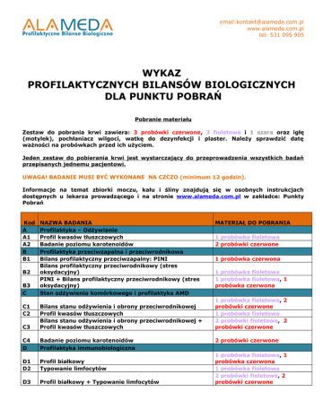 email:[email protected] www.alameda.com.pl tel: 531 095 905 WYKAZ PROFILAKTYCZNYCH BILANSÓW BIOLOGICZNYCH DLA PUNKTU POBRAŃ Pobranie materiału Zestaw do pobrania krwi zawiera: 3 probówki czerwone, 3 fioletowe i 1 szara oraz igłę (motylek), pochłaniacz wilgoci, watkę do dezynfekcji i plaster. Należy sprawdzić datę ważności na probówkach przed ich użyciem. Jeden zestaw do pobierania krwi jest wystarczający do przeprowadzenia wszystkich badań przepisanych jednemu pacjentowi. UWAGA! BADANIE MUSI BYĆ WYKONANE NA CZCZO (minimum 12 godzin). Informacje na temat zbiorki moczu, kału i śliny znajdują się w osobnych instrukcjach dostępnych u lekarza prowadzącego i na stronie www.alameda.com.pl w zakładce: Punkty Pobrań Kod A A1 A2 B B1 B2 B3 C C1 C2 NAZWA BADANIA Profilaktyka – Odżywianie Profil kwasów tłuszczowych Badanie poziomu karotenoidów Profilaktyka przeciwzapalna i przeciwrodnikowa Bilans profilaktyczny przeciwzapalny: PINI Bilans profilaktyczny przeciwrodnikowy (stres oksydacyjny) PINI + Bilans profilaktyczny przeciwrodnikowy (stres oksydacyjny) Stan odżywienia komórkowego i profilaktyka AMD C3 Bilans stanu odżywienia i obrony przeciwrodnikowej Profil kwasów tłuszczowych Bilans stanu odżywienia i obrony przeciwrodnikowej + Profil kwasów tłuszczowych C4 D Badanie poziomu karotenoidów Profilaktyka immunobiologiczna D1 D2 Profil białkowy Typowanie limfocytów D3 Profil białkowy + Typowanie limfocytów MATERIAŁ DO POBRANIA 1 probówka fioletowa 2 probówki czerwone 1 probówka czerwona 1 probówka fioletowa 1 probówka fioletowa, 1 probówka czerwona 1 probówka fioletowa, 2 probówki czerwone 1 probówka fioletowa 2 probówki fioletowe, 2 probówki czerwone 2 probówki czerwone 1 probówka fioletowa, 1 probówka czerwona 1 probówka fioletowa 2 probówki fioletowe, 2 probówki czerwone email:[email protected] www.alameda.com.pl tel: 531 095 905 D6 Profil białkowy + Typowanie limfocytów + Bilans stanu odżywienia i obrony przeciwrodnikowej Profil białkowy + Typowanie limfocytów + Profil kwasów tłuszczowych Profil białkowy + Typowanie limfocytów + Bilans stanu odżywienia i obrony przeciwrodnikowej + Profil kwasów tłuszczowych D7 Profil białkowy + Typowanie limfocytów + Sekrecyjne IgA D8 E IgM – IgG – IgA – Hap – GPA – PI – CRPus – Typowanie limfocytów - IgAs Bilans z zakresu mikroodżywiania D4 D5 E1 F Profil funkcjonalności biologicznej Profilaktyka - metylacja F1 G Badanie poziomu witaminy B9 i B12 Profilaktyka – metabolizm żelaza G1 Badanie poziomu hepcydyny Profilaktyka sercowo-naczyniowa i zespołu metabolicznego Bilans profilaktyczny ryzyka sercowo-naczyniowego i zespołu metabolicznego Profil kwasów tłuszczowych I I1 I2 I3 I4 I5 J J1 J2 J3 J4 2 probówki fioletowe, 2 probówki czerwone 2 probówki fioletowe, 2 probówki czerwone 2 probówki fioletowe, 2 probówki czerwone 2 probówki fioletowe, 2 probówki czerwone, 1 próbka kału 2 probówki fioletowe, 1 probówka czerwona, 1 próbka kału 1 probówka fioletowa, 3 probówki czerwone, 1 próbka kału 1 probówka fioletowa, 1 probówka czerwona 1 probówka czerwona 1 probówka czerwona, 1 probówka szara 1 probówka fioletowa 1 probówka fioletowa, 1 Bilans profilaktyczny ryzyka sercowo-naczyniowego i probówka czerwona, 1 zespołu metabolicznego+ Profil kwasów tłuszczowych probówka szara Bilans profilaktyczny ryzyka sercowo-naczyniowego i 2 probówki fioletowe, 2 zespołu metabolicznego + Bilans stanu odżywienia i probówki czerwone, 1 obrony przeciwrodnikowej + Profil kwasów tłuszczowych probówka szara 2 probówki fioletowe, 2 Bilans profilaktyczny ryzyka sercowo-naczyniowego i probówki czerwone, 1 zespołu metabolicznego + Profil immunologiczny probówka szara Profilaktyka – choroby cywilizacyjne 1 probówka fioletowa, 2 probówki czerwone, 1 Bilans profilaktyczny ryzyka chorób cywilizacyjnych probówka szara 1 probówka fioletowa, 2 Bilans profilaktyczny ryzyka chorób cywilizacyjnych + probówki czerwone, 1 Hepcydyna probówka szara 2 probówki fioletowe, 2 probówki czerwone Profil białkowy + Typowanie limfocytów 2 probówki fioletowe, 2 Profil białkowy + Typowanie limfocytów + Bilans probówki czerwone, 1 profilaktyczny ryzyka chorób cywilizacyjnych probówka szara email:[email protected] www.alameda.com.pl tel: 531 095 905 J5 K Profil białkowy + Typowanie limfocytów + Bilans profilaktyczny ryzyka chorób cywilizacyjnych + Hepcydyna Profilaktyka neuro-immunologiczna 2 probówki fioletowe, 3 probówki czerwone, 1 probówka szara K1 Bilans profilaktyczny neurologiczny – poziom neuroprzekaźników K2 Bilans profilaktyczny neuro-immunologiczny K3 Bilans profilaktyczny neurologiczny - poziom neuroprzekaźników + Profil kwasów tłuszczowych 2 probówki fioletowe, 2 probówki czerwone, zakwaszony mocz z 12 godzin, 1 próbka śliny 2 probówki fioletowe, 2 probówki czerwone, zakwaszony mocz z 12 godzin, 1 próbka śliny 2 probówki fioletowe, 2 probówki czerwone, zakwaszony mocz z 12 godzin, 1 próbka śliny K4 Profil immunologiczny 1 probówka fioletowa, 1 probówka czerwona M3 Bilans profilaktyczny neurologiczny – poziom neuroprzekaźników + Profil białkowy + Typowanie limfocytów Badanie w kierunku celiakii Badanie w kierunki celiakii + Nadwrażliwość na gluten (1) Badanie w kierunki celiakii + Nadwrażliwość na gluten (2) Badanie w kierunki celiakii + Nadwrażliwość na gluten (3) N N1 O Profilaktyka – impregnacja tkanek estrogenami (leki antykoncepcyjne doustne, anty – estrogeny) Badanie impregnacji tkanek estrogenami Profilaktyka okołociążowa K5 M M1 M2 O1 Bilans profilaktyczny okołociążowy P Profilaktyka funkcji żółciowych Bilans profilaktyczny funkcji żółciowych P1 Bilans profilaktyczny funkcji żółciowo-lipidowych P2 S S1 S2 2 probówki fioletowe, 3 probówki czerwone, zakwaszony mocz z 12 godzin, 1 próbka śliny 1 probówka czerwona 1 probówka czerwona mocz z 5 godzin 1 probówka czerwona 2 probówki 