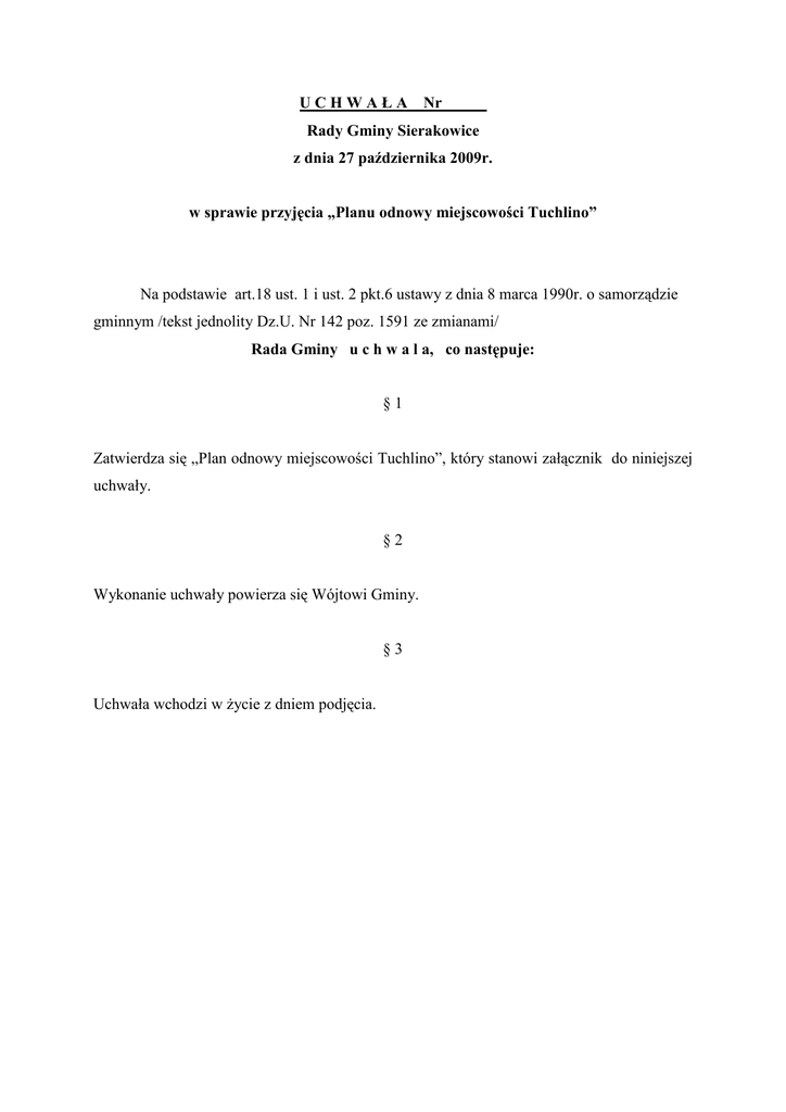 U C H W A Ł A Nr Rady Gminy Sierakowice z dnia 27 października 2009r. w sprawie przyjęcia „Planu odnowy miejscowości Tuchlino” Na podstawie art.18 ust. 1 i ust. 2 pkt.6 ustawy z dnia 8 marca 1990r. o samorządzie gminnym /tekst jednolity Dz.U. Nr 142 poz. 1591 ze zmianami/ Rada Gminy u c h w a l a, co następuje: §1 Zatwierdza się „Plan odnowy miejscowości Tuchlino”, który stanowi załącznik do niniejszej uchwały. §2 Wykonanie uchwały powierza się Wójtowi Gminy. §3 Uchwała wchodzi w Ŝycie z dniem podjęcia. Plan odnowy wsi Tuchlino Województwo Pomorskie Powiat Kartuski Gmina Sierakowice Projekt jest współfinansowany ze środków Europejskiego Funduszu Rolnego na Rzecz Rozwoju Obszarów Wiejskich Tuchlino 2009 Spis treści: 1. Charakterystyka miejscowości: a) Położenie miejscowości b) Historia miejscowości c) Określenie przestrzennej struktury miejscowości 2. Inwentaryzacja zasobów służących odnowie miejscowości. 3. Ocena mocnych i słabych stron miejscowości, w której będzie realizowana operacja oraz analiza szans i potencjalnych zagrożeń. 4. Wykaz planowanych zadań inwestycyjnych i przedsięwzięć aktywizujących społeczność lokalną. 1. Charakterystyka miejscowości: 1. położenie miejscowości: Tuchlino (kasz. Tëchlëno) to wieś położona na Pojezierzu Kaszubskim, leżąca na południowy-zachód od Sierakowic, w dolinie rzeki Słupi, nad Jeziorem Tuchlińskim, przy drodze krajowej nr 214 (Łeba - Lębork - Sierakowice - Kościerzyna - Zblewo Skórcz - Warlubie). W chwili obecnej w Tuchlinie zameldowanych jest 580 mieszkańców (stan na 14 października 2009r.). Źródło „NAZWY MIEJSCOWOŚCI gminy Sierakowice”. Wieś jest siedzibą sołectwa Tuchlino, w którego skład wchodzą również następujące miejscowości: Tuchlinek (185 mieszkańców), Kujaty (132 mieszkańców), Karłowo (95 mieszkańców), Rębienica (83 mieszkańców) i Zarębisko (39 mieszkańców). Sołectwo Tuchlino jest drugim, co do obszaru sołectwem w gminie. Jego obszar wynosi 1432 ha. Pod względem liczby mieszkańców sołectwo zajmuje trzecie miejsce w gminie po Gowidlinie i Kamienicy Królewskiej i liczy 1114 mieszkańców (stan na 14 października 2009r.). W kierunku zachodnim od Tuchlina znajduje się Gowidliński Obszar Chronionego Krajobrazu, w kierunku wschodnim ma swoje źródło rzeka Słupia. Przez Tuchlino przebiega turystyczny Szlak Kręgów Kamiennych (Sierakowice – Tuchlino – Lipusz – Czarna Woda), kajakowy Szlak pradoliny Słupi i 7 jezior oraz Trakt Konny im. Daniela Chodowieckiego. Znajduje się tu również Kościół rzymskokatolicki pw. Św. Apostołów Piotra i Pawła, jednostka Ochotniczej Straży Pożarnej, Zespół Szkół (Szkoła Podstawowa i Gimnazjum), kwatery agroturystyczne, gościniec i domki letniskowe. W okolicach Tuchlina znajdują się również punkty widokowe. 2. Historia miejscowości: Tuchlino jest najwcześniej notowaną w źródłach wsią z obszaru obecnej gminy Sierakowice. Pierwsze informacje o niej przynosi dokument komtura gdańskiego Kirsilie von Kindswulie, wystawiony 26 listopada 1354 r. w obecności Krzyżaków z konwentu gdańskiego i czterech pomorskich rycerzy, sprawujących urząd włodarza. Dokument skierowany był do Jana, syna Wernika (Johanni Wernikonis), posiadacza czwartej części wsi Linia. Jan odstąpił swoją własność Zakonowi, otrzymując w zamian Tuchlino. Ten nowy majątek posiadać miał dziedzicznie na prawie rycerskim, według tych samych zasad, na jakich dzierżyli swe majątki inni poddani Zakonowi rycerze pomorscy. Przywilej z 1354 r. nie zawiera określenia wielkości obszaru Tuchlina. Nie ma też w tym akcie informacji o dokonanym pomiarze gruntów, ani o dokładnym wytyczeniu granic majątku. Jest tam tylko wzmianka, że Jan Wernikowic ma posiadać nadane dobra w dawnych granicach. Oznacza to, że wprowadzenie w Tuchlinie nowego stanu prawno-własnościowego nie pociągnęło za sobą żadnych uregulowań przestrzennych. Rejestr poboru łanowego z 1570 r. notuje obecność w Tuchlinie młyna (istniał on do połowy XX wieku). Tuchlino było jedynym majątkiem rycerskim w okolicy, o którym wiadomo, Ŝe w czasach krzyŜackich posiadało karczmę. W XVII oraz XVIII wieku Tuchlino notowane było jako wieś szlachecka. NaleŜało ono w tym okresie do wielu właścicieli między innymi do Wojciecha Tuchlińskiego, Wojciecha Dułaka czy teŜ do Fryderyka von Marwitza. W tym okresie odnotowuje się istnienie nad rzeką Słupią dwukołowego młyna. Wiek XIX to okres uwłaszczeń i parcelacji dóbr. W okresie międzywojennym odnotowuje się istnienie sołectwa Tuchlino. Sołtysami w tym okresie byli między innymi Migowski Jan, Stencel Leon, Breza Jan. Okres II Wojny Światowej to czas, w którym w wyniku działań wojennych zginęło 6 mieszkańców Tuchlina a 70 zostało przymusowo wysiedlonych. W okresie powojennym sołectwo Tuchlino naleŜało do Gromady Puzdrowo a w roku 1972 w wyniku reformy administracyjnej znalazło się w obszarze Gminy Sierakowice. W tym okresie we wsi Tuchlino istniał Kółko Rolnicze. Sołectwo Tuchlino w niezmienionym stanie istnieje do dzisiaj. 3. Określenie przestrzennej struktury miejscowości: Zabudowa mieszkaniowa, usługi, kościół, zespół szkół skoncentrowane są wzdłuż sześciu dróg: drogi krajowej nr 214, drogi powiatowej nr 1934G (Sierakowice – Sulęczyno – Lipusz) oraz dróg gminnych: nr 152022G (Tuchlino – Janowo – Sierakowice), nr 152024G (Tuchlino – Tuchlinek – Jelonko - Szklana), nr 152026G (Tuchlino – Kujaty – Klukowa Huta), nr 152015G (Tuchlino – Rębienica - Gowidlino) . Punktem centralnym miejscowości jest kościół. Tuchlino nie posiada otwartych przestrzeni typu rynek czy plac targowy. Jedynym miejscem o dużej powierzchni, które mogłoby posłużyć jako miejsce zgromadzeń jest kompleks boisk sportowych przy Zespole Szkół. Charakterystycznym elementem zabudowy Tuchlina są budynki z dachami d